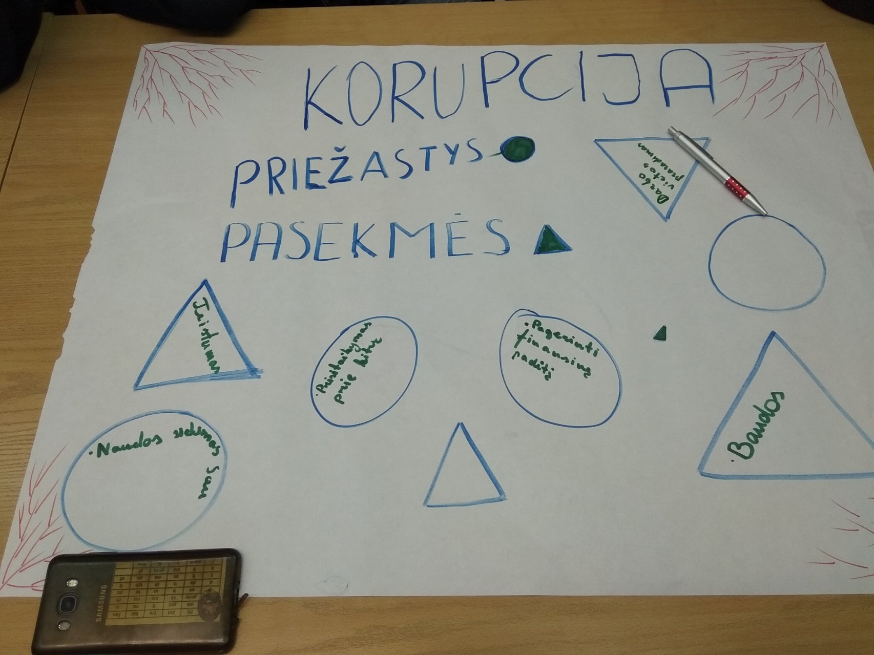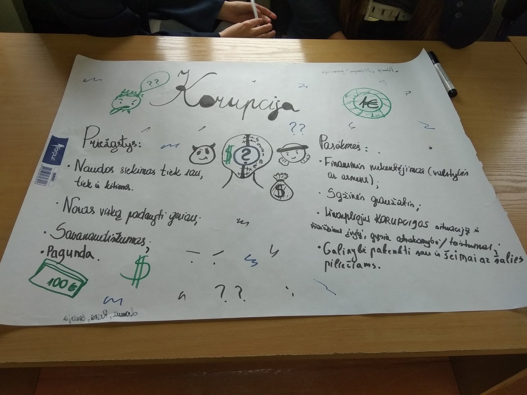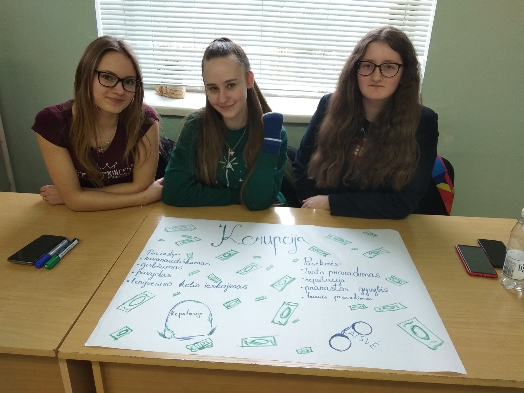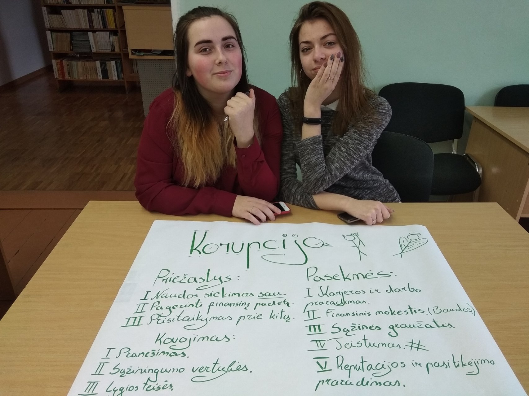 Pirmieji mokymai vyko kovo 14 d. gimnazijos bibliotekoje, kur Šiaulių universiteto Viešojo administravimo katedros lektorė Rita Toleikienė supažindino gimnazistų būrelį su korupcijos samprata, išaiškino jos priežastis ir pasekmes. Buvo diskutuota apie galimos korupcijos atvejus, ieškota išeičių, supratus, kad ji vyksta, kalbėta ir apie tai, ką daryti, norint sustabdyti plintantį blogį.