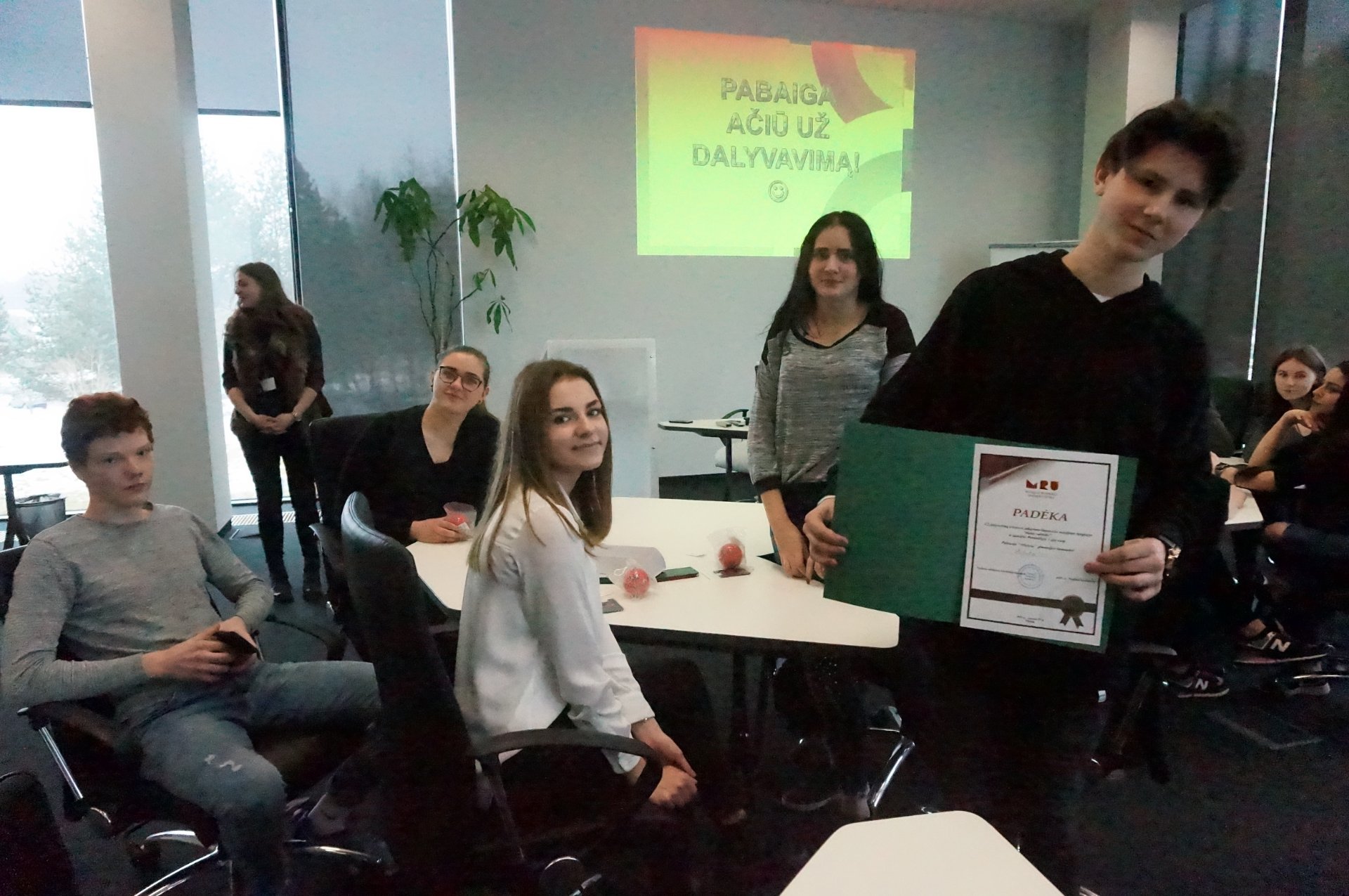 Kovo 13 d. grupelė mūsų mokinių kartu su geografijos mokytoja Gintare Vatiekūniene ir psichologe Inga Jankauskienė vyko į Vilniuje Mykolo Romerio universitete organizuojamą renginį, skirtą Lietuvos valstybės atkūrimo šimtmečiui paminėti. Gimnazistai susipažino su šimtmečio istoriniais, politiniais ir kultūriniais viešojo valdymo Lietuvoje veiksniais, dalyvavo protmūšyje, bendravo su studentais, lankėsi įvairiose universiteto auditorijose, bibliotekoje, plačiau sužinojo apie studijų galimybes MRU, studentų gyvenimo ypatumus ir laisvalaikį.