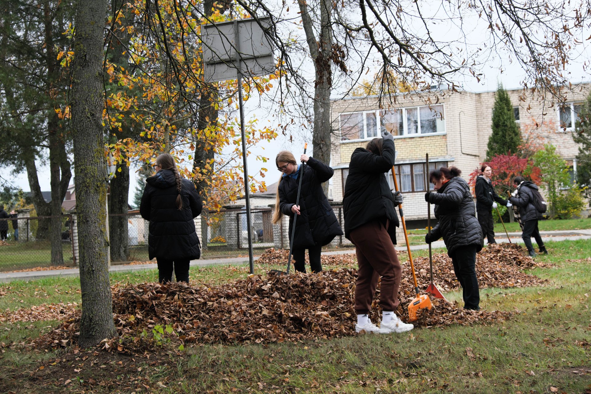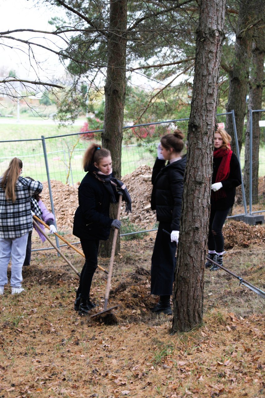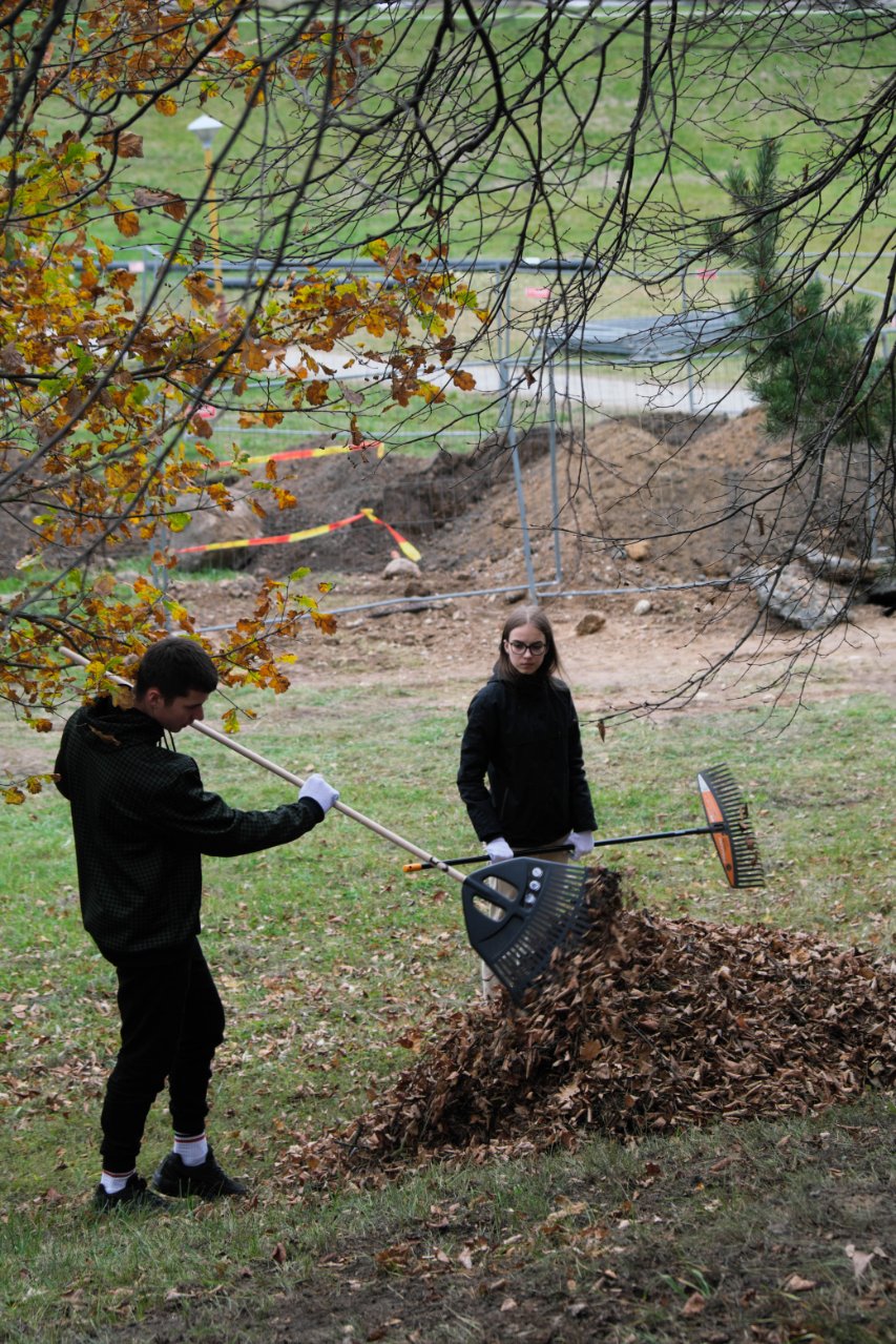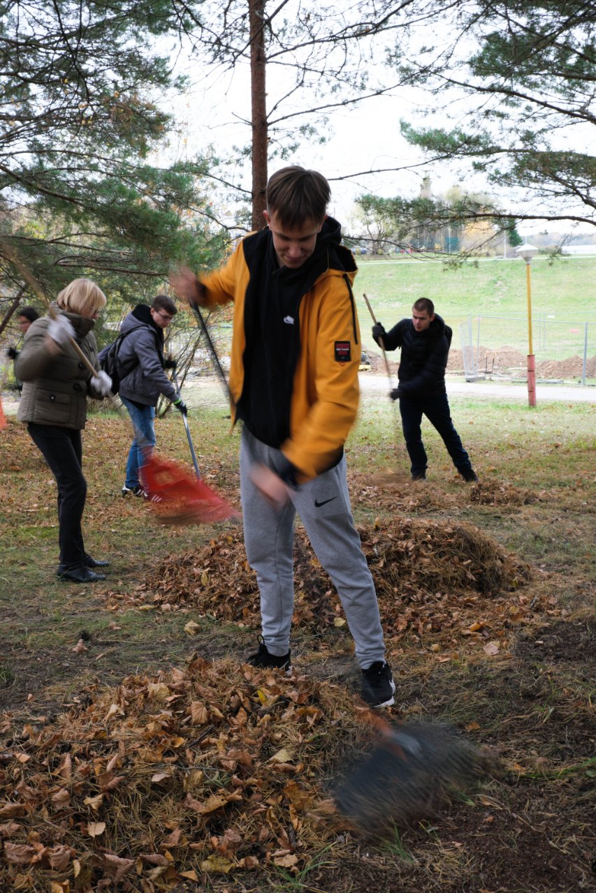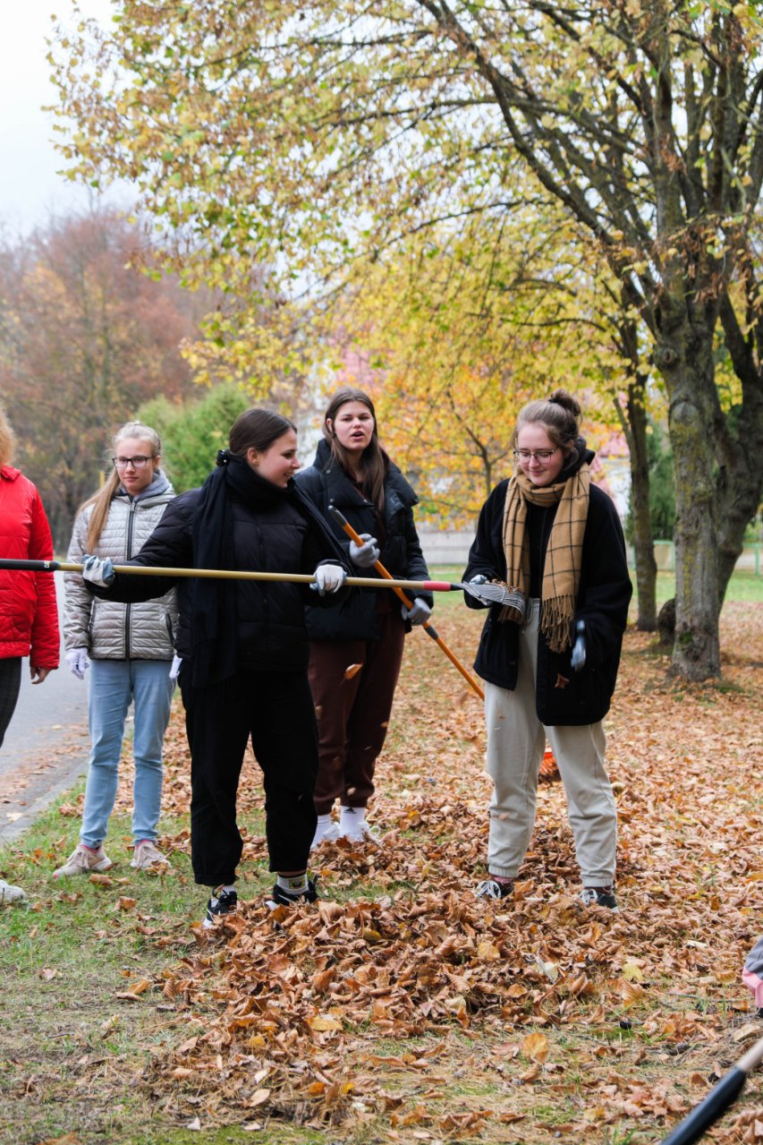Penktadienio popietę muzikos garsai viliojo išeiti į lauką, o kad greičiau gautume pasmaguriauti gardžių blynų, turėjome visi kartu susitelkti ir smagiai padirbėti. Gimnazijos bendruomenė ir šį sykį uoliai darbavosi grėbdama lapus: vieni gražino gimnazijos sodą, o kiti švarino už tvoros esančią teritoriją. Visi plušėjo iš peties. Buvo gražu žiūrėti, kaip jauni žmonės švytruoja grėbliais, dirbdami šnekučiuojasi, rikiuoja kupinus lapų maišus. Gera visiems kartu pajusti bendrystę! Ech, tas ruduo, maloniai vėsu ir nuo užsidegusios klevo viršūnės tyliai leidžiasi auksiniai lapai... Nepaprastai mielas reginys... Bet pasidžiaugėme ir reikia susitvarkyti. Tokia gyvenimo proza.