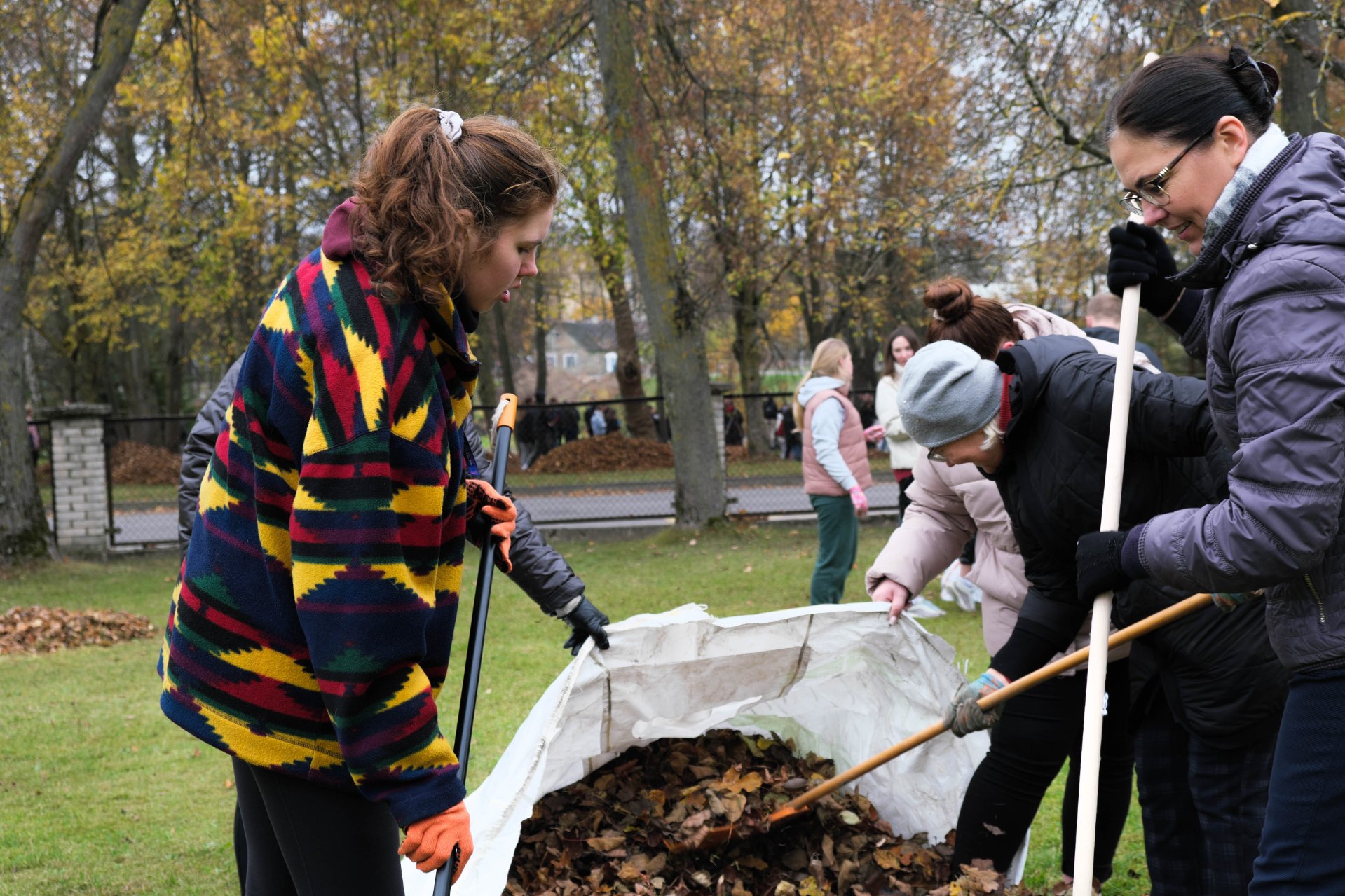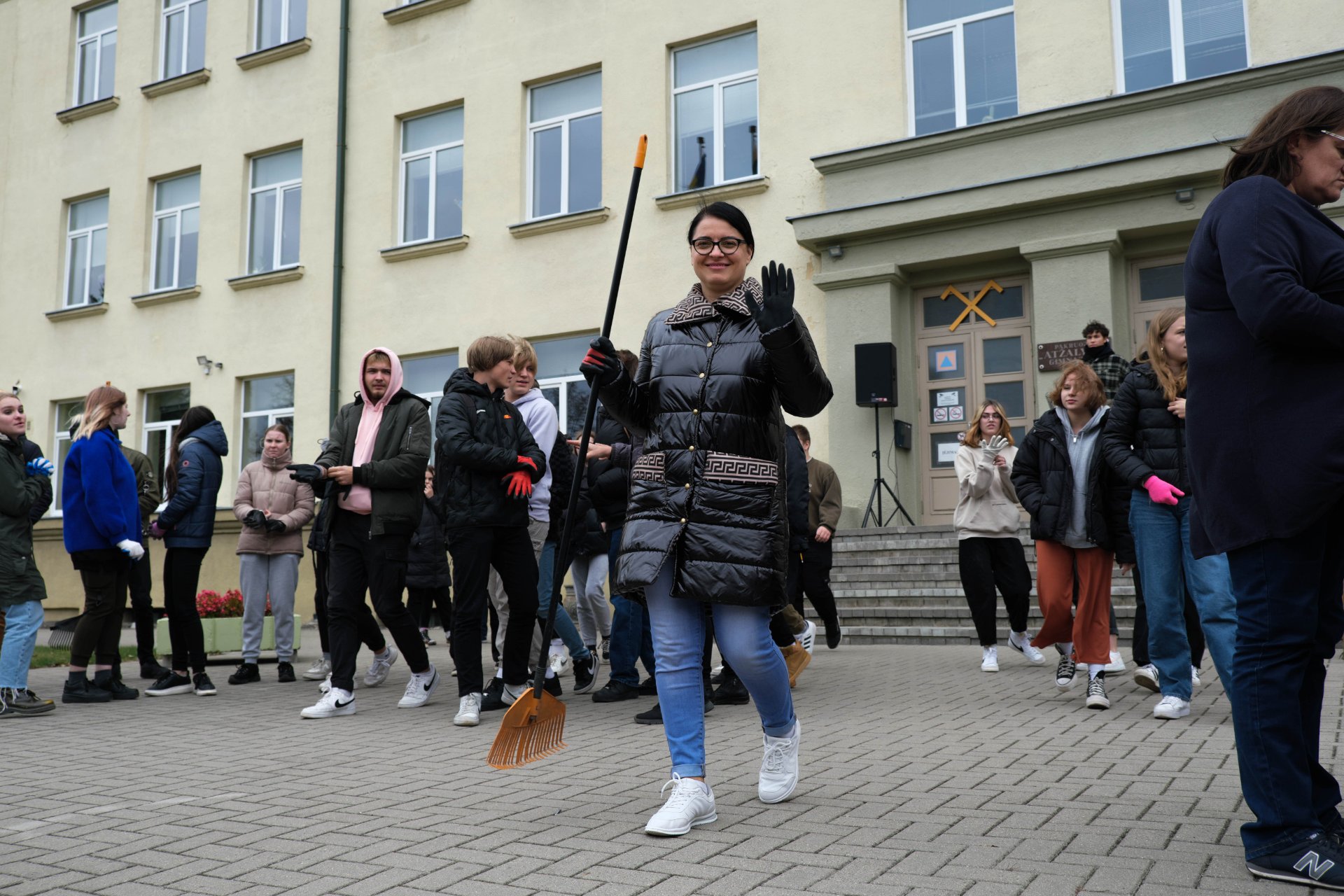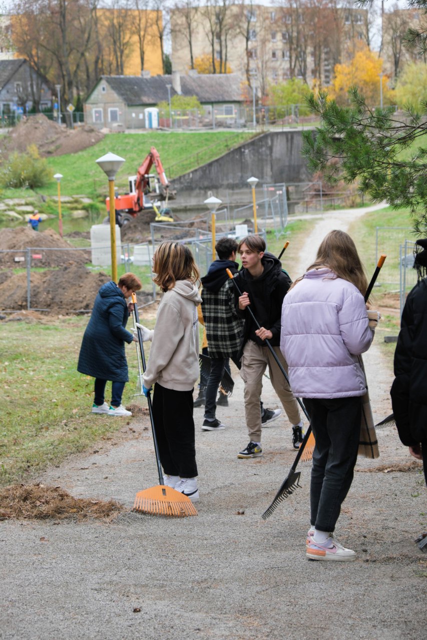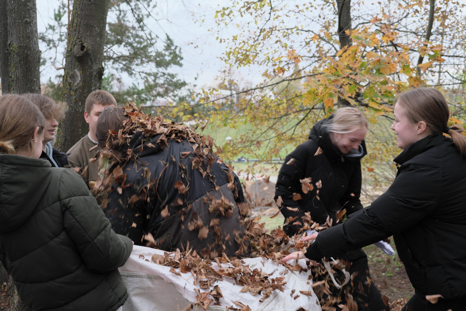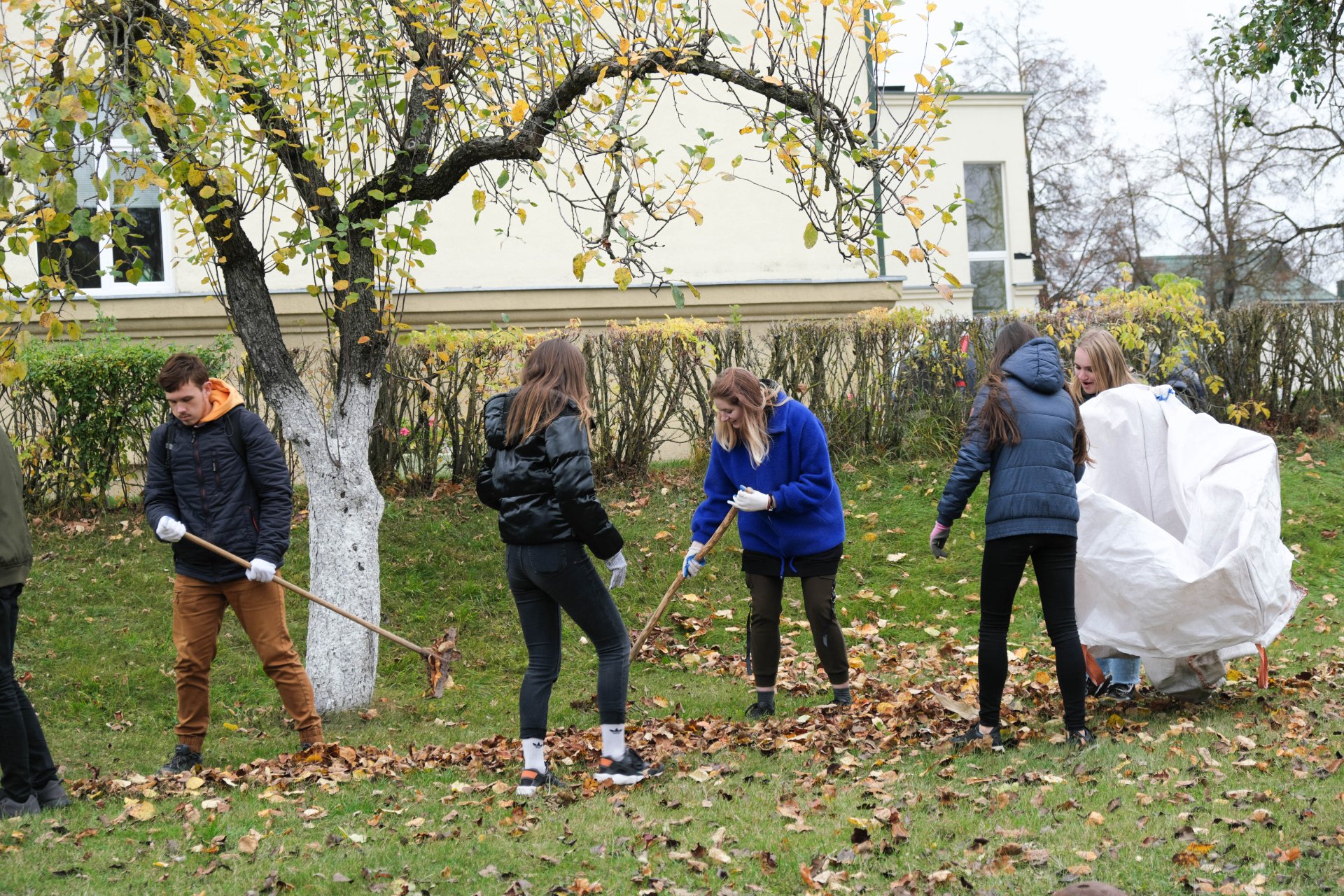 Penktadienio popietę muzikos garsai viliojo išeiti į lauką, o kad greičiau gautume pasmaguriauti gardžių blynų, turėjome visi kartu susitelkti ir smagiai padirbėti. Gimnazijos bendruomenė ir šį sykį uoliai darbavosi grėbdama lapus: vieni gražino gimnazijos sodą, o kiti švarino už tvoros esančią teritoriją. Visi plušėjo iš peties. Buvo gražu žiūrėti, kaip jauni žmonės švytruoja grėbliais, dirbdami šnekučiuojasi, rikiuoja kupinus lapų maišus. Gera visiems kartu pajusti bendrystę! Ech, tas ruduo, maloniai vėsu ir nuo užsidegusios klevo viršūnės tyliai leidžiasi auksiniai lapai... Nepaprastai mielas reginys... Bet pasidžiaugėme ir reikia susitvarkyti. Tokia gyvenimo proza.