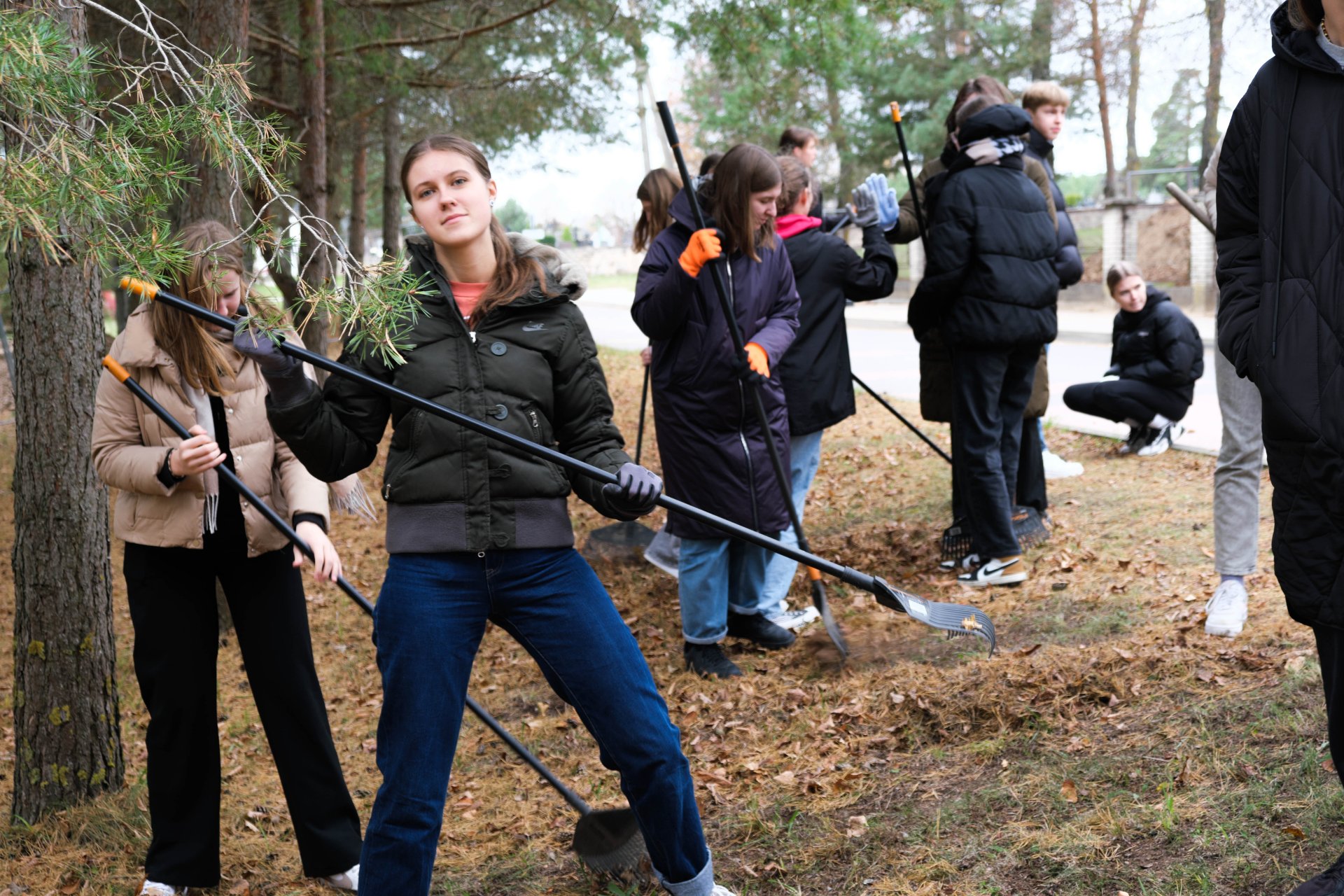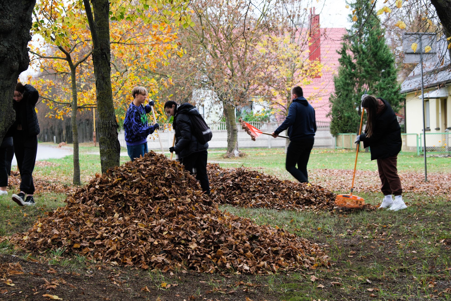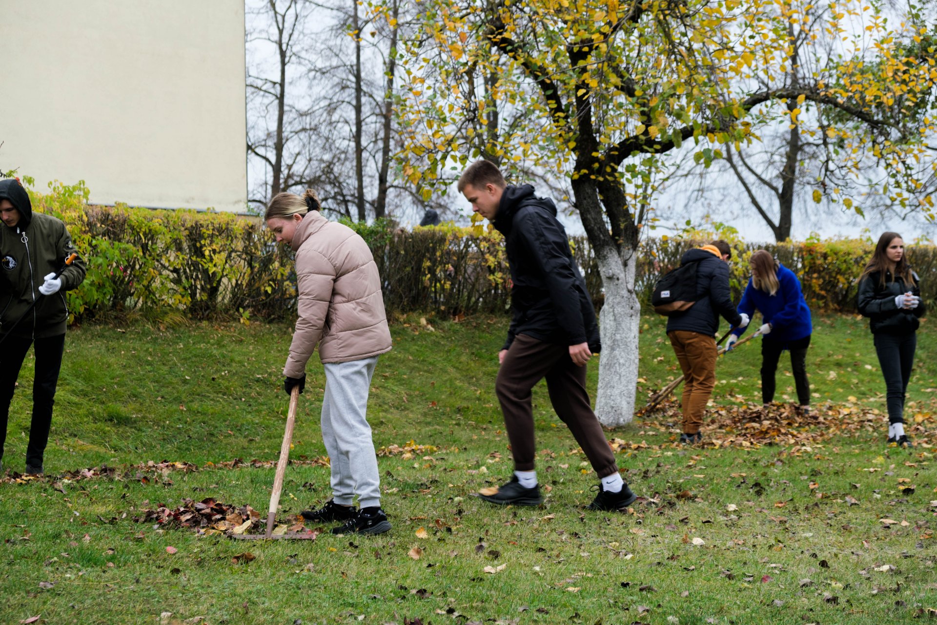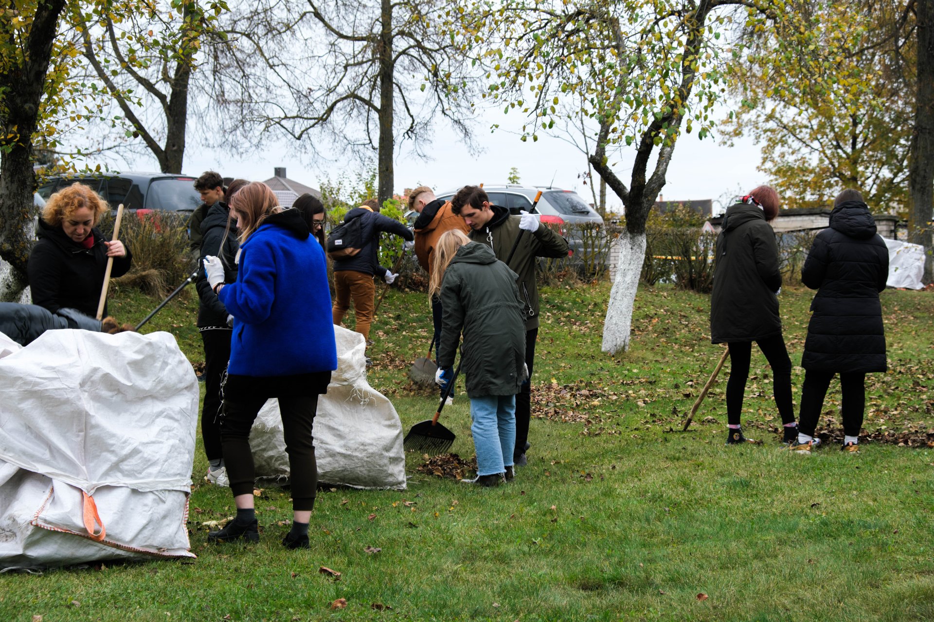 Penktadienio popietę muzikos garsai viliojo išeiti į lauką, o kad greičiau gautume pasmaguriauti gardžių blynų, turėjome visi kartu susitelkti ir smagiai padirbėti. Gimnazijos bendruomenė ir šį sykį uoliai darbavosi grėbdama lapus: vieni gražino gimnazijos sodą, o kiti švarino už tvoros esančią teritoriją. Visi plušėjo iš peties. Buvo gražu žiūrėti, kaip jauni žmonės švytruoja grėbliais, dirbdami šnekučiuojasi, rikiuoja kupinus lapų maišus. Gera visiems kartu pajusti bendrystę! Ech, tas ruduo, maloniai vėsu ir nuo užsidegusios klevo viršūnės tyliai leidžiasi auksiniai lapai... Nepaprastai mielas reginys... Bet pasidžiaugėme ir reikia susitvarkyti. Tokia gyvenimo proza.