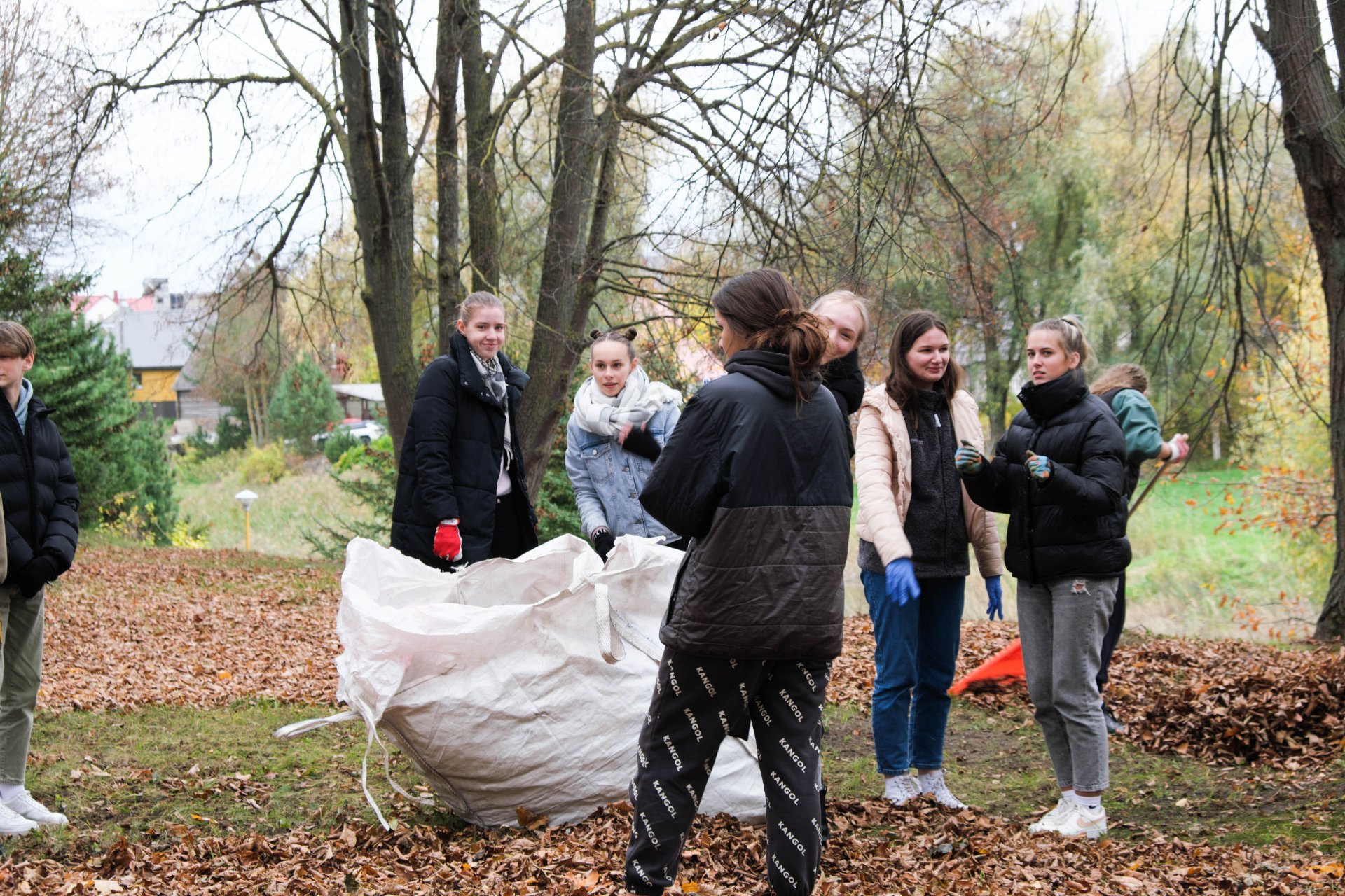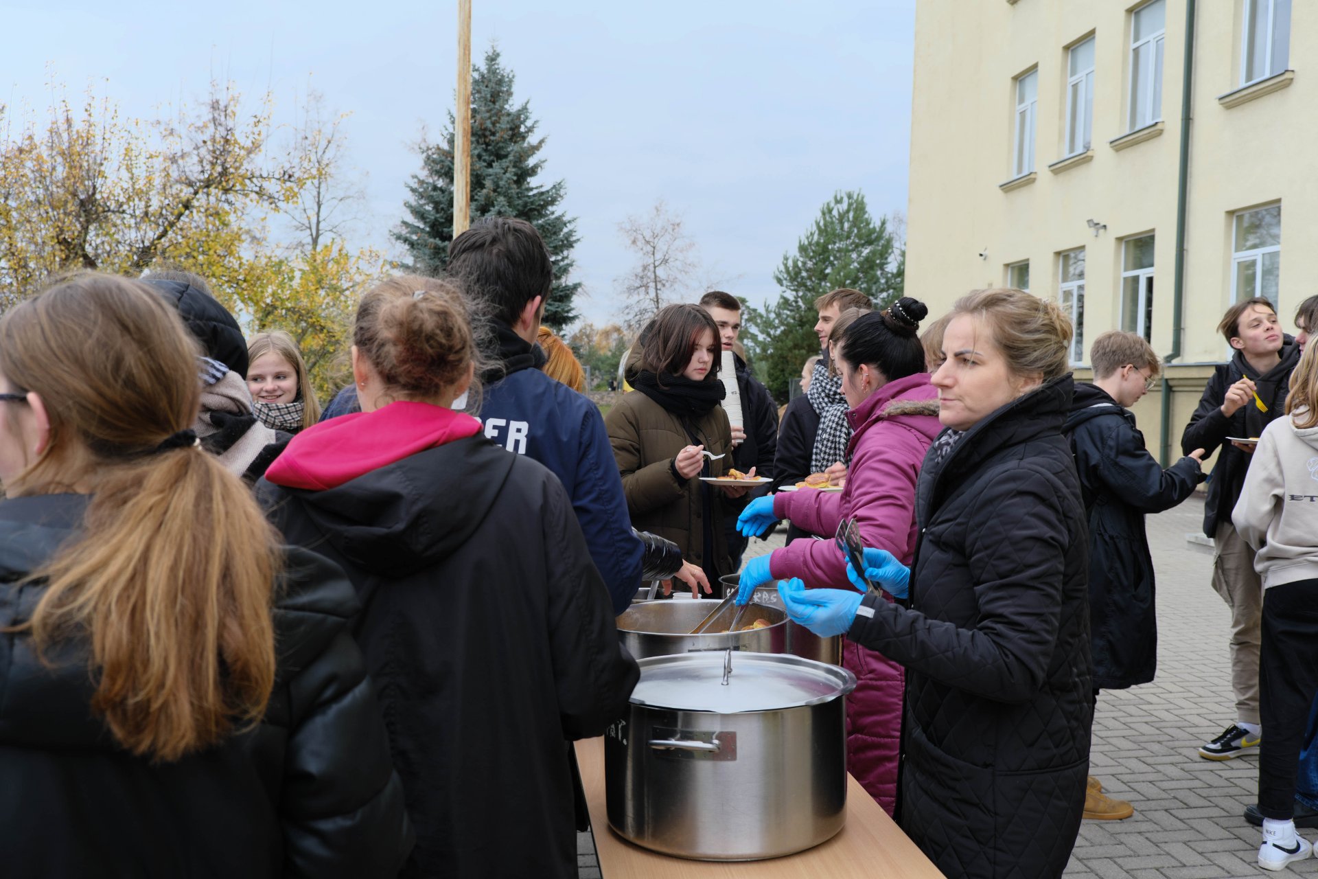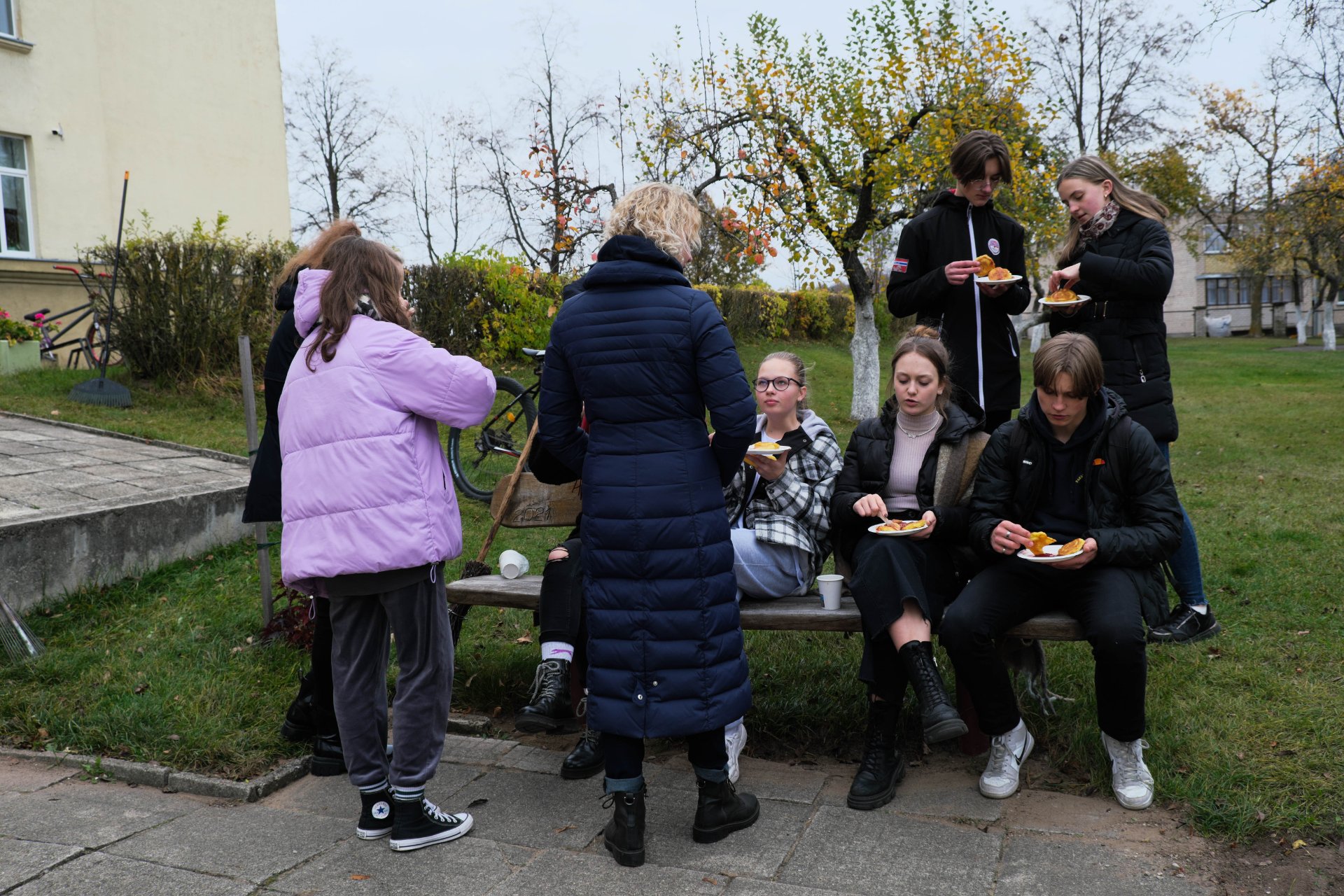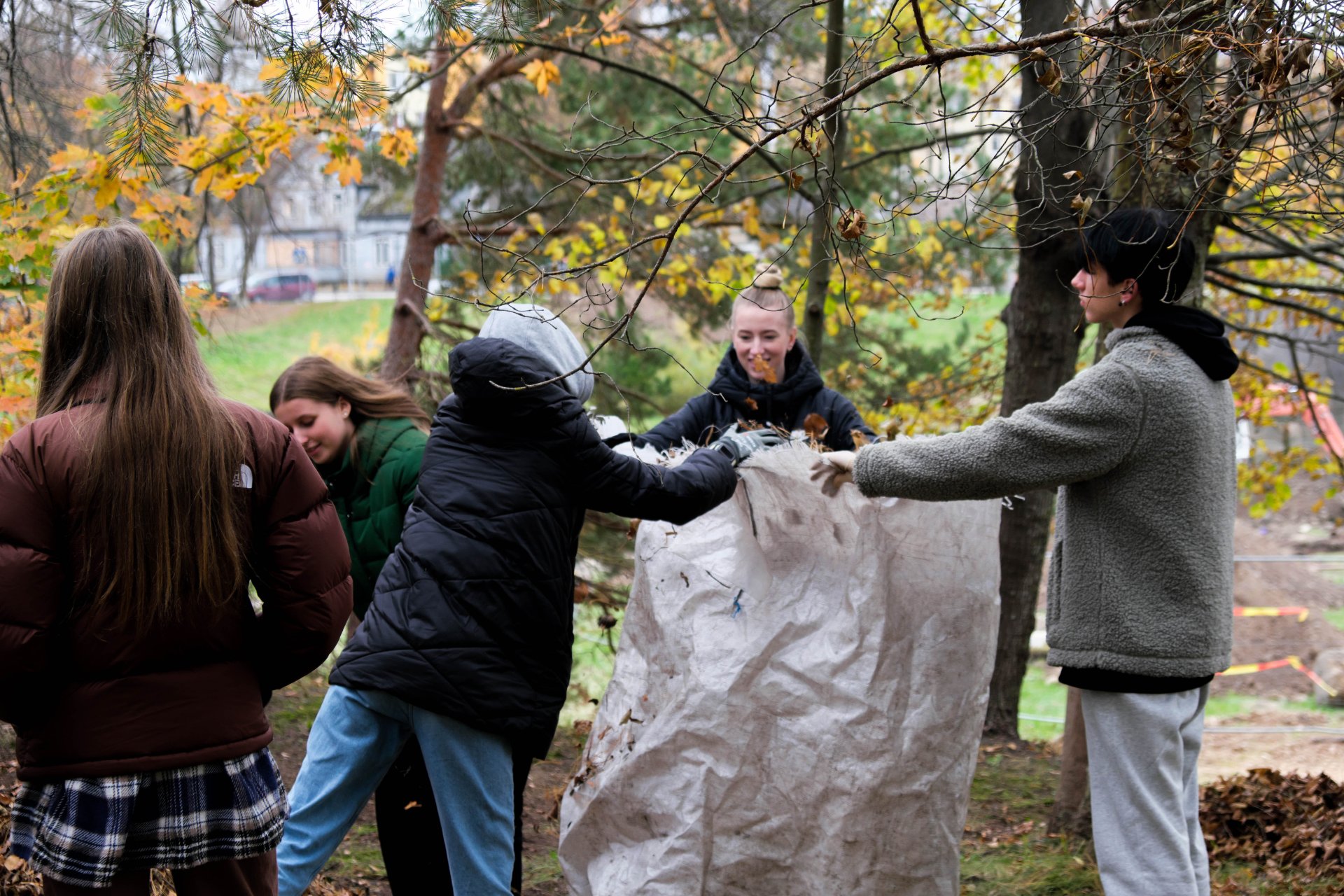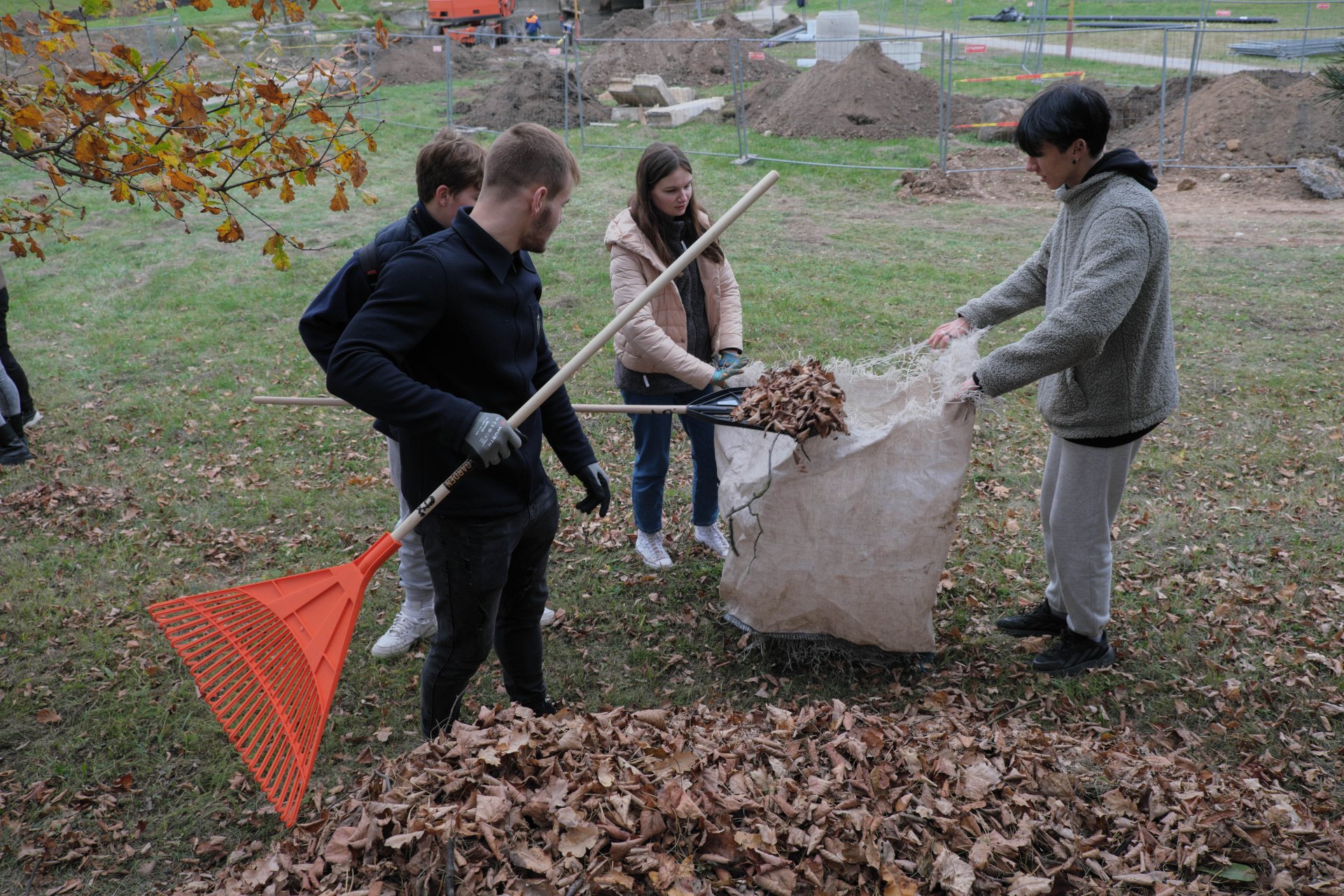 Penktadienio popietę muzikos garsai viliojo išeiti į lauką, o kad greičiau gautume pasmaguriauti gardžių blynų, turėjome visi kartu susitelkti ir smagiai padirbėti. Gimnazijos bendruomenė ir šį sykį uoliai darbavosi grėbdama lapus: vieni gražino gimnazijos sodą, o kiti švarino už tvoros esančią teritoriją. Visi plušėjo iš peties. Buvo gražu žiūrėti, kaip jauni žmonės švytruoja grėbliais, dirbdami šnekučiuojasi, rikiuoja kupinus lapų maišus. Gera visiems kartu pajusti bendrystę! Ech, tas ruduo, maloniai vėsu ir nuo užsidegusios klevo viršūnės tyliai leidžiasi auksiniai lapai... Nepaprastai mielas reginys... Bet pasidžiaugėme ir reikia susitvarkyti. Tokia gyvenimo proza.