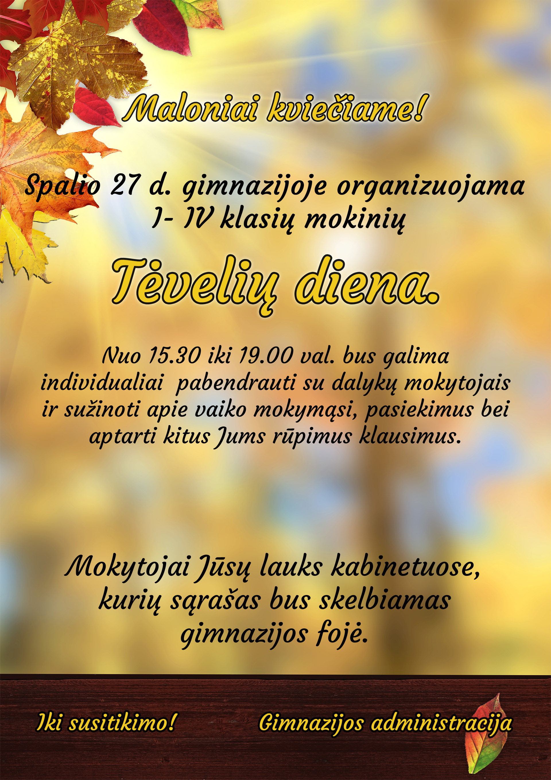Spalio 28-ąją gimnazijoje vyko savivaldos diena – abiturientai tapo mokytojais bei kitais gimnazijos darbuotojais. Nuo pat ankstaus ryto vyko rimtas darbas klasėse. Tuo metu tikrieji mokytojai ne tik budėjo koridoriuose, bet laisvu laiku galėjo išgerti kavos ar arbatos, paragauti skanių gardėsių ir pabendrauti. Po 7 pamokų ketvirtokai ir mokytojai susirinko konferencijų ir posėdžių salėje aptarti dienos įspūdžių. Abiturientai pasakojo, kad buvo sunku ruoštis ir sugalvoti idėjų, kad pamokos vyktų kuo originaliau. Sunkumų sukėlė ir bandymas išaiškinti dėstomą dalyką, dvyliktokai suprato, kad kiekvienas mokinys informaciją įsisavina skirtingai, tad ir mokymo metodai turi būti įvairūs. Galėjome pasidžiaugti, kad pamokose mokiniai įdėmiai klausė, noriai įsitraukė į veiklas bei jautėsi laisvai, todėl nebijojo reikšti savo minčių. Ši diena padėjo pažvelgti į mokytojo profesiją iš šiek tiek kitokios perspektyvos. Smagu, kad viena abiturientė yra pasiryžusi ateityje tapti mokytoja.