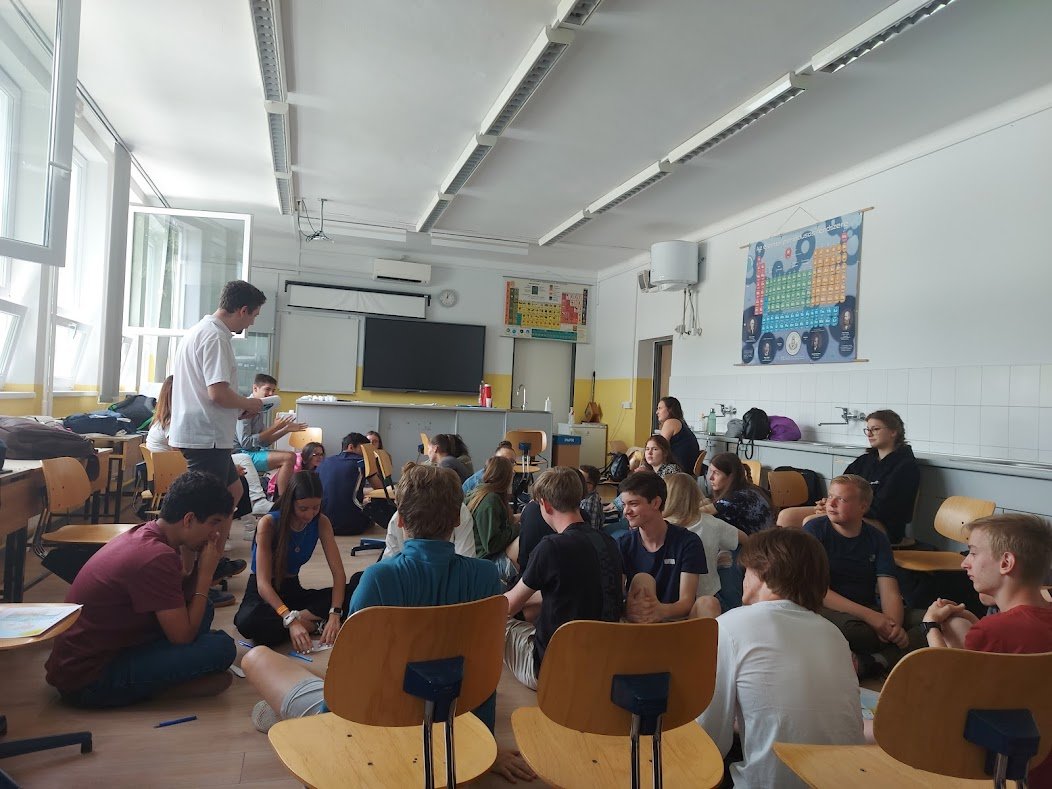 Dvi dienas dalyvavome užsiėmimuose mokykloje. Pavyzdžiui, klausėmės paskaitos apie Darvino teoriją. Buvo ir fizinio ugdymo pamoka: pasirinktinai žaidėme krepšinį, žolės riedulį, futbolą, badmintoną.