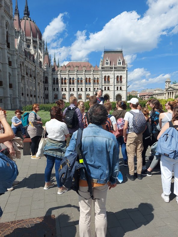 Susipažinimas su Budapeštu vyko žaidžiant orientacinį žaidimą tarptautinėse grupėse. Gavome užduočių lapą ir turėjome surasti įvairius miestui reikšmingus pastatus, skulptūras, monumentus. Kad pasiektume šias vietas, turėjome važiuoti įvairiomis transporto priemonėmis: metro ir autobusais. Be kita ko, reikėjo atlikti ir įvairias užduotis, pavyzdžiui, išsiaiškinti pastato aukštį ar jo istoriją, padeklamuoti vengrišką eilėraštį, padainuoti. Sužinojome, kad Vengrijos parlamentas yra 96 metrų aukščio, Šv. Josifo bazilika yra antras aukščiausias pastatas Vengrijoje, Herojų aikštėje yra pavaizduotos 26 istorinės figūros.