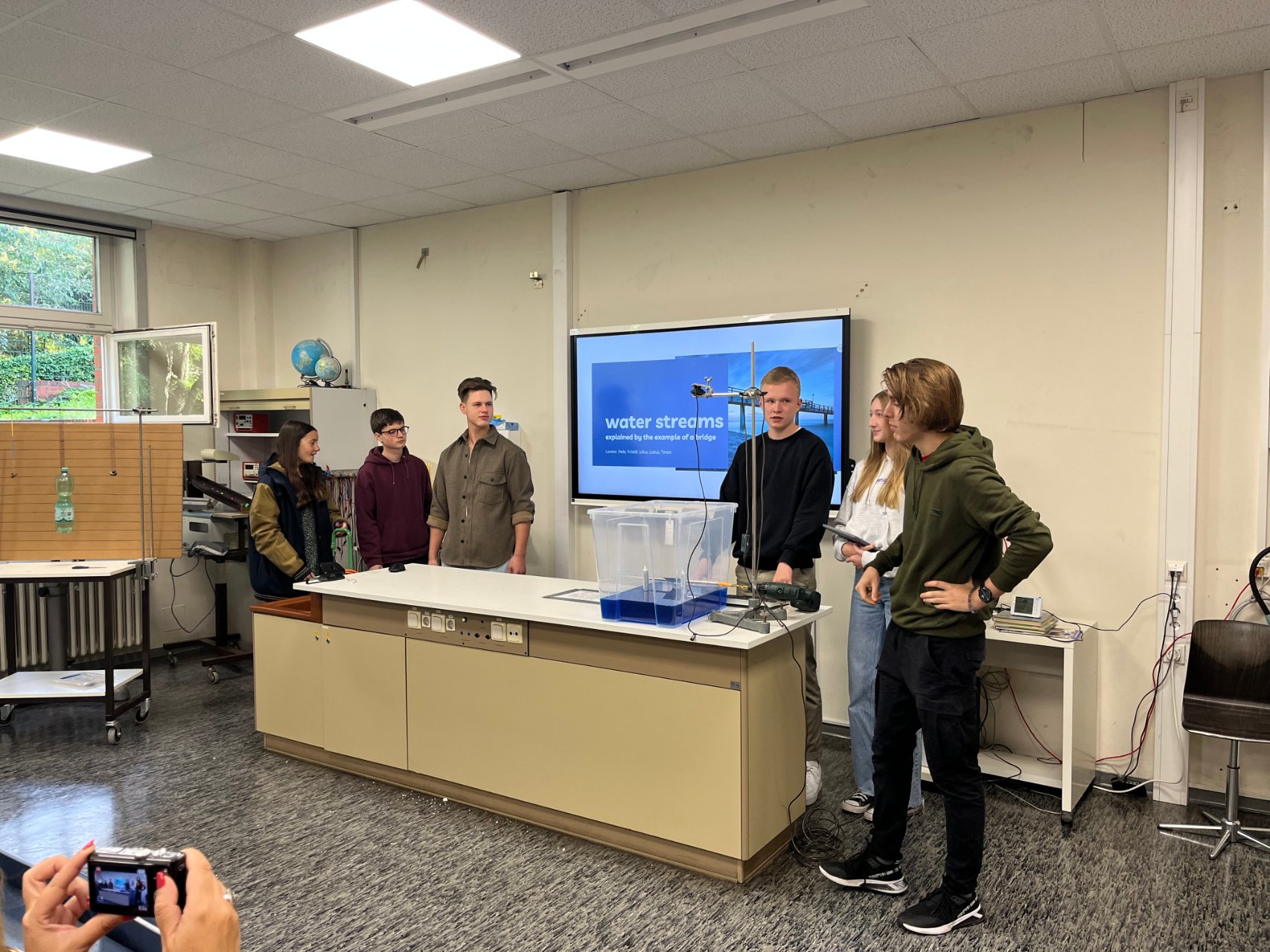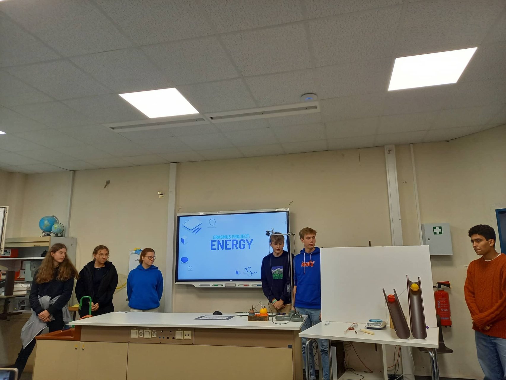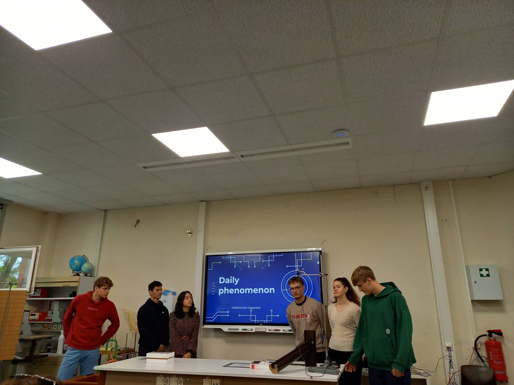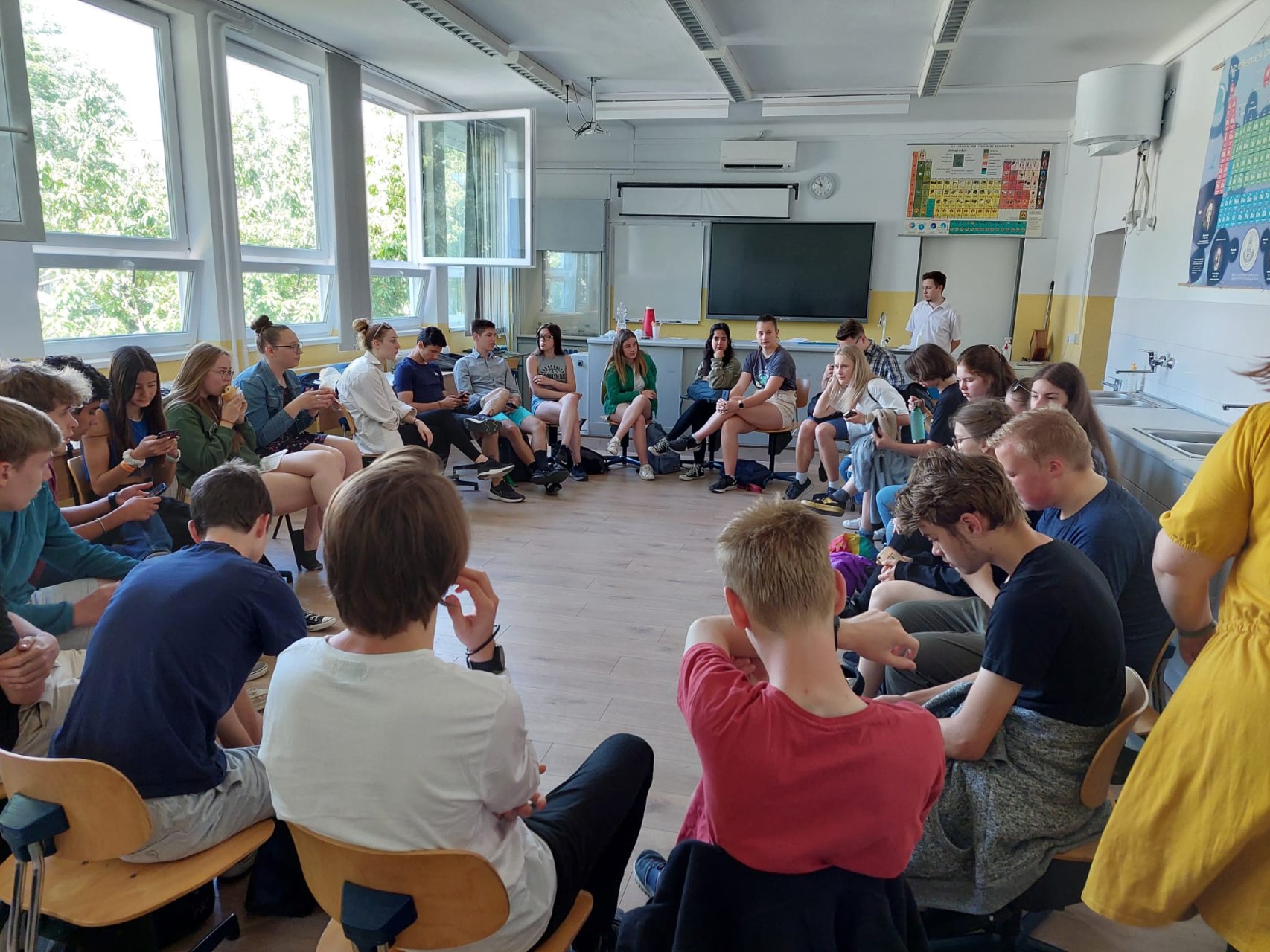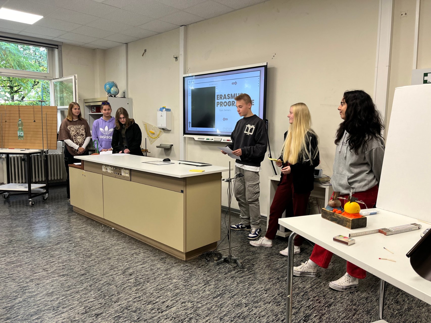 Savaitę trukusių mokinių grupių mainų veiklos „Atrask ir tyrinėk pasitelkdamas gamtos mokslus: kasdieniniai ir gamtos reiškiniai“ vyko grupėse Johann Heinrich Voss mokykloje Eutin mieste. Tyrinėjome pasirinktus su gamtos mokslais susijusius reiškinius. Mes buvome suskirstyti į 4 grupes, kurių kiekvieną sudarė mokiniai iš visų 4 dalyvavusių šalių. Komandos gavo po didelę dėžę įvairių daiktų. Naudodamiesi jais, turėjome paruošti pristatymą apie kokį nors kasdienį reiškinį iš gamtos mokslų pusės. Grupės pristatė energijos formas ir jų virsmus, vandens verpetų susidarymą upėse, šokinėjimo su guma nuo tilto fizikinius ir cheminius procesus bei saulės baterijas.