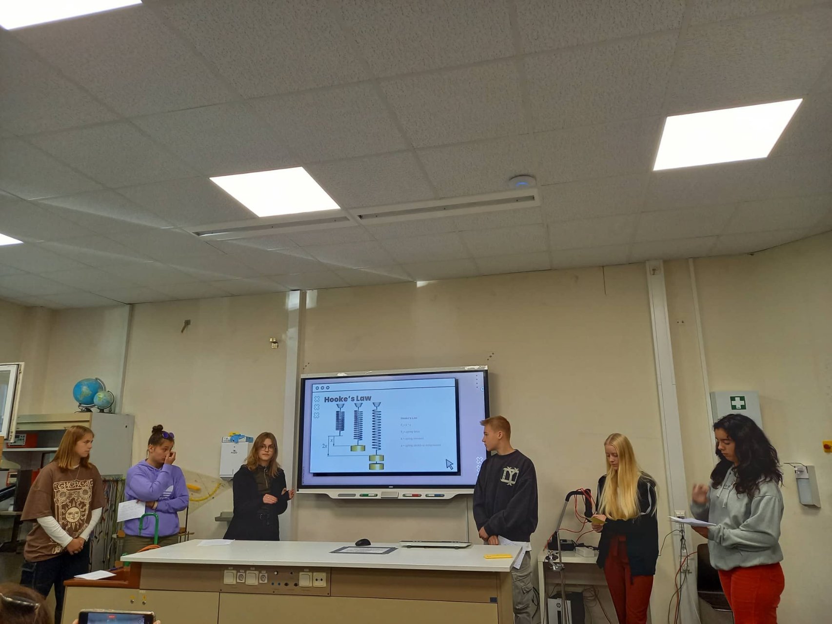 Susipažinome su Vengrijos mokykla, kitų šalių projekto dalyviais ir pristatėme savo ruoštus darbus. Pirmiausia kiekvienos šalies mokiniai turėjo pristatyti savo atliktą gamtamokslinį projektą, susietą su pasirinku filmu. Vengrai ir portugalai papasakojo apie savo veiklas, kurias įkvėpė filmas „Marsietis“, vokiečiai - pagal filmą „Gataka“. Vengrai dar parodė ir kelis eksperimentus, pavyzdžiui, kaip pasigaminti slankiojo smėlio atitikmenį iš krakmolo. Mes pristatėme veiklas, susietas su epizodu iš filmo „Žmogus voras 2“, parodydami vaizdo įrašą, kuriame iliustruojami užsiėmimai, kuriuose dalyvavome. Vėliau apie visa tai plačiau paaiškinome rodydami pateiktis. Po vykusios refleksijos pastebėjome, kad bendraamžiai liko sužavėti mūsų pristatymo.