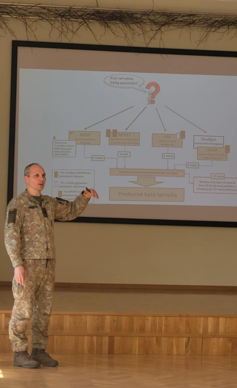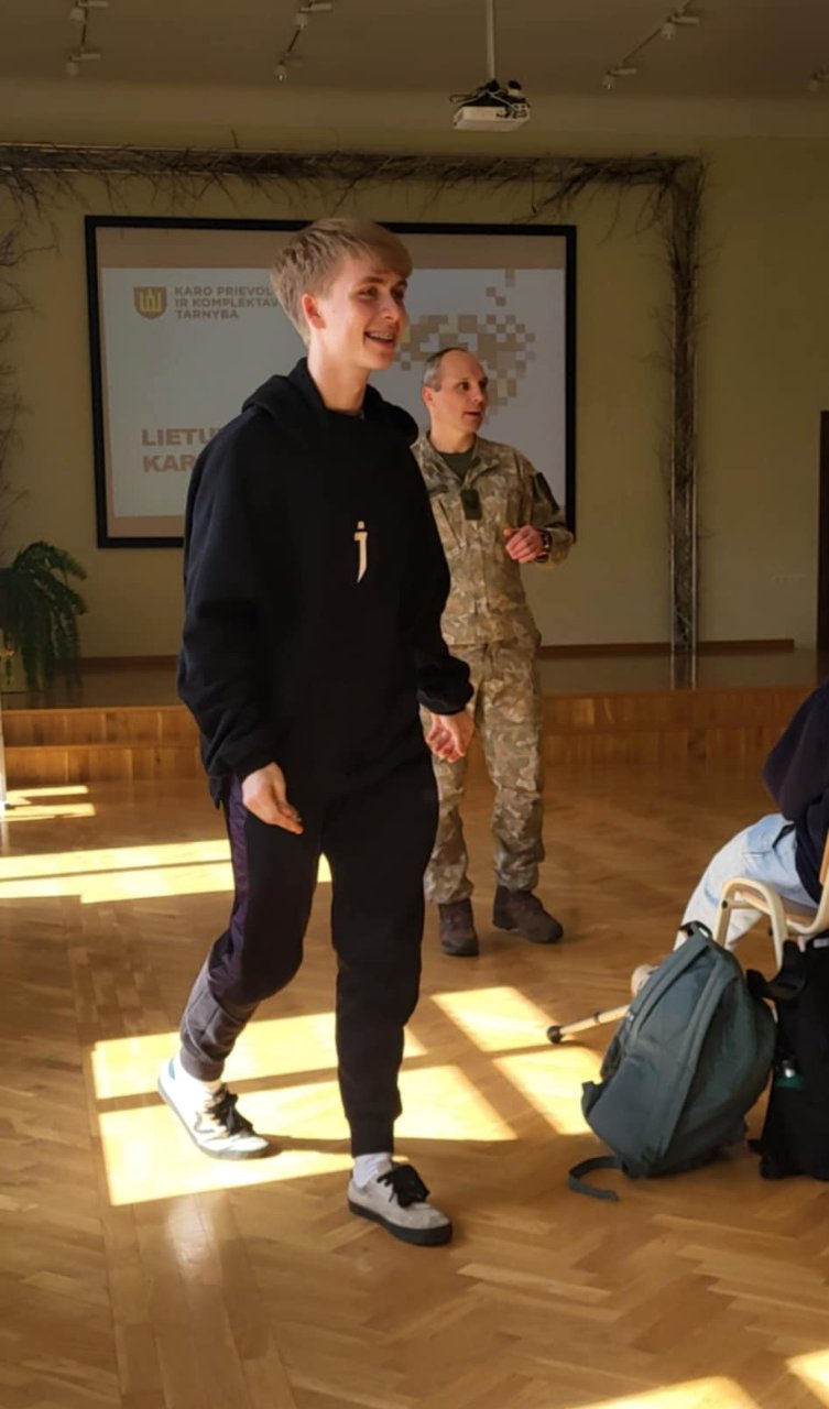 Balandžio 10 d. gimnazijos posėdžių ir konferencijų salėje III klasės mokiniai susitiko su Šiaulių regioninio Karo prievolės ir komplektavimo skyriaus seržantu Arūnu Navickiu. Svečias gimnazistams pristatė savanoriškos karo tarnybos svarbą, galimybes ją atlikti bei skirtingus būdus prisidėti prie Lietuvos gynybos. Taip pat kalbėta apie tai, kaip reikėtų elgtis karo atveju ir kokie pasiruošimai yra būtini dar taikos metu. Susitikimas buvo ne tik informatyvus, bet ir skatinantis sąmoningumą bei pilietiškumą.