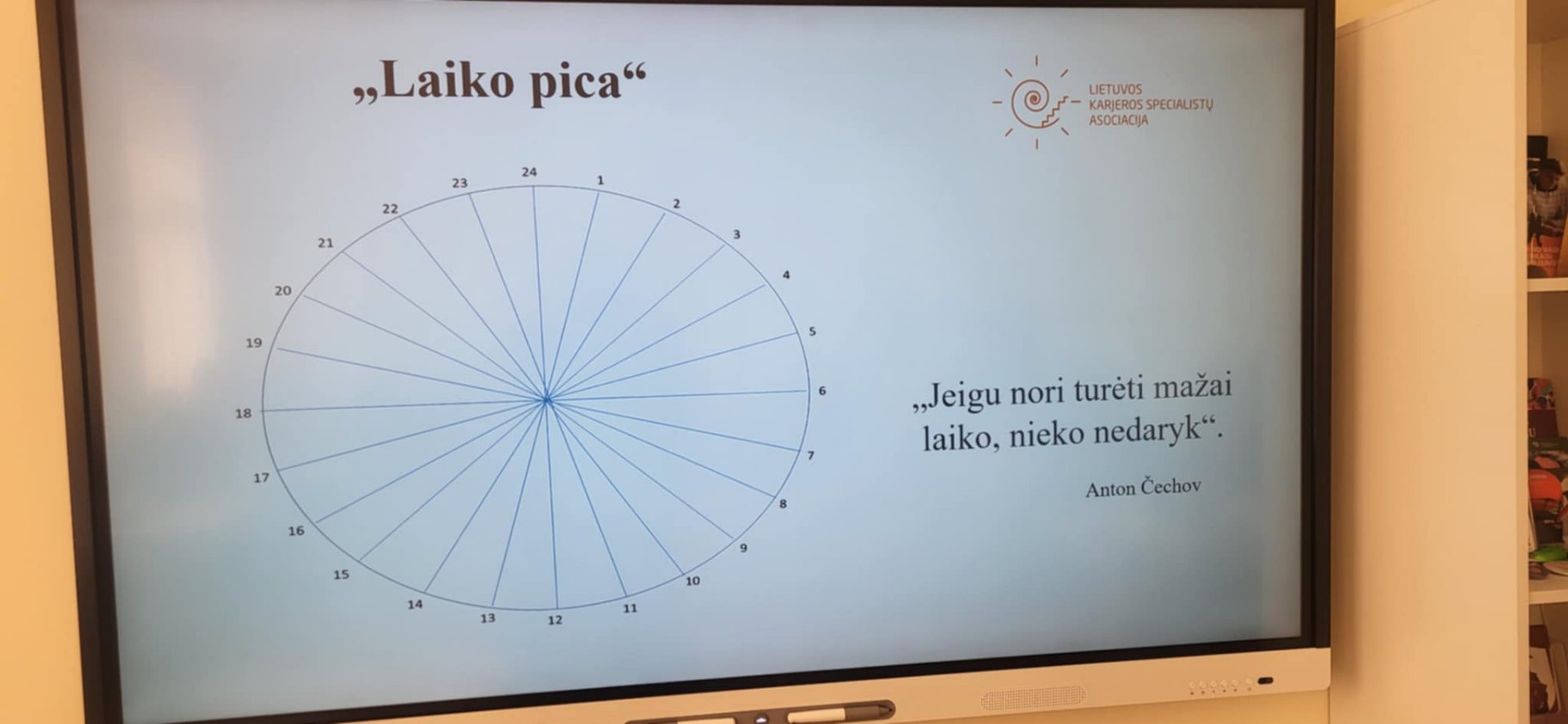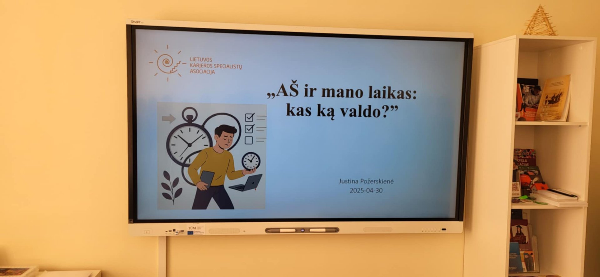 Justina Požerskienė pristatė temą „Aš ir mano laikas: kas ką valdo?“ Lektorė pabrėžė savęs pažinimo svarbą, norint efektyviai ir produktyviai planuoti laiką. Mokiniai atliko kūrybinę užduotį „Laiko pica“ ir įsivertino, kaip iš tiesų leidžia savo laiką ir kokių pokyčių galėtų imtis, kad kasdienės veiklos taptų tikslingesnės.