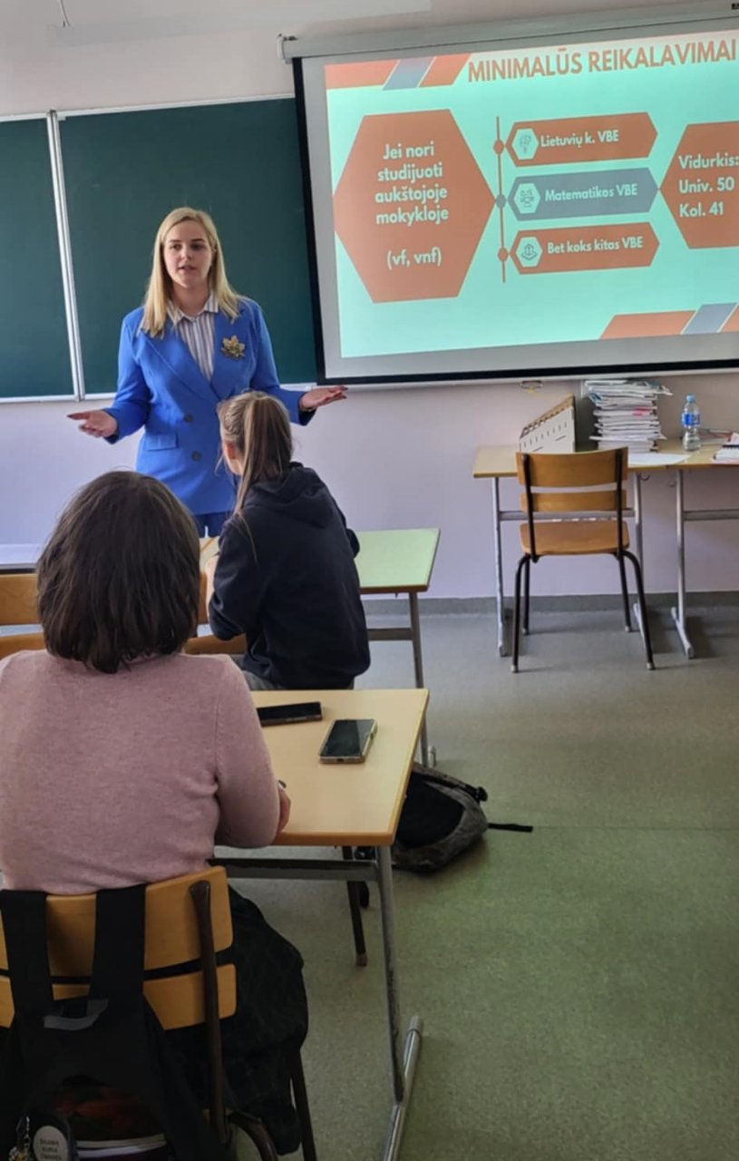 Monika Grigaliūnienė skaitė paskaitą „Misija specialybė: esi tikras, kad žinai, kuo nori būti?“ Viešnia padėjo mokiniams, ypač abiturientams, geriau suprasti studijų pasirinkimo svarbą, pristatė konkursinio balo sudarymo principus bei formulę, naudojamą stojant į aukštąsias mokyklas. Gimnazistai gavo praktinę užduotį – susirasti dominančią studijų programą ir panagrinėti jos turinį.