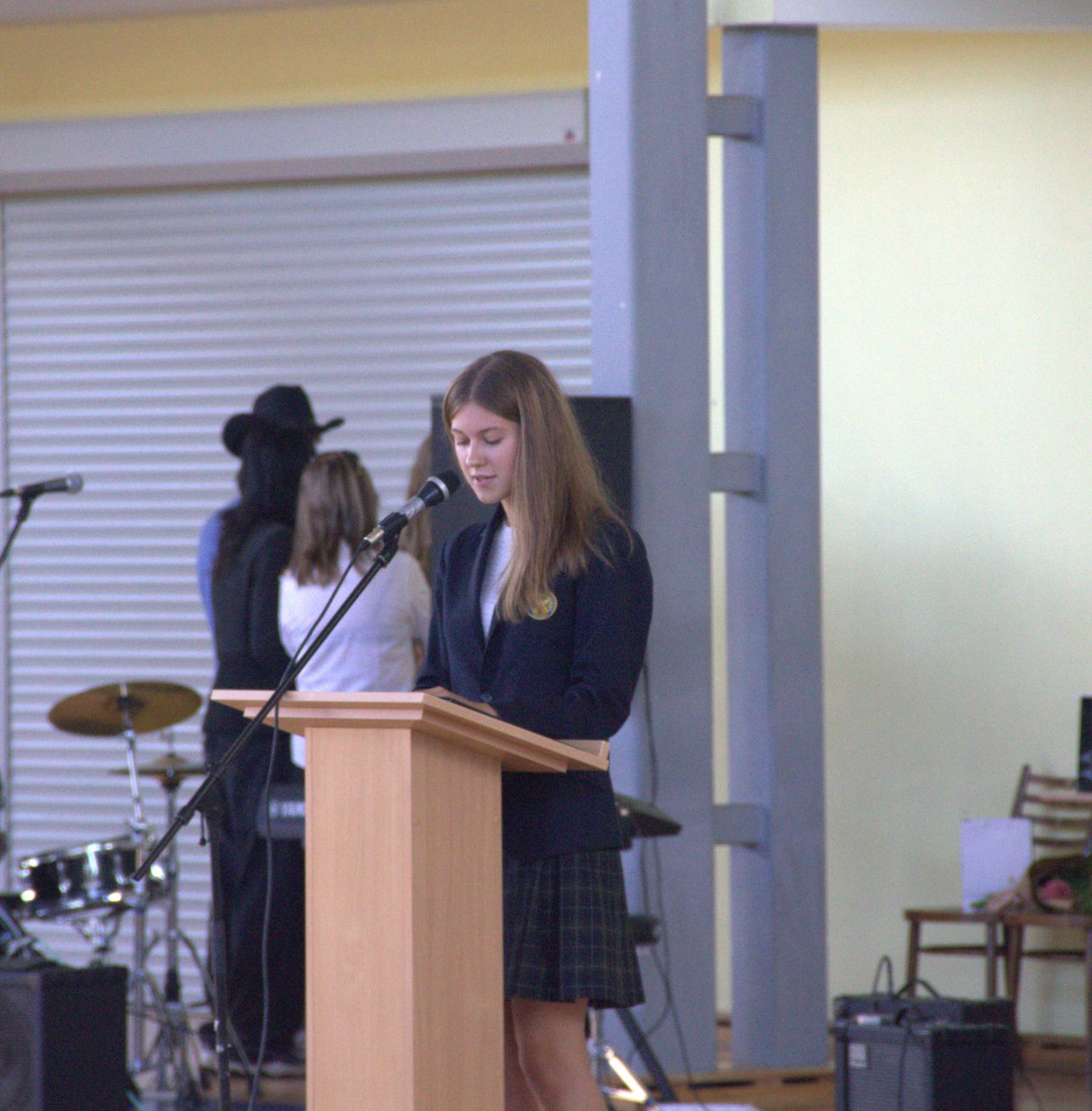 Kalbėjo abiturientė, gimnazijos mokinių seimo prezidentė Greta Gudaitė. Ji sveikino pirmokus, įsijungusius į stiprią bendruomenę, antrokus kvietė neišgyventi dėl PUPP, trečiokams priminė, kad mokslo metai bus kupini renginių, pareikalausiančių išradingumo ir kūrybiškumo. Kreipdamasi į abiturientus pabrėžė, kad silpnieji laukia galimybių, o stiprieji susikuria jas patys, todėl ketvirtokė įsitikinusi, kad bendraamžiai jau žino, ko nori ir kaip to sieks.