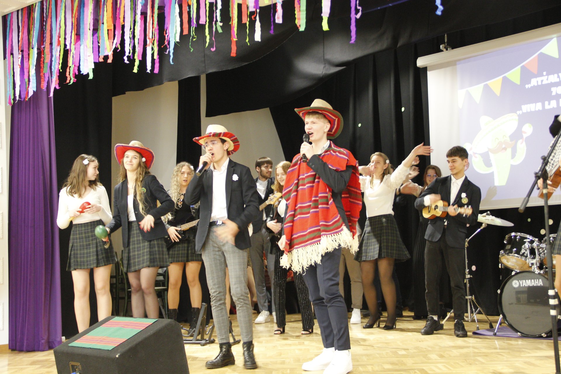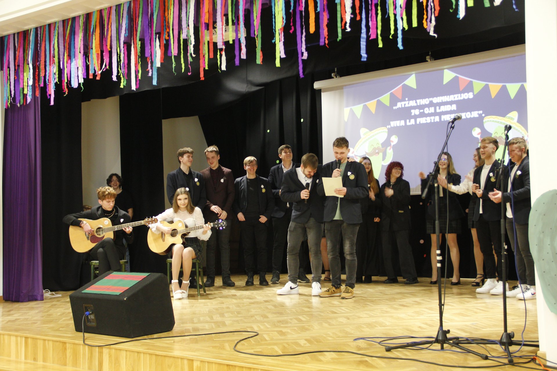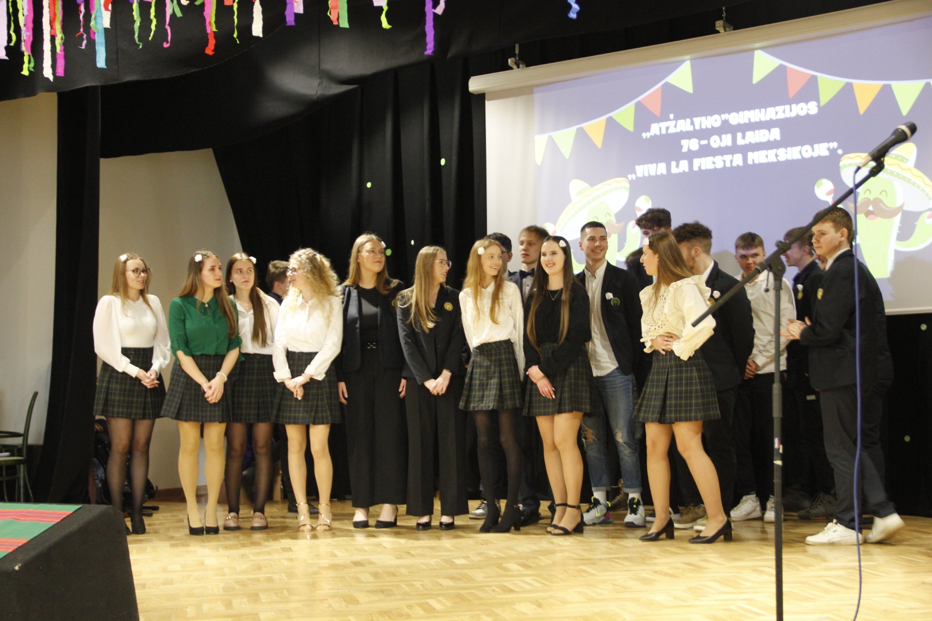 Po pamokų aidint karštiems plojimams į aktų salę žengė ketvirtokai ir jų kuratorė Inesa Tamulionytė-Poškauskienė. Po vedėjų pasveikinimo renginio pradžioje kūrinį dovanojo ukulėlių ansamblis „Fireflies“. Jautrų sveikinimo žodį tarė gimnazijos direktorė Asta Valuntienė, kuri teigė, kad nuo Šimtadienio iki egzaminų lieka labai mažai laiko, o dar labai daug reikia nuveikti. Gimnazijos vadovė teigė tikinti abiturientais, linkėjo, kad jie pirmiausia įrodytų sau, kad per ketverius metus suvokė nemažai gyvenimo tiesų, išmoko įvairių dalykų, kurių prireiks lekiant rytojaus keliais. Taip pat į ketvirtokus kreipėsi gimnazijos mokinių prezidentė Greta Gudaitė sakydama, kad Šimtadienis yra ypatingas laikas, kai prisimename praeitį ir žvelgiame į ateitį, todėl ji linkėjo gražių prisiminimų ir sėkmingos kelionės. Vėliau ketvirtokų kuratorės Inesos Tamulionytės-Poškauskienės laukė viktorina, kuri parodė, kiek gerai kuratorė pažįsta savo auklėtinius. Po gana neblogų atsakymų ji dėkojo ketvirtokų tėveliams už buvimą šalia, linkėjo dar neatsipalaiduoti, nes bus dar sunkių akimirkų, dėkojo mokytojams už kantrybę ir džiaugėsi visomis išgyventomis akimirkomis kartu su auklėtiniais, kuriems linkėjo nebijoti iššūkių, kurie ne tik užgrūdina, bet ir veda į priekį. Tada atėjo laikas pasirodyti ir patiems abiturientams. Pirmoji į sceną lipo IV c klasė. Vaikinams ir merginoms reikėjo pašokti „Macarena“. Po abiturientų pasirodymo per salę nuvilnijo grupės „Miražas“ atliekamo kūrinio garsai. Po to scenoje išvydome IV b klasę, kuriai reikėjo sukurti pasirodymą pagal grupės „Antikvariniai Kašpirovskio dantys“ dainą „Į Venesuelą“. Užduotis buvo įveikta ir jos atlikimas visiems sukėlė daug gerų emocijų. Galiausiai atėjo laikas pasirodyti ir IV a klasei. Jos laukė labai įdomi užduotis - sukurti ir padainuoti serenadą savo kuratorei, tačiau tam buvo dar viena sąlyga - kūrinį atlieka vaikinai, o merginos palaiko juos šokdamos. Toks ketvirtokų pasirodymas neliko nepastebėtas, jis sulaukė didelio palaikymo. Renginiui įsibėgėjus, į sceną lipo ukulėlių ansamblis, o po jų - IV a klasės gimnazistė Aleksandra, kuri atliko dainą pritardama gitara. Po šių pasirodymų prasidėjo savanorių užduotys. Pirmos užduoties sąlyga buvo tokia, kad iš duotų medžiagų vaikinai turi sukurti svajonių merginos modelį, o merginos - vaikino. Po modelių pristatymo žiūrovams buvo organizuota viktorina apie Meksiką. Jai pasibaigus dainą atliko grupė „Code A“. Tada trys savanorės merginos gavo „skanią“ užduotį. Joms teko ragauti organizatorių sumaišytų kokteilių ir atspėti jų sudėtį. Trečia užduotis buvo susijusi su KET klausimais, o paskutinis išbandymas pareikalavo rankų miklumo ir taiklumo – savanoriams reikėjo ant kaktuso užmesti žiedus. Sėkmingas buvo jau antras bandymas, bet visi vaikinai užmetė vienodą skaičių žiedų ir įrodė, kad laimėjo draugystė. Renginiui artėjant į pabaigą, buvo išdalyti pusatestačiai, kurie dar ilgai primins Šimtadienio šventę. Atėjo laikas žodį tarti ir patiems abiturientams. Nuoširdžiai padėkota „Atžalyno“ gimnazijos direktorei Astai Valuntienei, direktoriaus pavaduotojoms ugdymui Rasai Augustinaitienei ir Rasai Bertulienei už vadovavimą ir paramą, kuri leidžia augti bei tobulėti, choreografijos mokytojai, trečiokų kuratorei Audronei Geležinytei-Šniukienei už kūrybingumą, profesionalumą, nepakartojamą renginį, kuratorei Inesai Tamulionytei-Poškauskienei už palaikymą, dėmesį, meilę, tėveliams ir mokytojams už pastangas, pasiaukojimą, įkvėpimą. Džiaugiamės turiningu renginiu, kuriame skambėjo muzikos garsai, todėl nepaprastai dėkingi ir muzikos mokytojai Vaivai Klupšienei. Šventę baigė grupė „Miražas“, kuri atliko dainą „Dabar geriausi mūsų vakarai“. Manau, kad šis kūrinys buvo pasirinkta ne veltui, tai tarsi priminimas abiturientams ir visiems, kad turime mėgautis viskuo tol, kol galime.