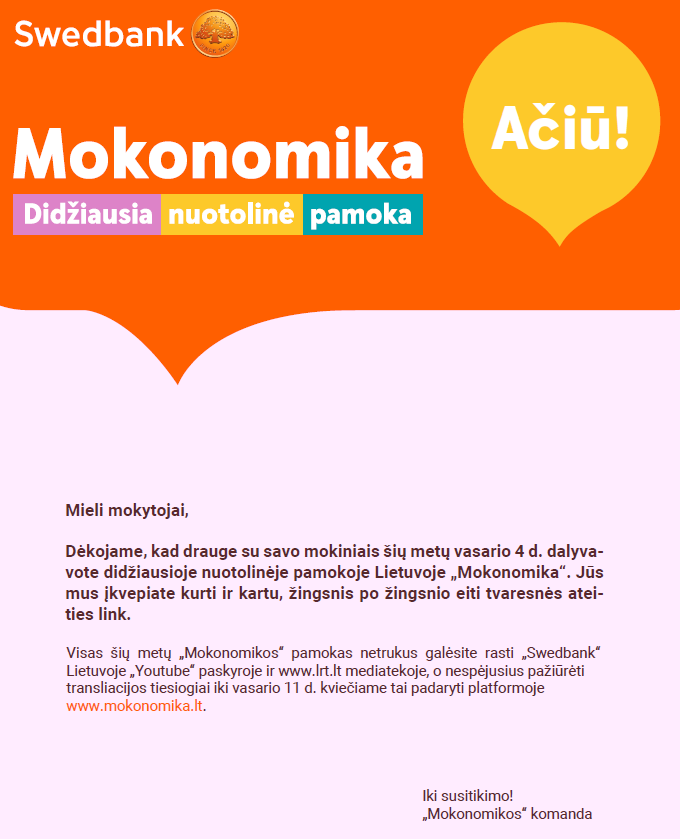 Vasario 4 d. mokiniai ir mokytojai dalyvavo didžiausioje nuotolinėje pamokoje „Mokonomika“, kurią jau antrus metus inicijuoja „Swedbank“. Gimnazijoje šią dieną organizavo profesinio informavimo ir karjeros ugdymo veiklos tobulinimo grupė. I-IV klasių gimnazistai pakviesti į „Ekspertų“ pamokas mokonomika.lt platformoje. Buvo kalbama tvarumo, pilietiškumo, finansinio raštingumo ir kitomis aktualiomis temomis. Jauni žmonės galėjo išgirsti padrąsinimą nenusiminti suklydus, juos motyvavo „Fail Nights“ organizatorė Simona Laiconaitė, „Nepatogaus kino klasės“ vadovė Indrė Maršantaitė kvietė nusiimti stereotipų akinius, „Rockit“ centro vadovė Lina Žemaitytė-Kirkman pasakojo apie technologijų įdarbinimą mokantis. Mokiniai sužinojo, kodėl svarbu atpažinti savo jausmus, kokios yra 6 pagrindinės emocijos, kad svarbu siekti užsibrėžto tikslo, taip pat mokėsi verslo paslapčių, gilinosi į demokratijos subtilybes. Refleksija nudžiugino minčių ir atradimų gausa: gimnazistai pasidalijo savo mintimis su auklėtojomis, kuratorėmis, išsakė pastebėjimus, pasiūlymus, pavyzdžiui: