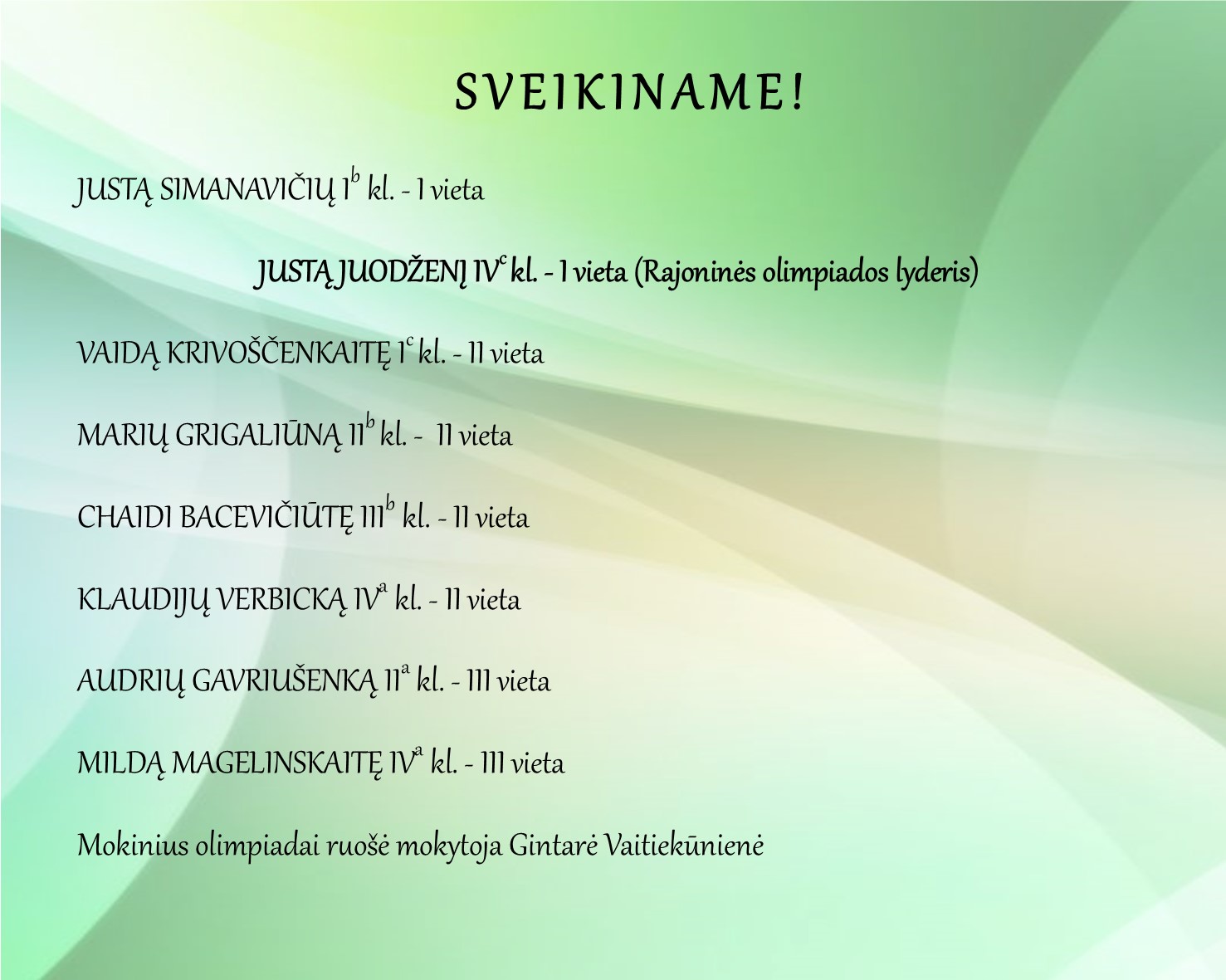 Austėja Dumbrytė (Ia), Deivydas Pocius (Ia), Kamilė Augėnaitė (Ib), Kamilė Jozėnaitė (Ib), Vaida Krivoščenkaitė (Ic), Gabrielė Židonytė (Ic), Odeta Juodagalvytė (IIa), Kornelija Abromavičiūtė (IIa), Miglė Kukutytė (IIa), Domantė Beliackaitė (IIb), Simona Baltėnaitė (IIb), Erika Juozaitytė (IIb), Erika Šimkūnaitė (IIb), Gintarė Butvilauskaitė (IIb), Erika Kveinytė (IIb), Justas Špejeras (IIb), Goda Mišeikytė (IIb), Ineta Jurevičiūtė (IIc), Greta Malinauskaitė (IIc), Austėja Miknevičiūtė (IIc), Agnė Mykolaitytė (IIc), Otilija Čepaitytė (IIIa), Vykinta Čeponytė (IIIa), Rugilė Karklytė (IIIa), Chaidi Bacevičiūtė (IIIb), Elina Ridikaitė (IIIb), Goda Beinoraitė (IIIc), Sigita Matjušaitytė (IIIc), Irma Zakaitė (IVa), Emilija Jankaitytė (IVa), Karolina Ridikaitė (IVa), Žygimantas Mateliūnas (IVa), Kostas Šimaitis (IVb), Airidas Rudžianskas (IVb), Dovilė Venclovaitė (IVb), Greta Borkauskaitė (IVc), Ingrida Kimbartaitė (IVc), Deira Virkštytė (IVc), Justas Juodženis (IVc), Eividas Pelenis (IVd), Kristina Sakalauskaitė (IVd), Aistė Petrevičiūtė (IVd).
