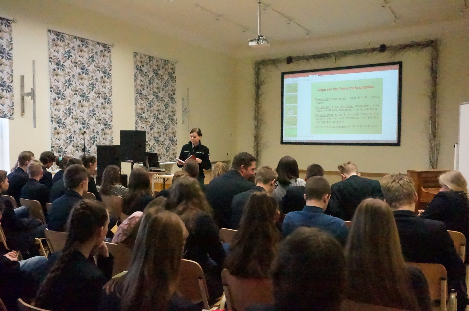 Šių metų kovo 19-23 dienomis mūsų gimnazija, kaip ir dauguma Lietuvos mokyklų, dalyvavo VšĮ „Vaikų linijos“ inicijuotoje visuotinėje akcijoje „Savaitė BE PATYČIŲ 2018“. Kovo 22 d. į posėdžių ir konferencijų salę susirinko I ir II gimnazijos klasių mokiniai paklausyti paskaitos ir pabendrauti su Pakruojo rajono policijos komisariato bendruomenės pareigūne Nida Mažeikaite. Viešnia pasakojo, kad ypač agresyvios patyčios vyksta virtualioje erdvėje: jauni žmonės siunčia vienas kitam nemalonius elektroninius laiškus, nepatrauklias žinutes. Bendruomenės pareigūnė pabrėžė, kad patyčios iš realaus gyvenimo gali persikelti, pavyzdžiui, į socialinius tinklus. Pasekmės liūdnos: asmuo jaučiasi nesaugus, gali pradėti nepasitikėti savimi, kyla pyktis dėl išgyventos neteisybės, atsiranda noras praleisti pamokas, nebėra motyvacijos mokytis. Taip pat buvo kalbėta apie atsakomybę už tyčiojimąsi virtualioje erdvėje. III ir IV gimnazijos klasių mokiniai žiūrėjo „Vaikų linijos“ rekomenduojamus filmus apie patyčias ir juos aptarė.