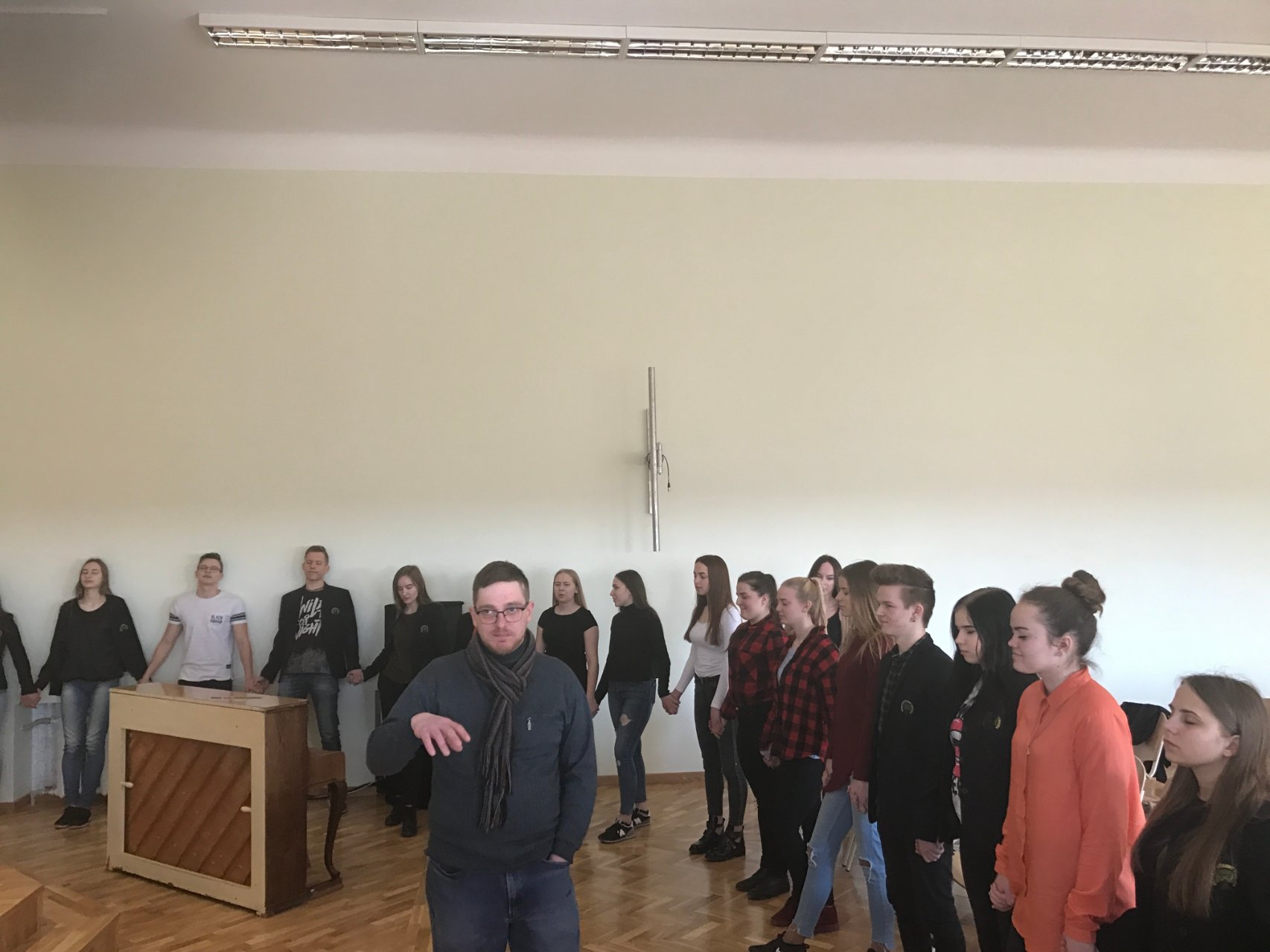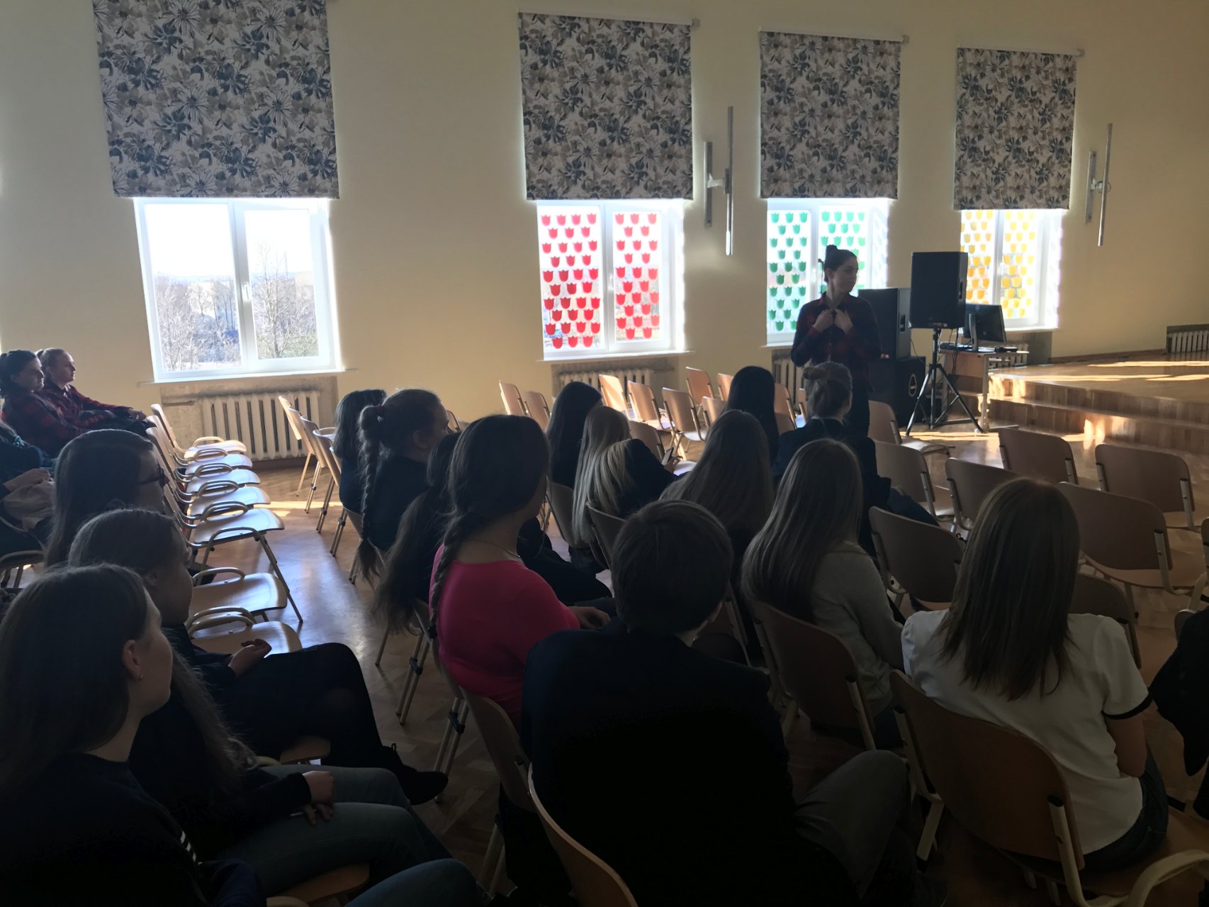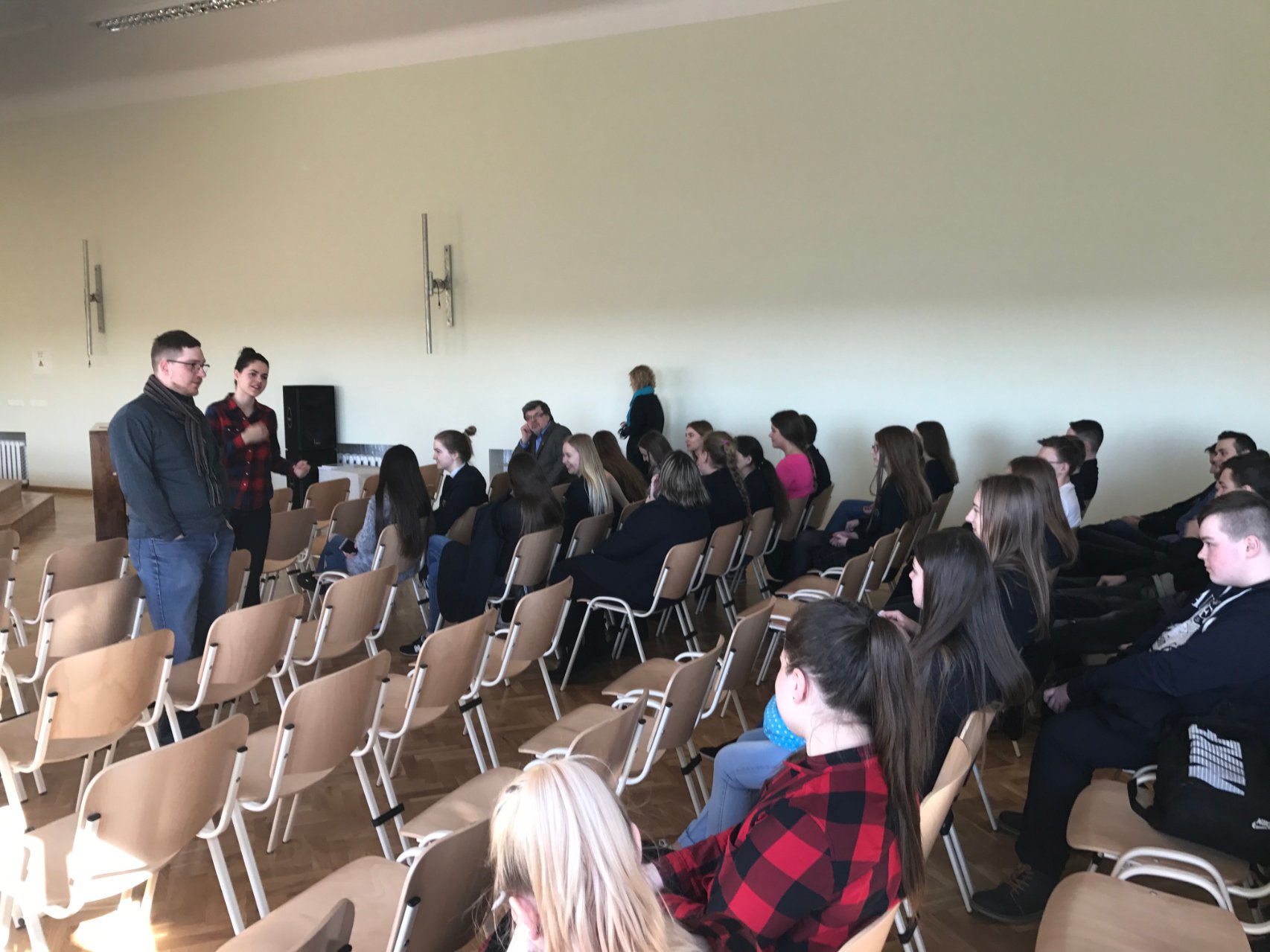 Kovo 27 d. yra minima Tarptautinė teatro diena. Ta proga gimnazijoje svečiavosi Pakruojo kultūros centro projektų vadovė Rasa Jankūnaitė, beje, baigusi mūsų mokyklą, ir režisierius Simonas Kilius. Jie susitiko su mūsų gimnazijos antrokais ir šventė Teatro dieną: papasakojo apie aktoriaus profesiją, organizavo įvairius užsiėmimus, analizavo scenines gudrybes, aptarė režisieriaus darbo ypatumus. Rasa ir Simonas pakvietė mokinius pokalbį pratęsti kovo 29 d. 15 val. Pakruojo kultūros centre.
