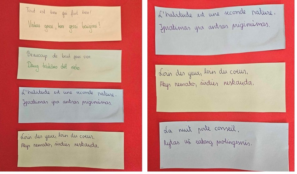 Prancūzų kalbos mokytoja Inga Ušinskaitė pasakojo, kad prancūzų pasirinkę mokiniai domėjosi prancūzų kalbos patarlėmis ir posakiais, vertė juos į lietuvių kalbą, lygino ir ieškojo geriausio atitikmens gimtojoje kalboje.