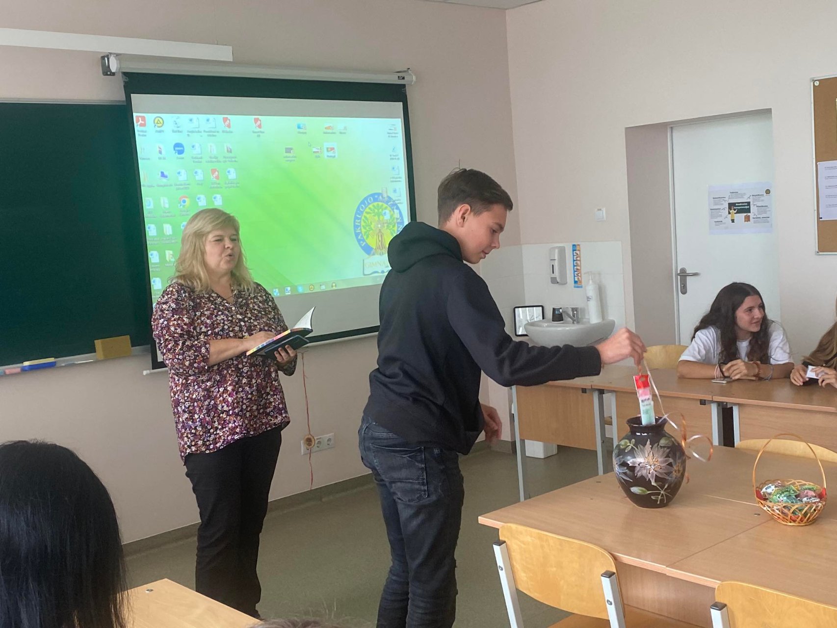 Anglų kalbos mokytoja Rasa Stravinskienė pasakoja: „Su I a klase rugsėjo 25 d. vedžiau pamoką kitaip tema „Ambasadorių suvažiavimas“ . Dalyvavo „ambasadoriai“ iš 13 šalių: Prancūzijos, Vokietijos, Italijos, Airijos, JAV, Danijos, Švedijos, Nyderlandų, Brazilijos, Portugalijos, Graikijos, Vengrijos, Ispanijos. Mokiniai kūrybiškai ir vaizdžiai pristatė savo šalis, įžymius tos šalies žmones, pamokė tos kalbos žodžių ir frazių. Dalyvių laukė siurprizas – Guostė, kuri pristatė Ispaniją, atsivedė į pamoką draugę iš Barselonos, kuri jai padėjo, nes papasakojo apie savo šalį. Be to, dalyvavo dar dvi viešnios iš Ispanijos. Pamokos pabaigoje daviau užduotį visiems dalyviams: palinkėjimus, užrašytus ant lietuviško saldainio, išversti į tų šalių kalbas, kurias jie pristatė. Visas frazes užrašėme lentoje.“