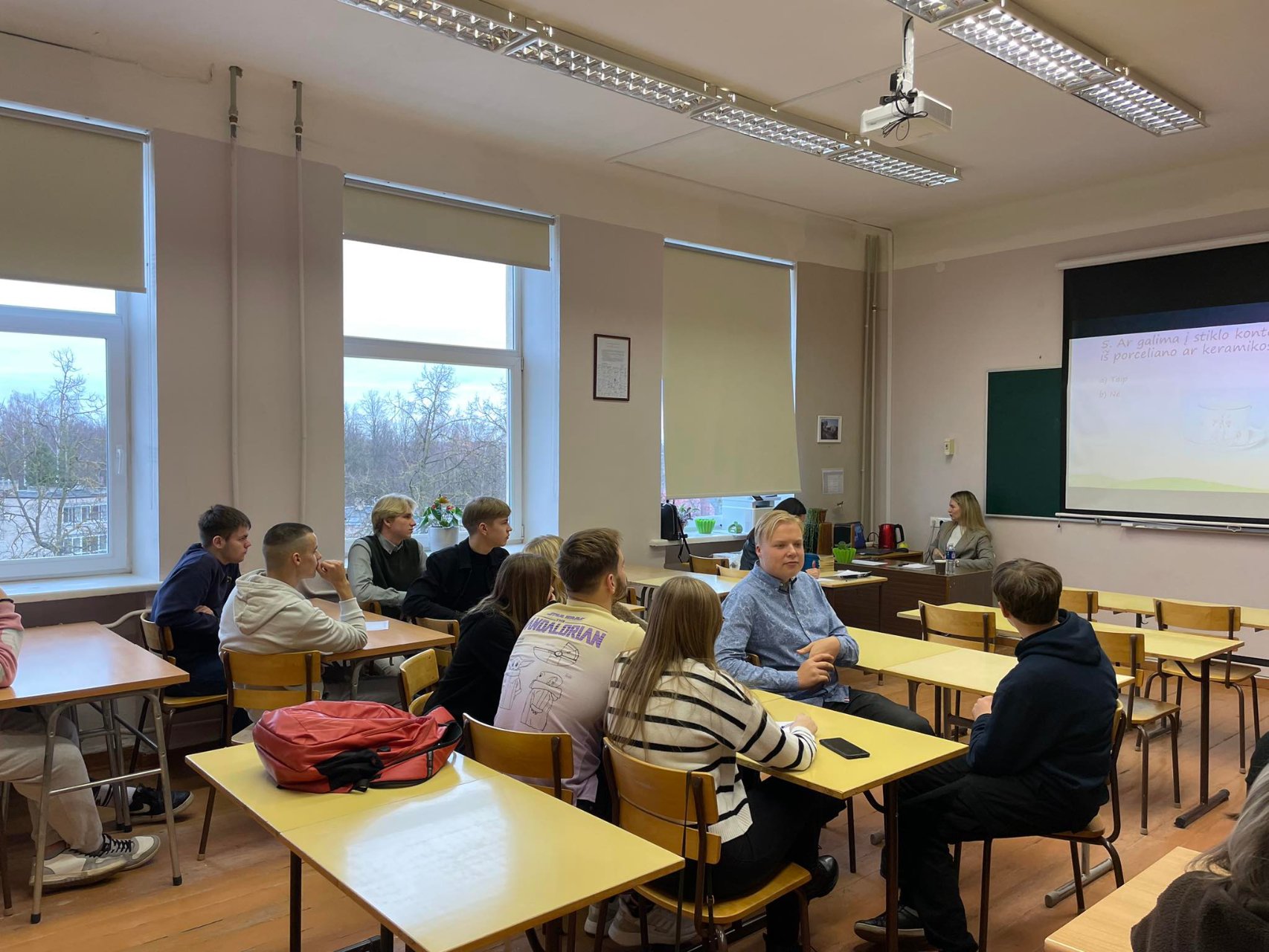 AUSTINA KUNCEVIČIENĖ, Pakruojo rajono savivaldybės administracijos vyresnioji specialistė, ekologė, informatyviai ir išsamiai paaiškino, kaip atsakingai rūšiuoti atliekas – mokiniai dalyvavo „protmūšyje“. Beje, gimnazistai atidžiai klausė apie leidimus medžiams nupjauti. Džiugu, kad buvo aptartos jauniems žmonėms aktualios temos ir mokiniai pagilino žinias.