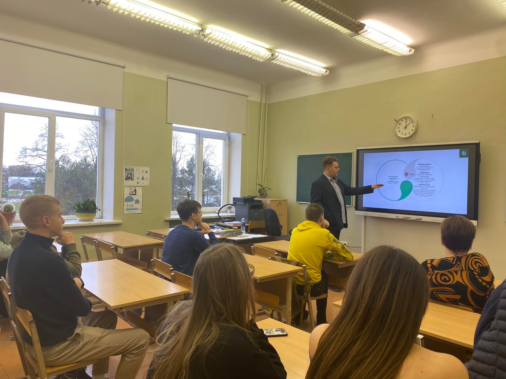 Lietuvos banko vyresnysis analitikas IGNAS GASPARAVIČIUS pristatė savo darbą banke, pasidalijo įžvalgomis apie studijas, akcentavo ypač sudėtingus matematikos mokslus universitete. Ignas gimnazistams pademonstravo keletą sprendimo būdų, viską išdėstė aiškiai ir konkrečiai, pasakojo apie tai, kokios jo veiklos banke, kas jam svarbu ir aktualu.