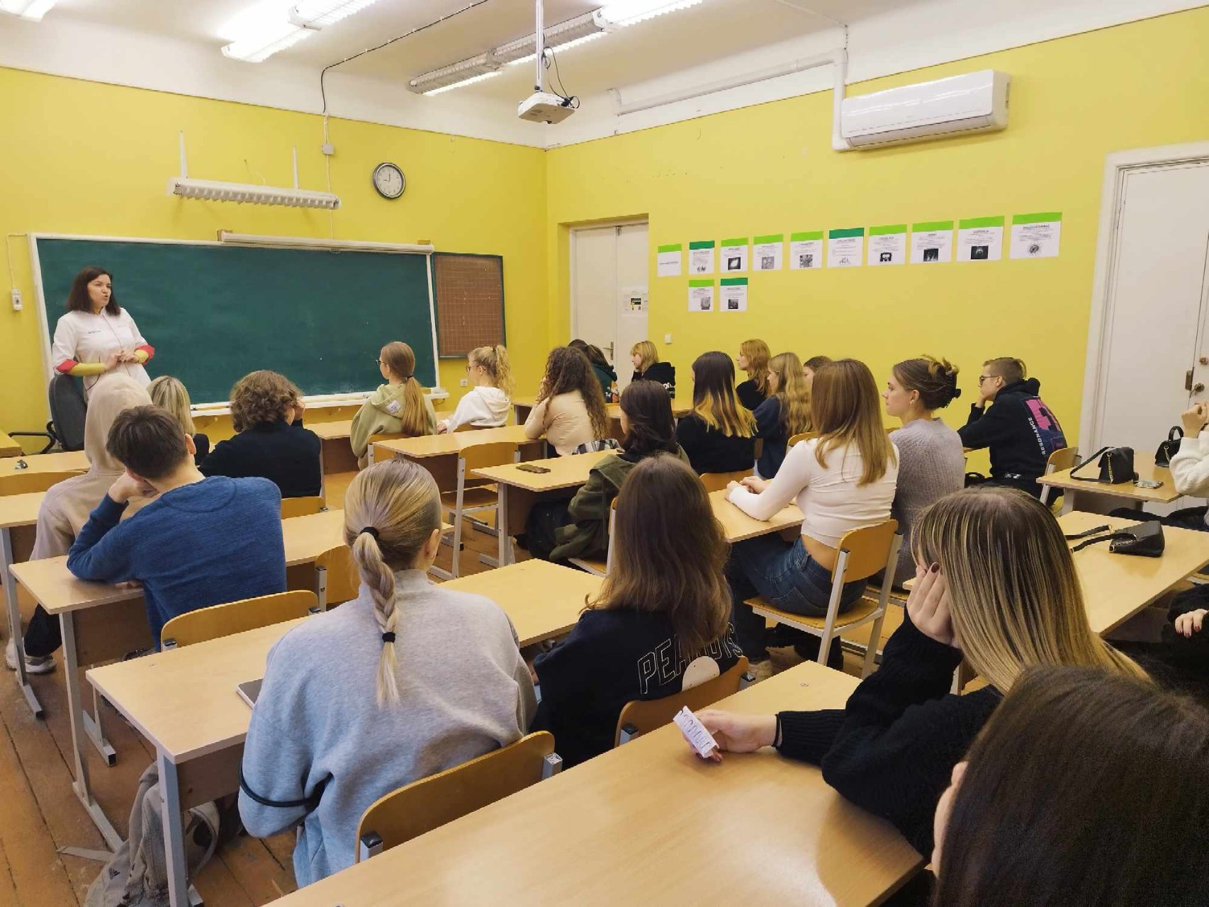 Veidoskaitos specialistė AINA VADAPALAITĖ buvo paruošusi labai kokybiškas pateiktis ir išsamiai stengėsi paaiškinti, kas yra veidoskaita, pateikė pavyzdžių. Mokiniai sužinojo, kad tai nėra tik atskiri veido bruožai, iš kurių galima sužinoti žmogaus charakterį. Būtina išmanyti daug teorijos, reikia daug dalykų susieti į vieną. Šios srities specialistams nemažai galimybių atsiveria užsienyje, veidoskaitininkus samdo įmonių, pardavimų vadovai, tai individuali veikla.