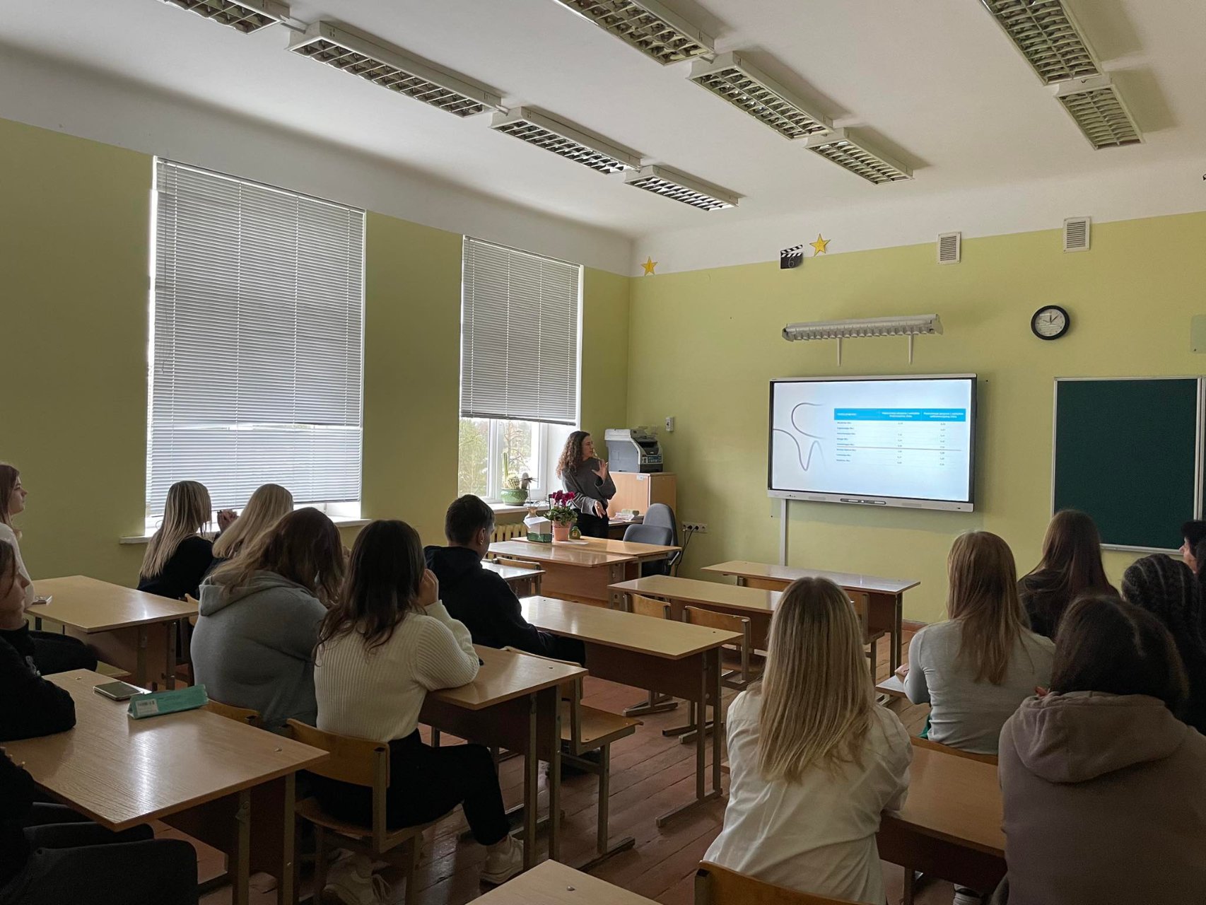UAB „Medicus LT“ odontologė PAULĖ KAZAKEVIČIŪTĖ pristatė savo profesiją, kalbėjo apie studijų laiką, kainą, aptarė pliusus (galima derinti mokslą ir studijas, lengviau nei medicina) ir minusus (sunku įstoti į valstybės finansuojamą studijų vietą). Pabrėžė, kad darbas reikalauja fizinės ištvermės, nes dėl kūno padėties kenčia kaklas, nugara, pečiai. Paulė pabrėžė, kad gyvenime labai svarbu pasirinkti norimą darbą.