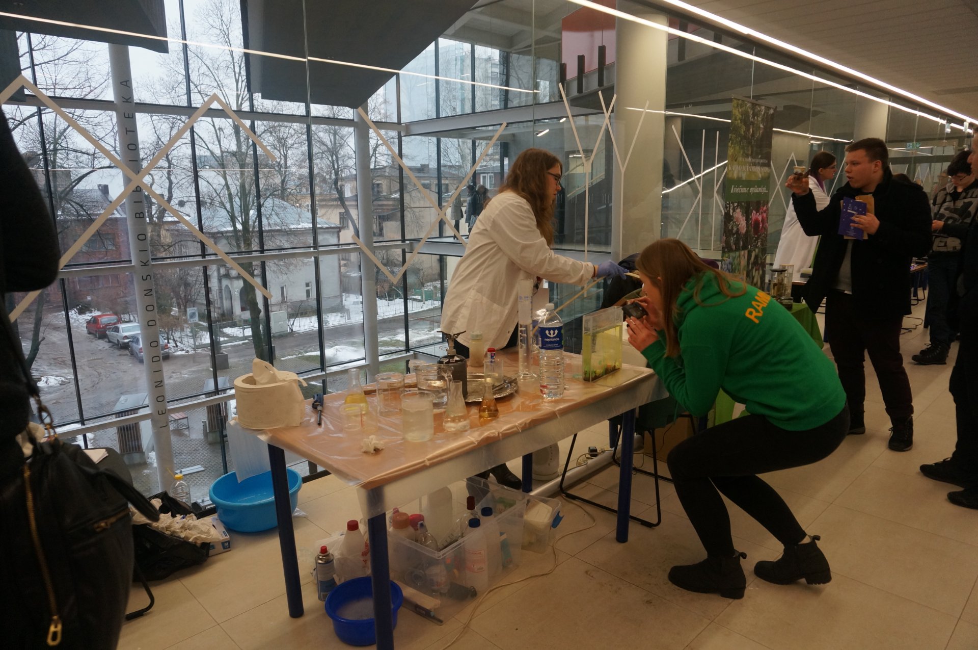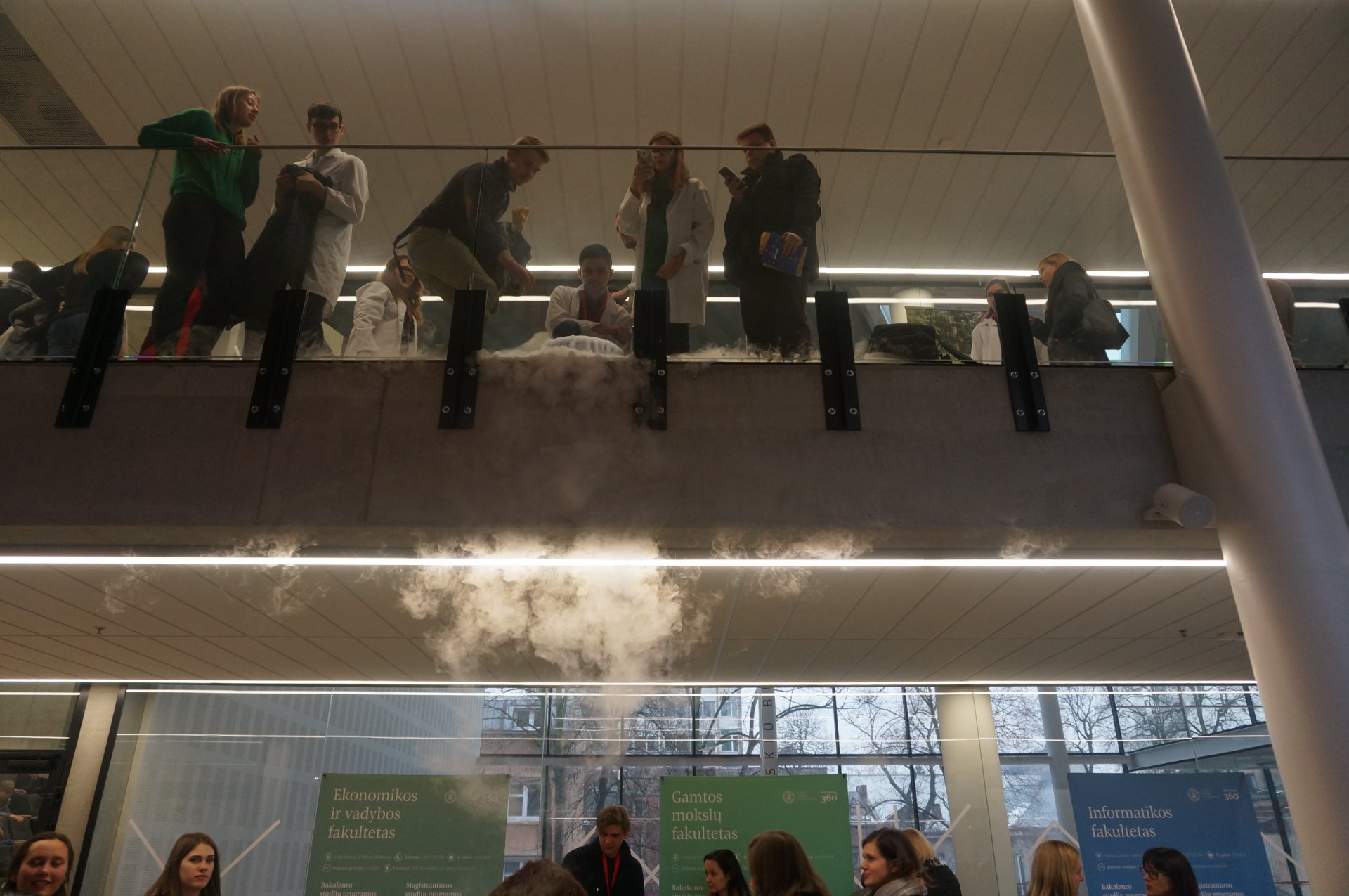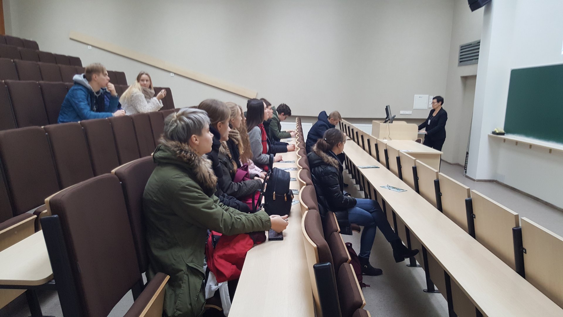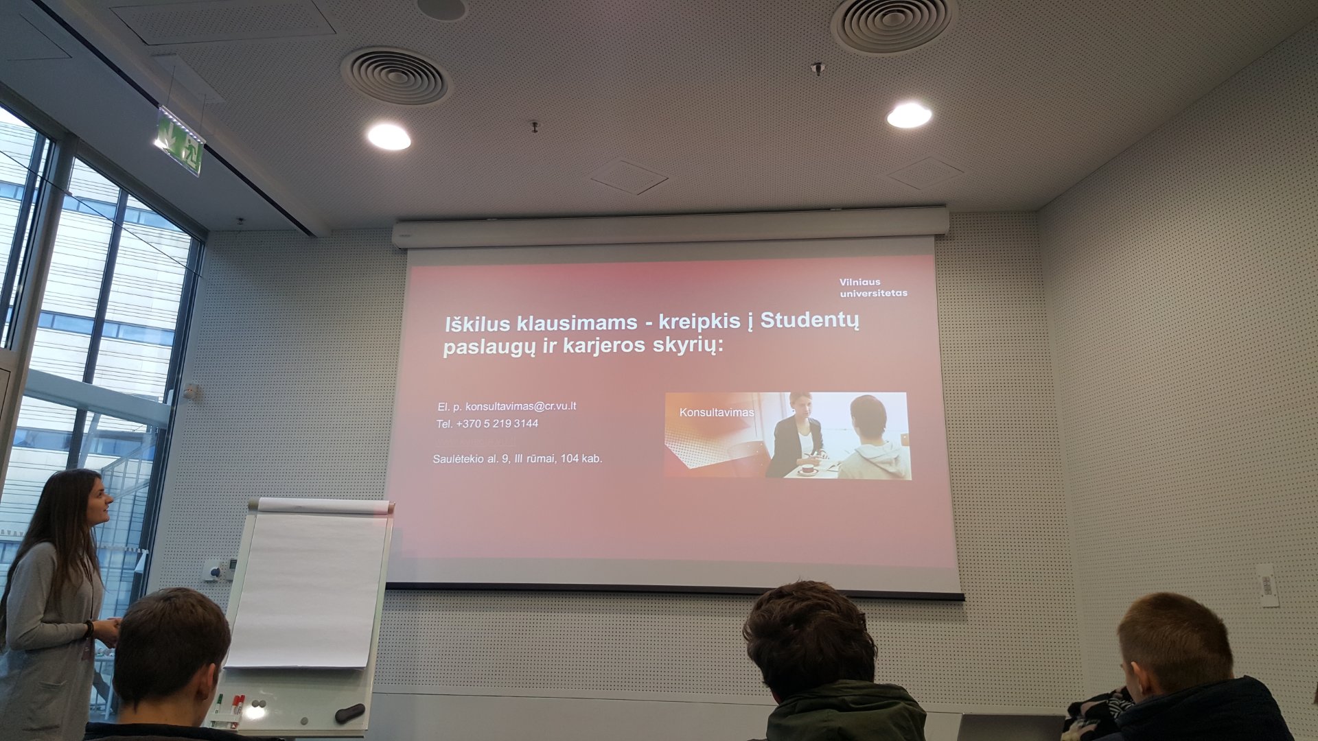 Po apsilankymo VGTU važiavome į Vilniaus universiteto studentų miestelį Saulėtekio alėjoje, kur Komunikacijos ir rinkodaros skyriaus ryšių su mokyklomis koordinatorė Ineta Gabrieliūnaitė papasakojo apie studijas ir stojimo sąlygas Vilniaus universitete. Po šio susitikimo Mokslinės komunikacijos ir informacijos centre susipažinome su modernios bibliotekos aplinka, sužinojome apie daugiafunkcinę knygų išdavimo ir grąžinimo tvarką. Taip pat koordinatorės lydimi apsilankėme Gyvybės mokslų veiksmo laboratorijoje, kur iš arti galėjome stebėti būsimųjų mokslininkų darbą.