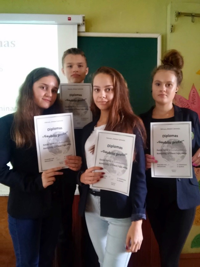 Pirmoji „Gaublio protų“ viktorina neatsitiktinai sutapo su rugsėjo 27-ąją minima Pasauline turizmo diena. Gimnazistai miklino savo žinias atsakinėdami į klausimus apie pasaulio įvairenybes, spėliojo, kokios valstybės sudaro Beneliuksą, prisiminė, kiek prezidentų turėjo Lietuva po nepriklausomybės paskelbimo. Viktorinoje dalyvavo I ir II klasių 6 gimnazistų komandos. Pirmąją vietą užėmė komanda „Kas per smegenėlės?“
