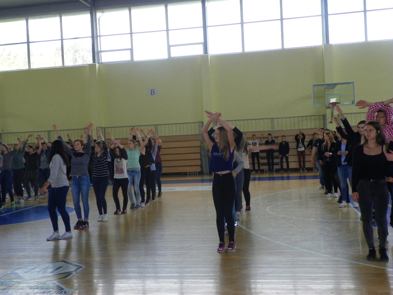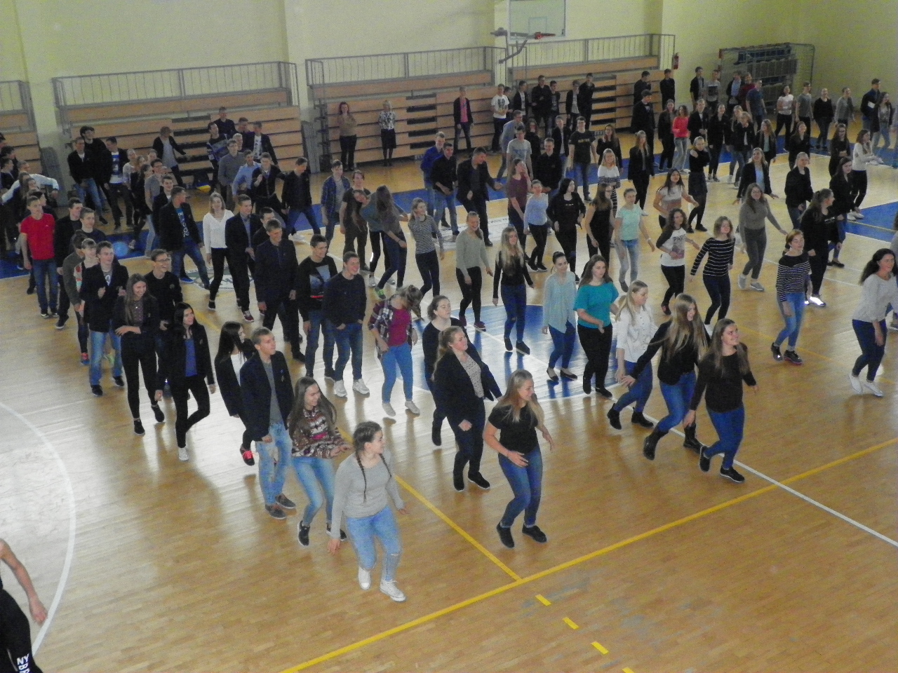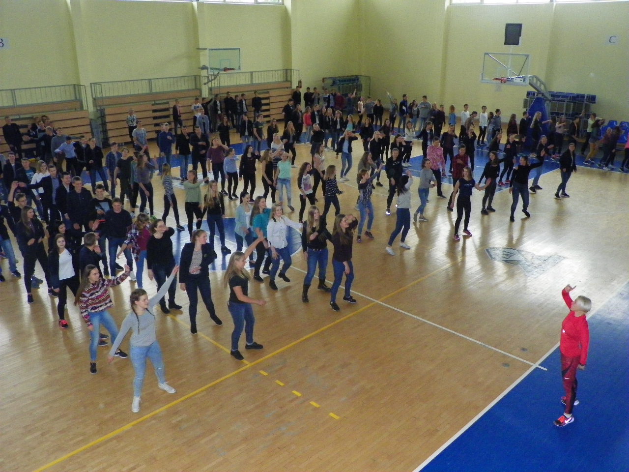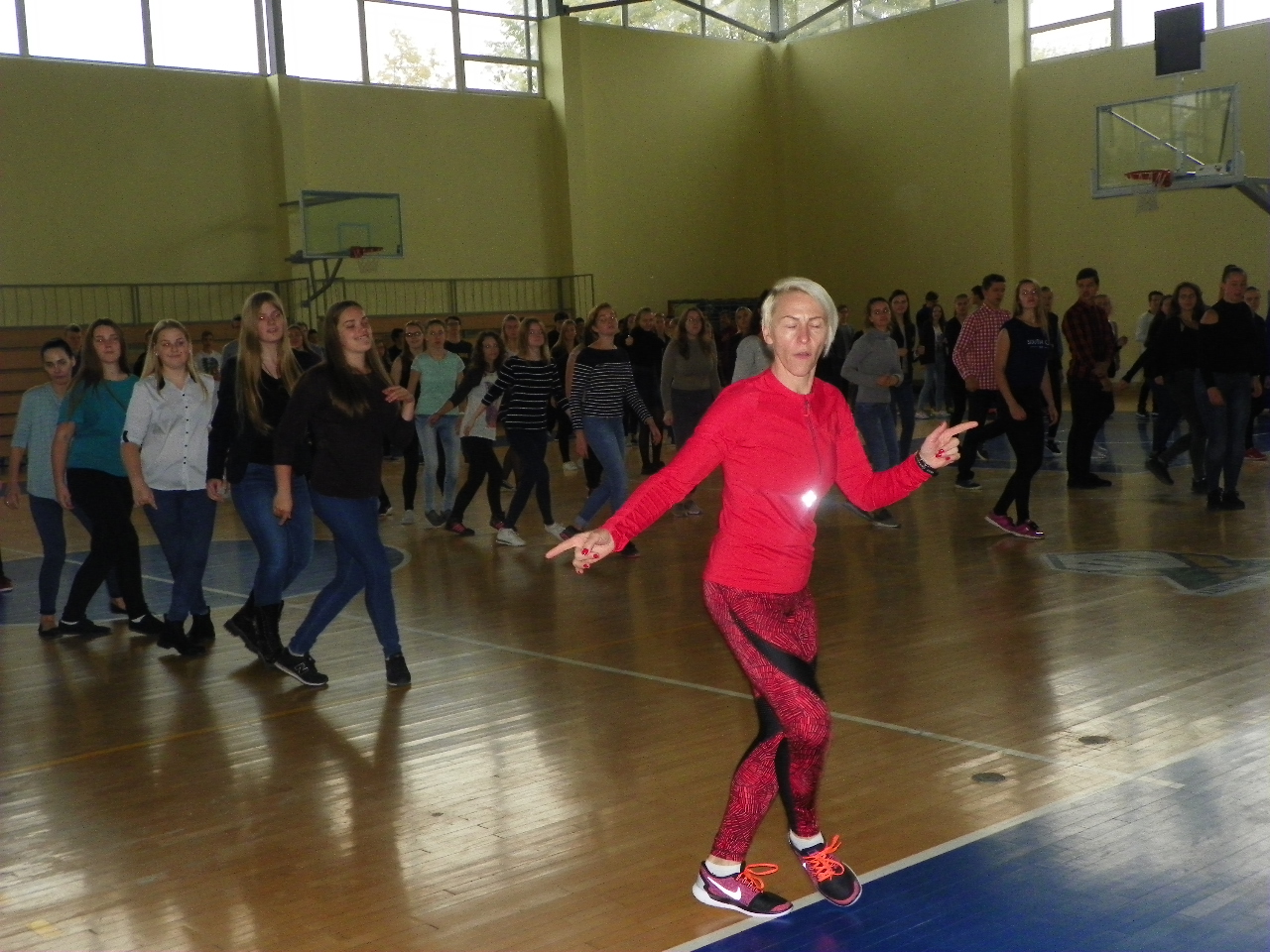 Trečiadienį per ilgąją pertrauką gimnazistai skubėjo į sporto salę. Linksmąją mankštą „Judam kartu☺“ bendruomenei vedė Pakruojo sporto klubo ABC prezidentė trenerė Ramunė Pociuvienė. Paprašyta apibūdinti tokios mankštos ypatumus, ji teigė, kad tai buvo tikrų tikriausia klasikinės aerobikos pamoka, kurią sudarė pramankšta, intensyvioji dalis, kuri užtruko ilgiausiai, ir paskutinysis etapas – atsipalaidavimas bei statiniai pratimai. Taip sportuojant labai svarbi tinkamai parinkta muzika, ritmas, ir, žinoma, geros emocijos.