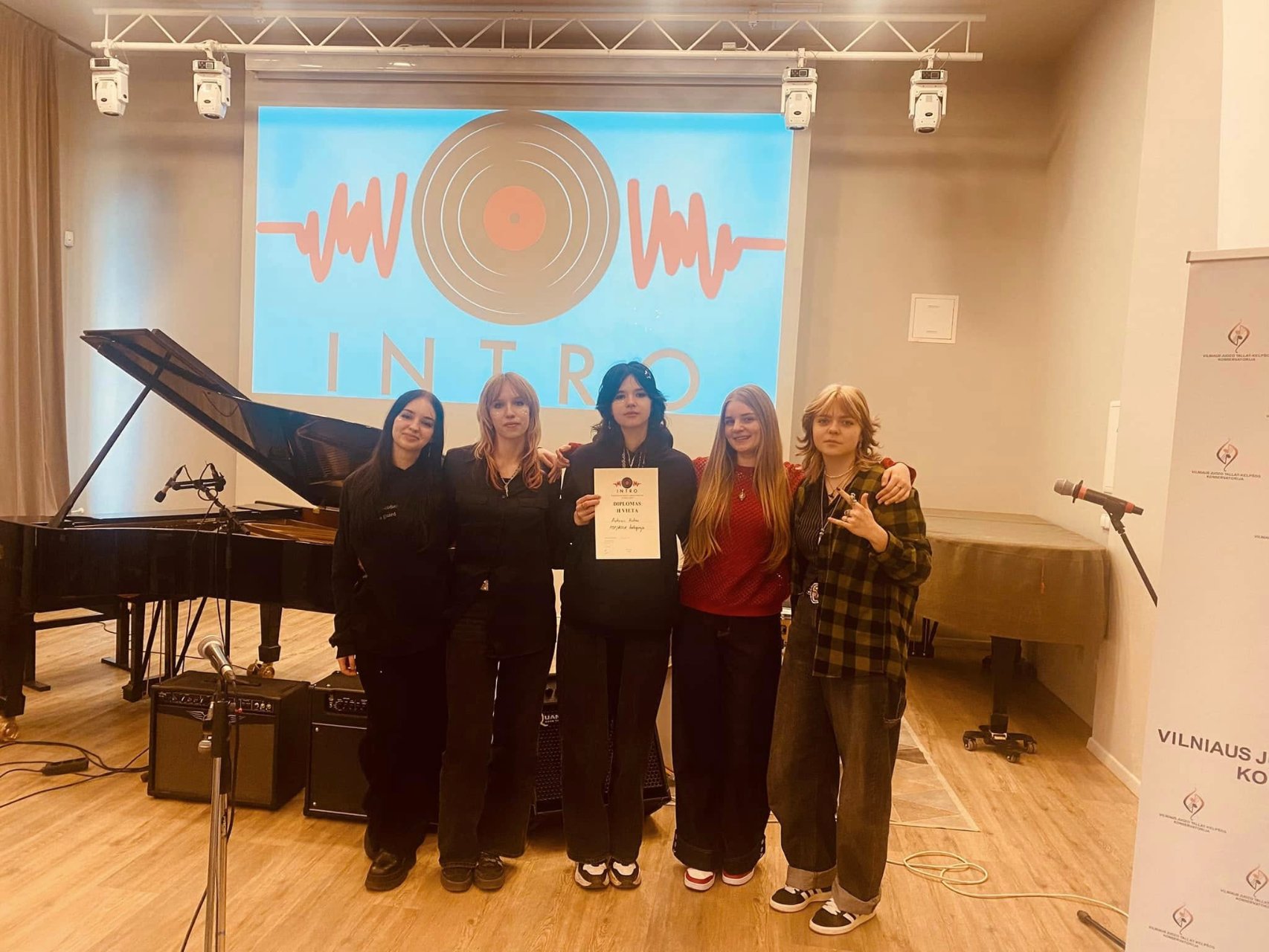 Šiandien kovo 16 d. „Atžalyno“ gimnazijos merginų grupė „Auksinis rūkas“ dalyvavo džiazo – populiarosios muzikos grupių konkurse „Intro“ Vilniaus Tallat-Kelpšos konservatorijoje ir roko – populiariosios muzikos grupių kategorijoje užėmė II vietą! Sveikinu Gabiją, Guostę, Frėją, Arūnę ir Vaivą! Merginos tikros šaunuolės, nes nepabūgo varžytis su Vilniaus, Akmenės menų mokyklų kolektyvais! Šiandien buvo unikali galimybė ne tik pasirodyti, bet ir pasiklausyti, kaip mokinių kolektyvai iš Vilniaus B. Dvariono, Jonušo menų mokyklų, Tallat-Kelpšos konservatorijos, Pilaitės gimnazijos, Kauno Juozo Gruodžio konservatorijos puikiai atlieka džiazo stiliaus muziką. Nuoširdžiai dėkojame gimnazijos direktorei Astai Valuntienei už palaikymą, o vairuotojui Juozui už saugią kelionę.