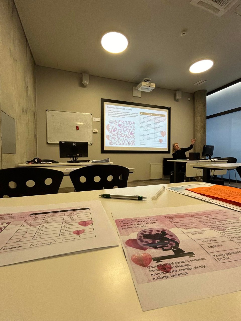 Po pertraukėlės dalyvavome praktinėse veiklose. Mikroskopavimo praktinę užduotį „Neliek kraujo be reikalo“ organizavo LSMU gimnazijos biologijos mokytoja metodininkė Elena Juotkienė. Kalbėjome apie kraujo sandarą, apie tai, kokias ligas gali sukelti kai kurių medžiagų kraujyje perteklius ar per mažas jų kiekis, ką galime pamatyti atlikę mikroskopinę kraujo analizę. Po trumpos pamokėlės tapome gydytojais. Atsižvelgdamos į pateiktų pacientų kraujo tyrimus bei simptomus turėjome nustatyti jų ligas.