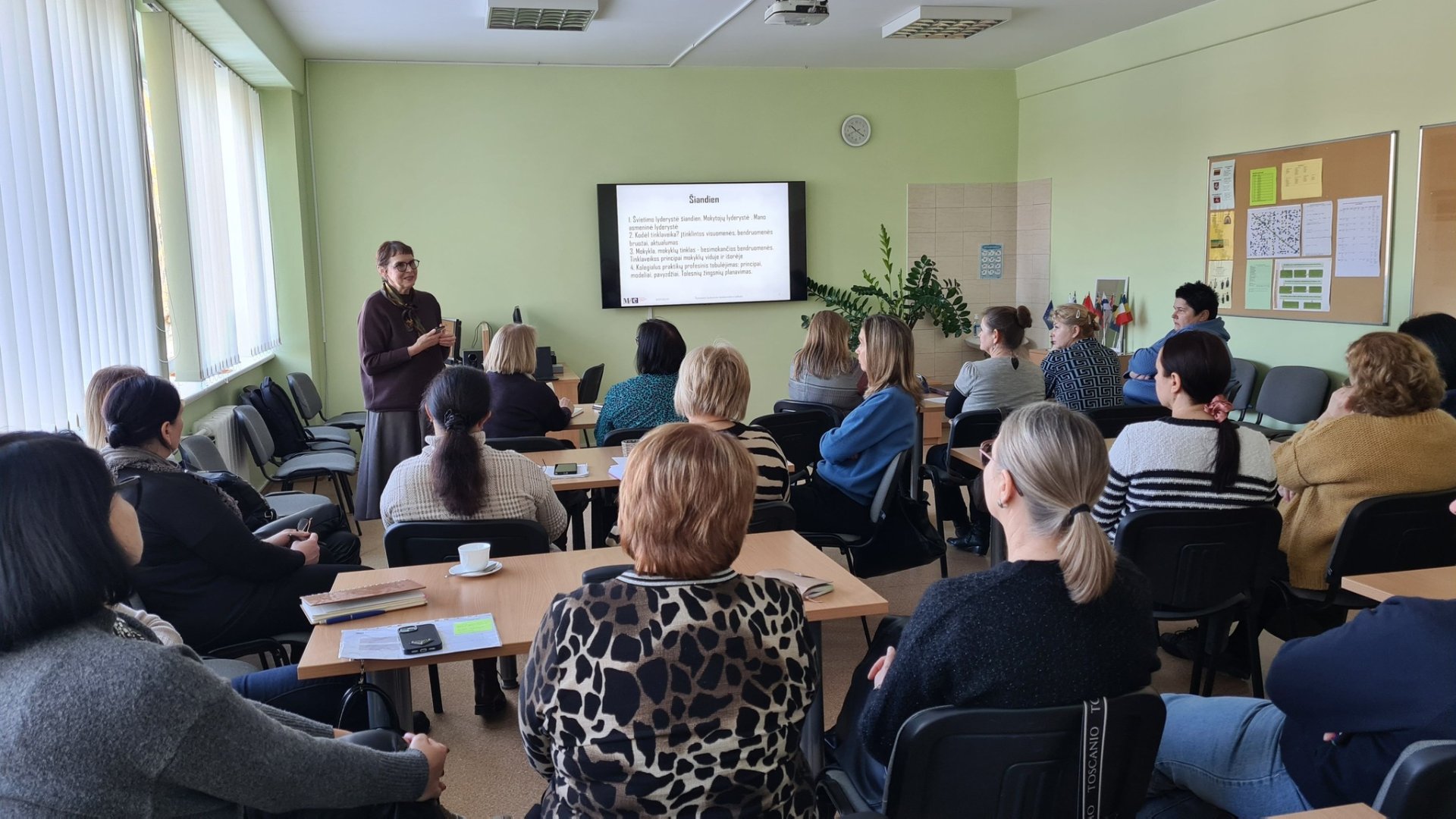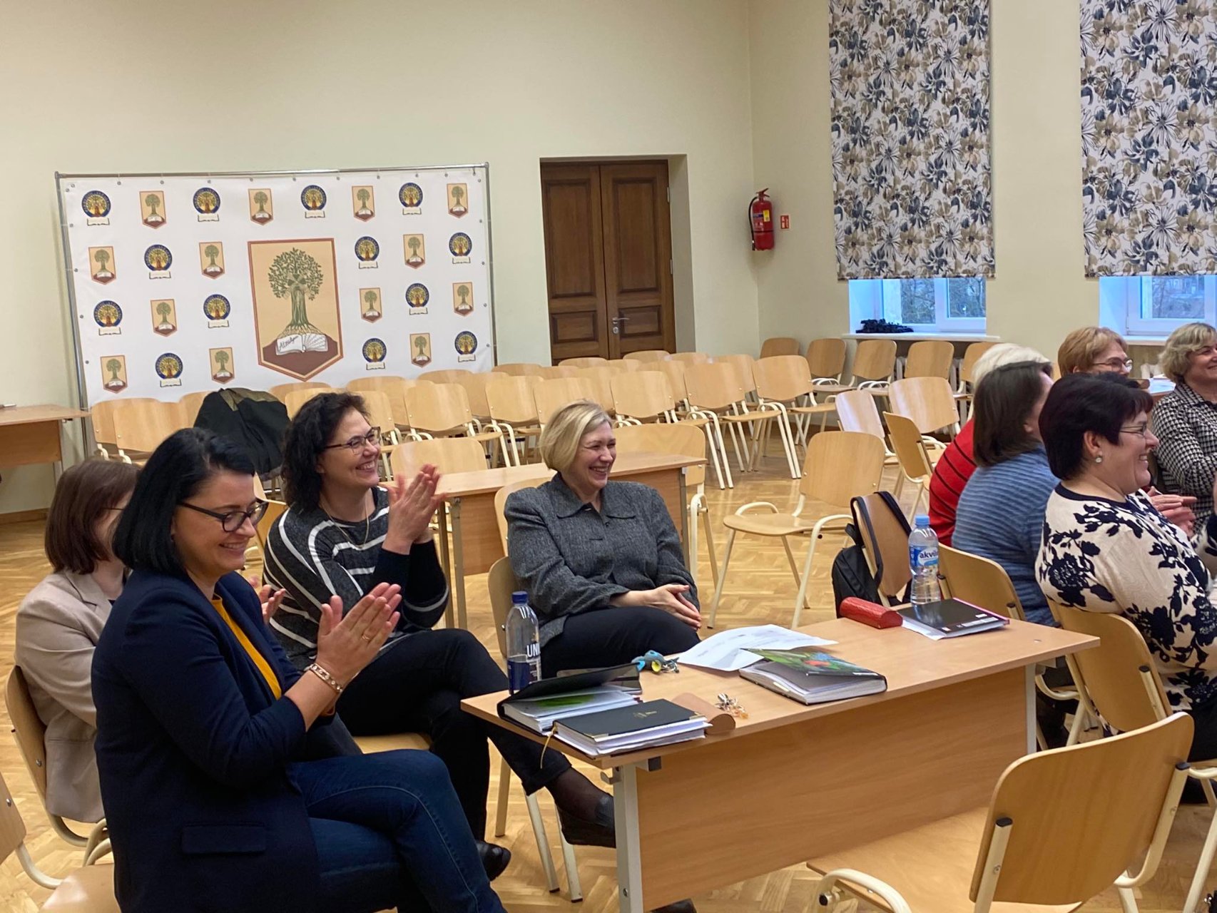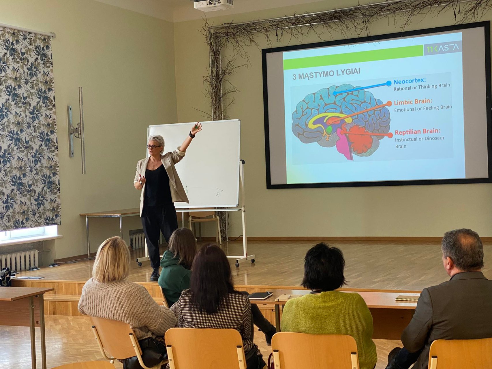 Viešnia pristatė savo ieškojimų ir atradimų kelią, akcentavo, kad lyderystė yra susijusi su žmonėmis, o pirmoji jos mokykla buvo šeima. Lektorė kvietė pamąstyti, kokius žmones galima pavadinti lyderiais. Mokytojai pasiūlė įvairių atsakymų: tai aktyvūs, užburiantys, gebantys dirbti komandoje žmonės, strategai, inicijuojantys pokyčius ir galbūt tėvai (anot lektorė, mūsų prigimtiniai lyderiai). Anot mokymų vedėjos, lyderiu tapti padeda koučingas. Neatsitiktinai svarstyta, kokios savybės: įgimtos ar įgytos, svarbios lyderiui. Galbūt vienintelis pageidautinas lyderio bruožas – charizma. Koučingo specialistė teigė, kad lyderystė visur ir visada kviečia į pokyčius, o ypač švietimo organizacijoje. Buvo įdomu išgirsti, kad pokyčiui sukurti reikalingas tik 3 proc. žmonių palaikymas. Kalbėta ir apie tai, kaip įgalinti sekėjus, įkvėpti juos. Taip pat aptarti ir lyderystės kriterijai: autoritetas, buvimas, poveikis. Pirmiausia būtina prisiminti praeitį (žinias, patirtį), tada svarbu kurti santykį čia ir dabar, saugią aplinką ir veikti, įsipareigoti pokyčiams, pakviesti iššūkiui. Lyderystės lektorė nagrinėjo ir smegenų dalių vaidmenį priimant sprendimus, aptarė 3 mąstymo lygius, kalbėjo apie reptilines, emocines (limbinę sistemą) ir vaizdines (neokorteksą) smegenis, paaiškino, už ką jos atsakingos. Be to, sužinojome, kokie yra 5 koučingo principai, daugeliui įsiminė pirmasis – visi žmonės OK. Be to, mintis, kūnas, emocija visada eina kartu – jungtys labai stiprios. Pavyzdžiui, vienokiu balso tembru galima nuraminti, kitokiu paprašyti priimti sprendimą. Beje, buvo smagu atlikti ne vieną praktinę užduotį – kitaip pabendrauti su kolegomis, aptarti ne tik dalykinį, bet ir asmeninį klausimą – užduotys išlaisvino, kai kurie netgi rado atsakymą į rūpimą klausimą ar išeitį iš problemos. Viešnia remdamasi psichiatro ir psichologo M. Eriksono teorija teigė, kad 98 proc. mūsų kasdieninių patirčių yra teigiamos. Tik žmogus turi įprotį sutelkti dėmesį į tai, kas nepatinka, netinka, kas yra negerai. Liūdna, kad laimės jausmas pamirštamas. Charizmatiška lektorė drąsino pajudėti sprendimo link. Kaip? Išgirdome tokią taisyklę – kitas asmuo yra ne mažiau kaip 10 proc. teisus. Nors vidinis kritikas ir nesutiks, reikia klausyti vidinio išminčiaus, kuris pritars, jam tiks ir patiks. Todėl dažniau pritarkime pašnekovo idėjai, ją papildykime, mąstykime apie sprendimą. Du klausimai, padedantys rasti išeitį: O kas jeigu?, O kas dar? Švietimo organizacijoje labai svarbus vertybių bei įsitikinimų ir rezultatų ryšys, turėtų būti susitarta bent dėl 3-5 bendrų vertybių. Taip pat lektorė kalbėjo ir apie tai, kuo svarbūs 5 komunikavimo lygiai: mandagumas, debatai, dialogas, bendrakūryba (pagal Otto Schamer). Anot viešnios, jei nemokame išlaikyti dialogo, tampame mandagūs arba grįžtame į debatus. Dėl to labai svarbu susikalbėti, tą padaryti padeda reikšmingų žodžių pakartojimas, pabrėžimas to, kas buvo svarbu. Taigi, geri lyderiai daro viską, kad nugalėtojais taptų kiti. Nuoširdžiai dėkojame lyderystės lektorei Asta Blažinskienei už padrąsinimą mėgautis procesu, nes tokiu būdu išvengsime rutinos ir paruošime daugiau erdvės kurti pozityvius pokyčius.