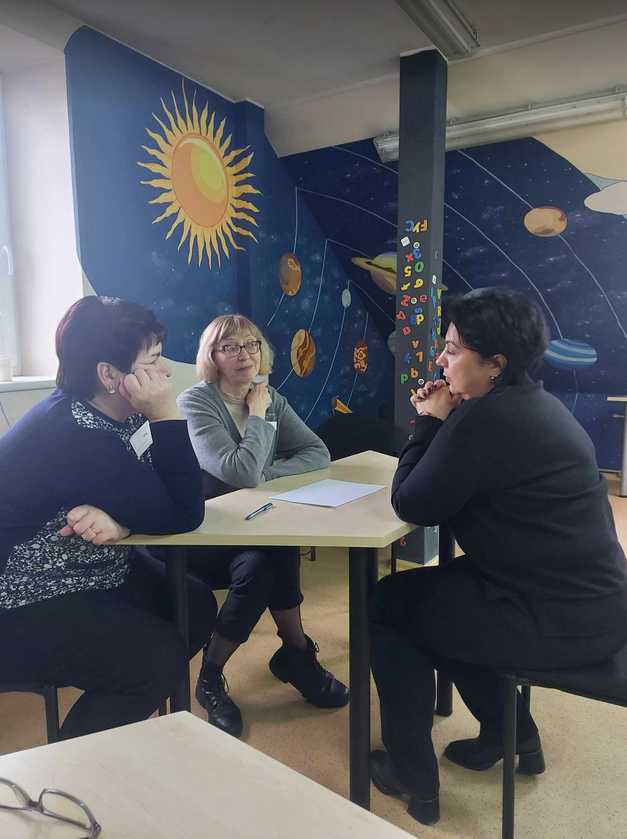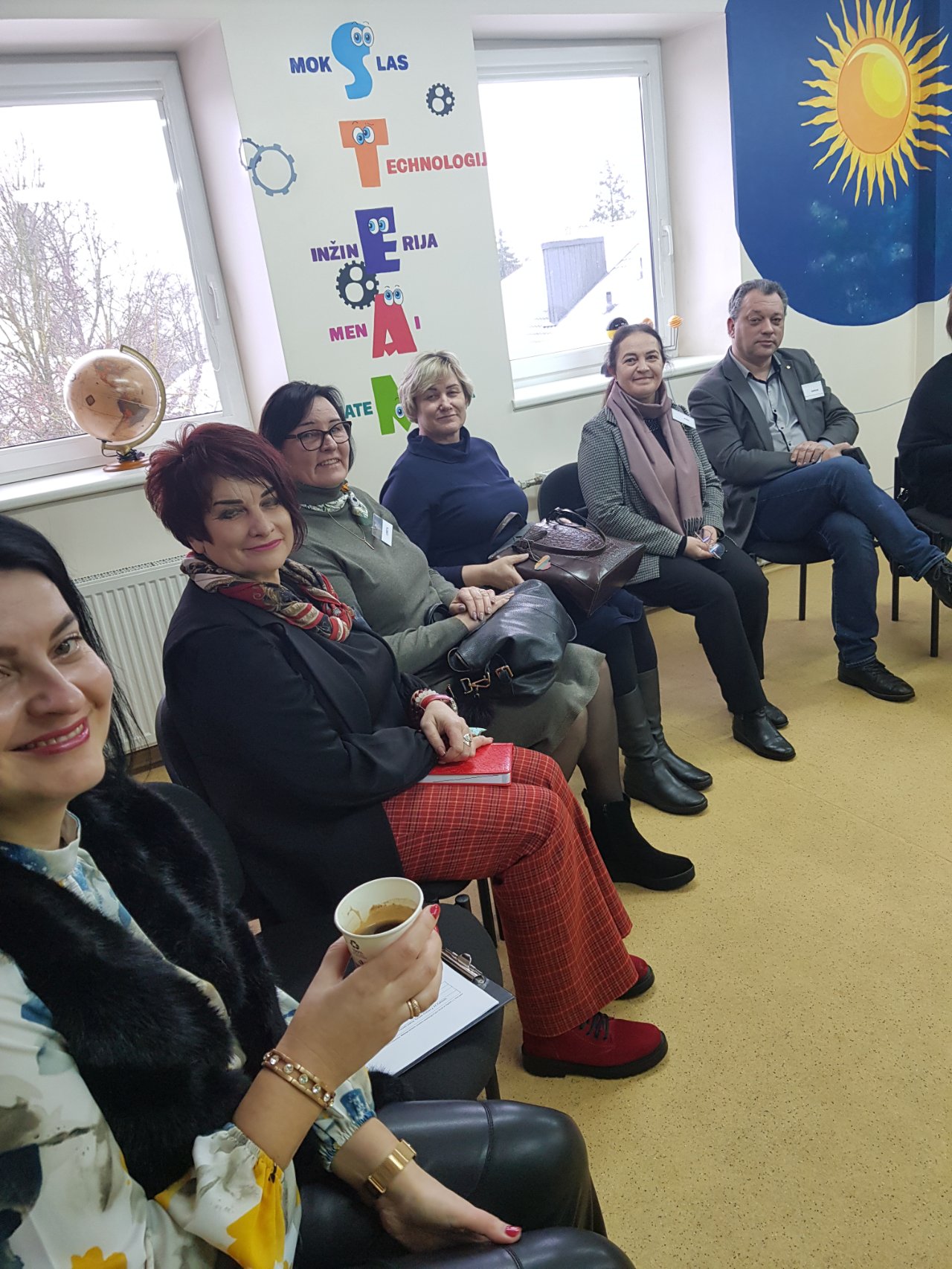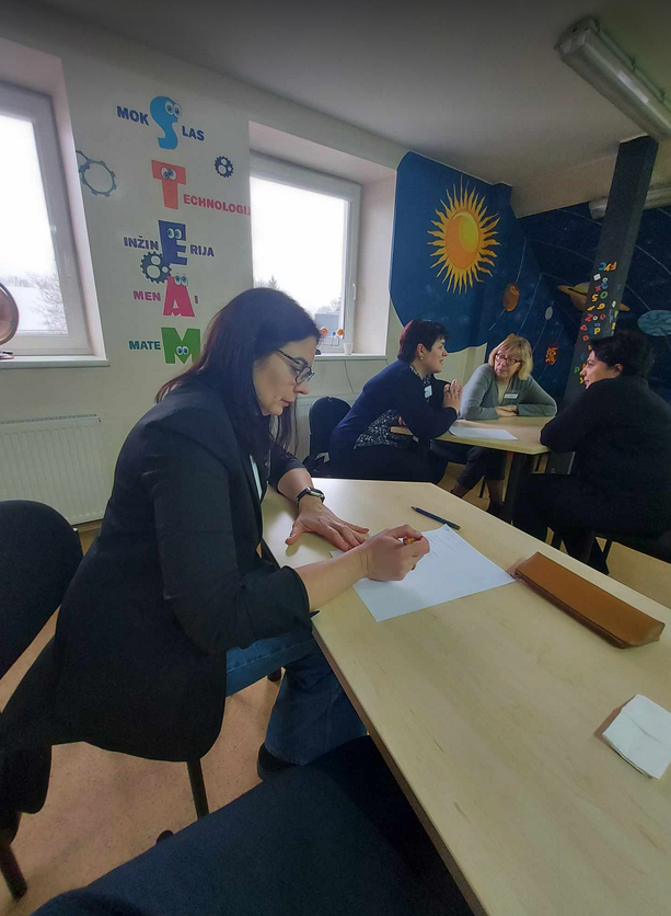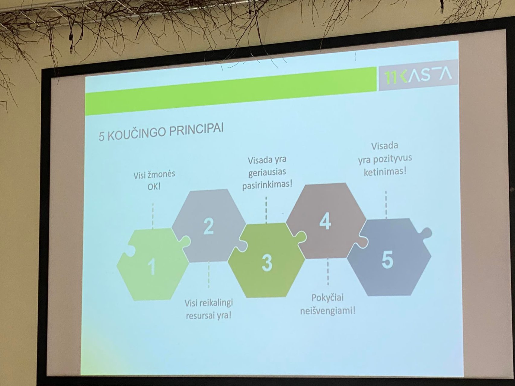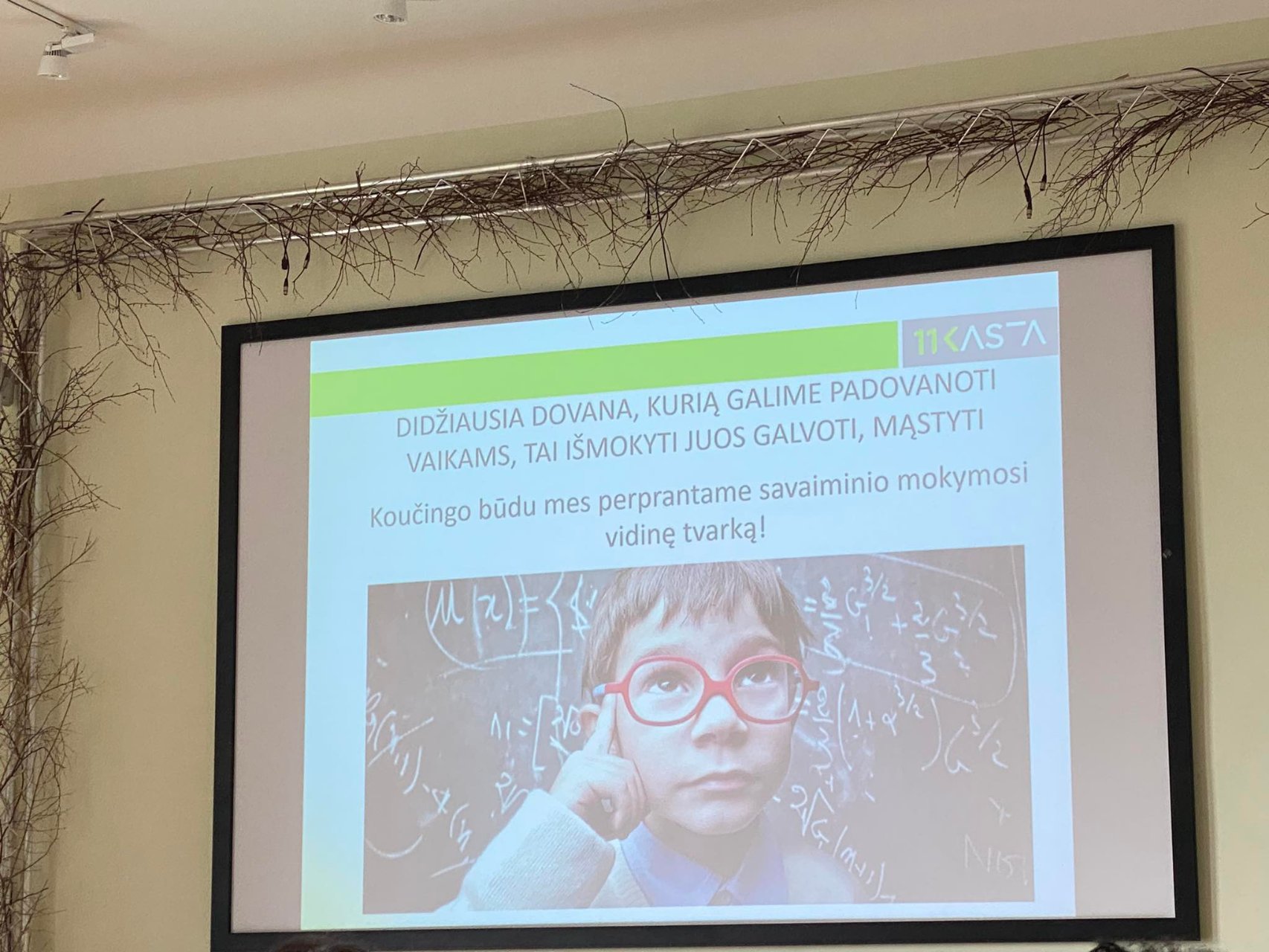 Viešnia pristatė savo ieškojimų ir atradimų kelią, akcentavo, kad lyderystė yra susijusi su žmonėmis, o pirmoji jos mokykla buvo šeima. Lektorė kvietė pamąstyti, kokius žmones galima pavadinti lyderiais. Mokytojai pasiūlė įvairių atsakymų: tai aktyvūs, užburiantys, gebantys dirbti komandoje žmonės, strategai, inicijuojantys pokyčius ir galbūt tėvai (anot lektorė, mūsų prigimtiniai lyderiai). Anot mokymų vedėjos, lyderiu tapti padeda koučingas. Neatsitiktinai svarstyta, kokios savybės: įgimtos ar įgytos, svarbios lyderiui. Galbūt vienintelis pageidautinas lyderio bruožas – charizma. Koučingo specialistė teigė, kad lyderystė visur ir visada kviečia į pokyčius, o ypač švietimo organizacijoje. Buvo įdomu išgirsti, kad pokyčiui sukurti reikalingas tik 3 proc. žmonių palaikymas. Kalbėta ir apie tai, kaip įgalinti sekėjus, įkvėpti juos. Taip pat aptarti ir lyderystės kriterijai: autoritetas, buvimas, poveikis. Pirmiausia būtina prisiminti praeitį (žinias, patirtį), tada svarbu kurti santykį čia ir dabar, saugią aplinką ir veikti, įsipareigoti pokyčiams, pakviesti iššūkiui. Lyderystės lektorė nagrinėjo ir smegenų dalių vaidmenį priimant sprendimus, aptarė 3 mąstymo lygius, kalbėjo apie reptilines, emocines (limbinę sistemą) ir vaizdines (neokorteksą) smegenis, paaiškino, už ką jos atsakingos. Be to, sužinojome, kokie yra 5 koučingo principai, daugeliui įsiminė pirmasis – visi žmonės OK. Be to, mintis, kūnas, emocija visada eina kartu – jungtys labai stiprios. Pavyzdžiui, vienokiu balso tembru galima nuraminti, kitokiu paprašyti priimti sprendimą. Beje, buvo smagu atlikti ne vieną praktinę užduotį – kitaip pabendrauti su kolegomis, aptarti ne tik dalykinį, bet ir asmeninį klausimą – užduotys išlaisvino, kai kurie netgi rado atsakymą į rūpimą klausimą ar išeitį iš problemos. Viešnia remdamasi psichiatro ir psichologo M. Eriksono teorija teigė, kad 98 proc. mūsų kasdieninių patirčių yra teigiamos. Tik žmogus turi įprotį sutelkti dėmesį į tai, kas nepatinka, netinka, kas yra negerai. Liūdna, kad laimės jausmas pamirštamas. Charizmatiška lektorė drąsino pajudėti sprendimo link. Kaip? Išgirdome tokią taisyklę – kitas asmuo yra ne mažiau kaip 10 proc. teisus. Nors vidinis kritikas ir nesutiks, reikia klausyti vidinio išminčiaus, kuris pritars, jam tiks ir patiks. Todėl dažniau pritarkime pašnekovo idėjai, ją papildykime, mąstykime apie sprendimą. Du klausimai, padedantys rasti išeitį: O kas jeigu?, O kas dar? Švietimo organizacijoje labai svarbus vertybių bei įsitikinimų ir rezultatų ryšys, turėtų būti susitarta bent dėl 3-5 bendrų vertybių. Taip pat lektorė kalbėjo ir apie tai, kuo svarbūs 5 komunikavimo lygiai: mandagumas, debatai, dialogas, bendrakūryba (pagal Otto Schamer). Anot viešnios, jei nemokame išlaikyti dialogo, tampame mandagūs arba grįžtame į debatus. Dėl to labai svarbu susikalbėti, tą padaryti padeda reikšmingų žodžių pakartojimas, pabrėžimas to, kas buvo svarbu. Taigi, geri lyderiai daro viską, kad nugalėtojais taptų kiti. Nuoširdžiai dėkojame lyderystės lektorei Asta Blažinskienei už padrąsinimą mėgautis procesu, nes tokiu būdu išvengsime rutinos ir paruošime daugiau erdvės kurti pozityvius pokyčius.