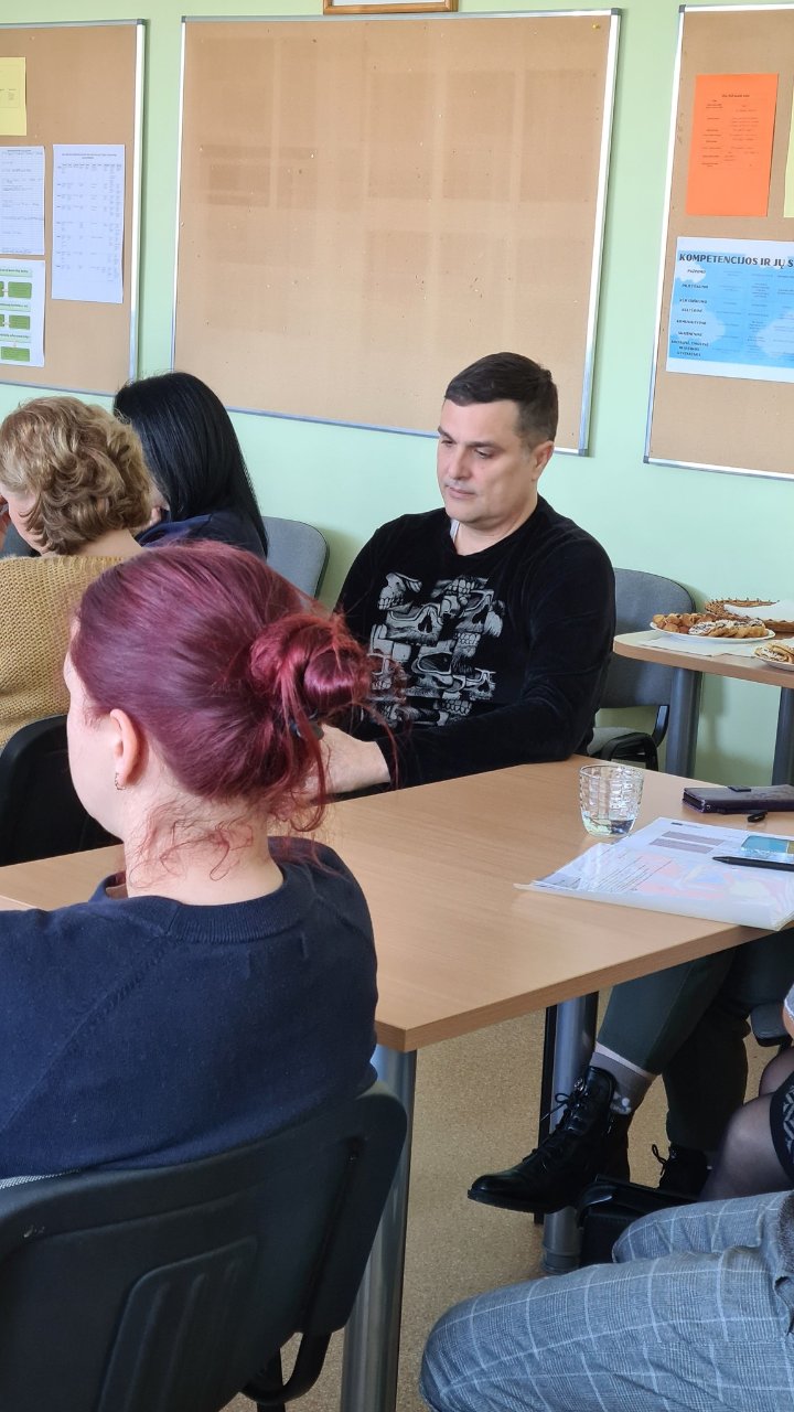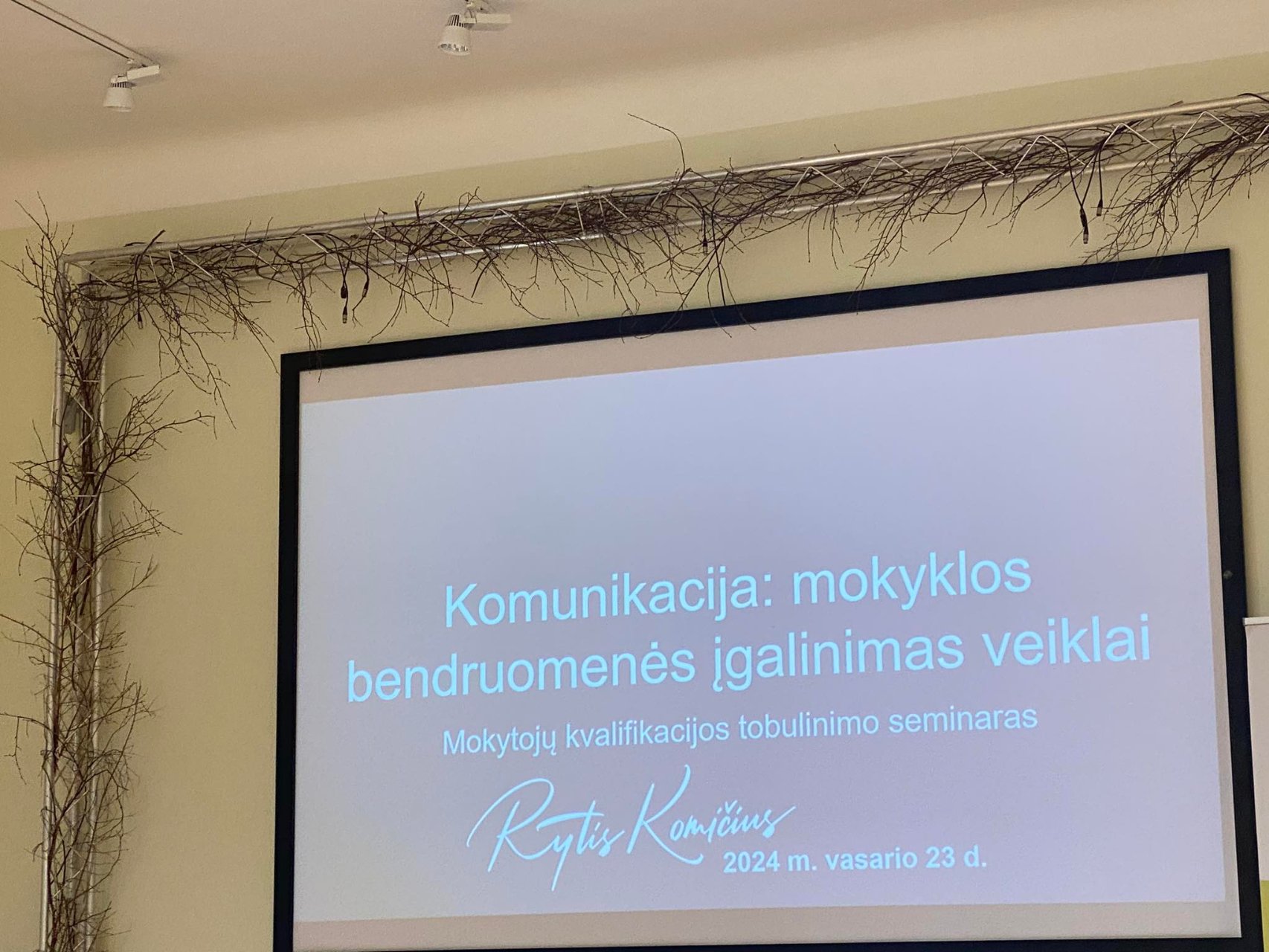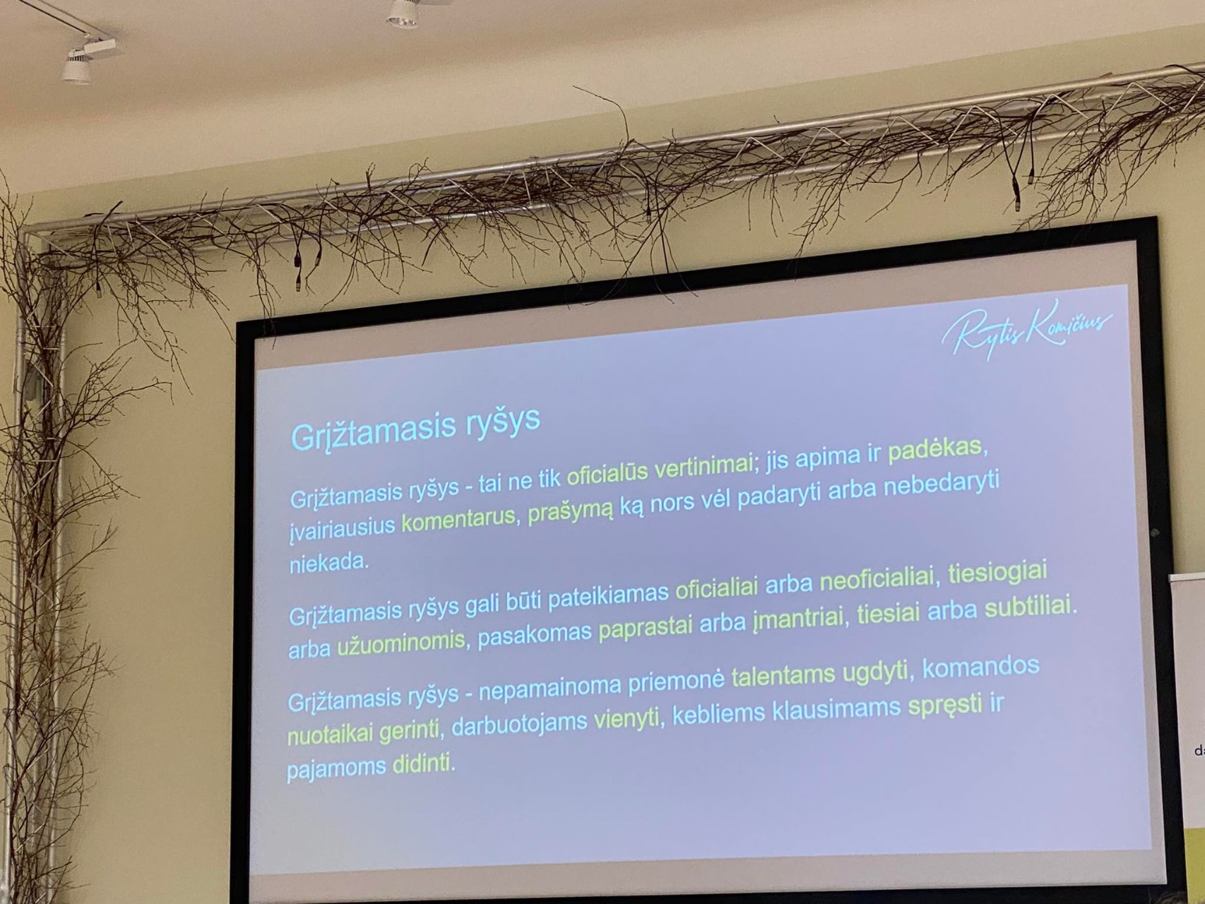 Charizmatiškas mokymų vedėjas trumpai pristatė save, papasakojo apie darbą, studijas, nors jau turi 4 magistro laipsnius, yra ISM doktorantas, tačiau nesustoja, nuolat studijuoja. Pokalbis apie komunikaciją prasidėjo nuo grįžtamojo ryšio sampratos aptarimo. Grįžtamasis ryšys labai svarbus, nes jis stiprina komandos dvasią, kuria pasitikėjimo jausmą vienas kitu, padeda pasiekti geresnių veiklos rezultatų ir pažinti save. Anot mokymų vedėjo, grįžtamojo ryšio teikimas priklauso nuo vadovo vertybių. Lektorius aptarė įvairias žmonių reakcijas, elgesį, paaiškino, koks grįžtamasis ryšys turėtų būti teikiamas konkrečioje situacijoje. Atlikome ir aptarėme kelias skirtingas praktines užduotis. Supratome, kad nėra lengva perprasti santykių sistemą, tinkamai išnarplioti problemą, priimti ir pasiūlyti tinkamą sprendimą. Be to, svečias kalbėjo ir apie manipuliacijas, kokiu būdu galima jas atpažinti, aptarė įvairius vaidmenis (persekiotojas-agresorius, gelbėtojas, auka), kvietė pamąstyti, ar daug yra prisiimančių aukos vaidmenį. Naudinga buvo išgirsti 8 žingsnių taisyklę, ką daryti susidūrus su manipuliacija. Rytis Komičius kalbėjo ir apie konfliktus, kuriuos visada reikia spręsti kuo greičiau, kol neįsisenėjo, be to, lektorius analizavo konfliktų sprendimo strategijas. Praktinė užduotis grupėse „Konflikto bendradarbiaujant sprendimo scenarijus“ leido pažvelgti atidžiau į konfliktų valdymą. Be to, išgirdome ir apie nesmurtinę komunikaciją, kurią reikėtų suprasti kaip bendradarbiavimą, grįstą geranoriškumu ir lygybe, ryšį, paremtą įsiklausymu į vienas kito poreikius ir prašymus, bendravimo procesą, gerinantį tarpusavio supratimą. Mūsų jausmai priklauso nuo nepatenkintų ar patenkintų poreikių. Mokymų vedėjas pabrėžė, kad mes gebame tenkinti vieni kitų poreikius, o ryšys yra mūsų gerovės esminis šaltinis. Be to, netgi naudinga prašyti kito žmogaus grįžtamojo ryšio, nes asmuo ugdosi kritinį mąstymą, nuomonės raišką, jaučiasi gerbiamas. Praktinė užduotis leido pasirinkti konkrečią situaciją ir apmąstyti grįžtamojo ryšio svarbą ir naudą savo mokykloje. Svečias pateikė metodiką ir akcentavo klausimų tinkamumą. Nuoširdžiai dėkojame lektoriui Ryčiui Komičiui už kryptį, kaip veikti, kad grįžtamasis ryšys paskatintų mokyklos bendruomenę eiti pozityvios kaitos link.
