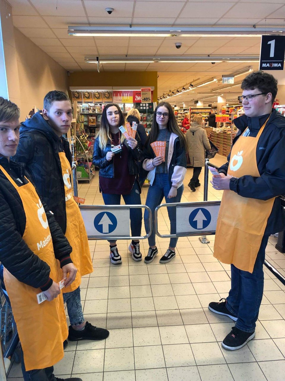 Dalydami skrajutes mokiniai kvietė paaukoti maisto skurstantiems senyvo amžiaus žmonėms ir vargingai gyvenančių šeimų vaikams.