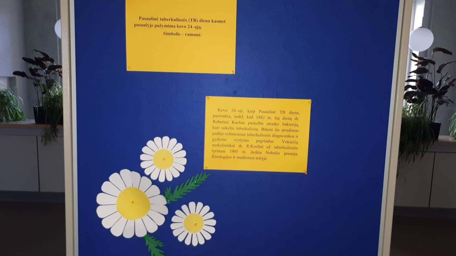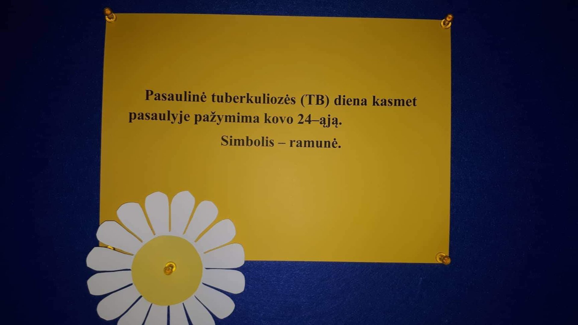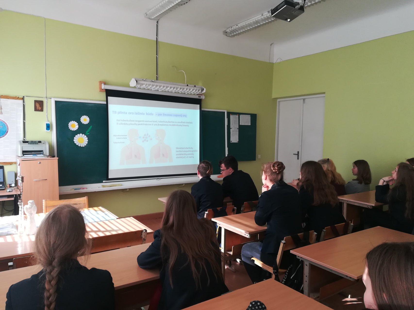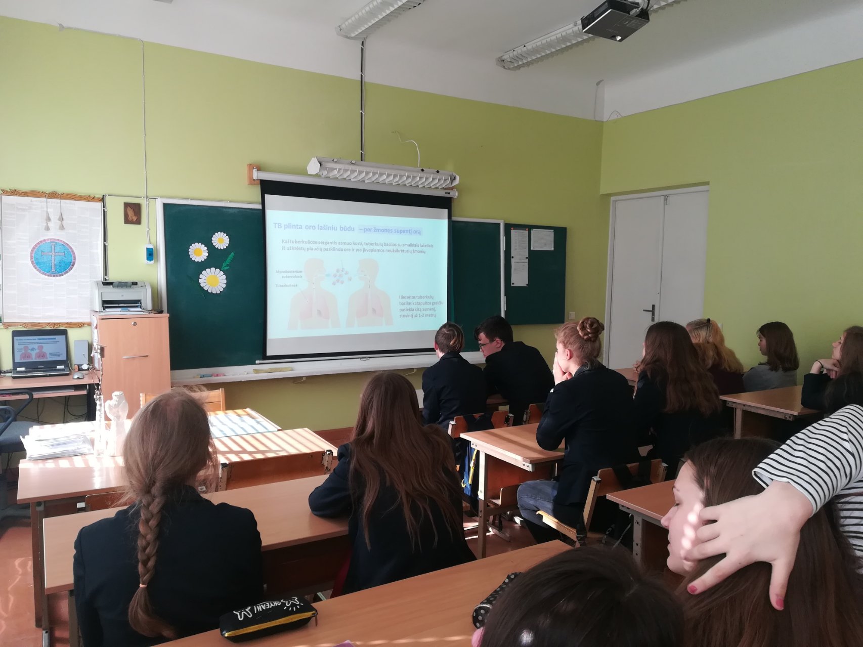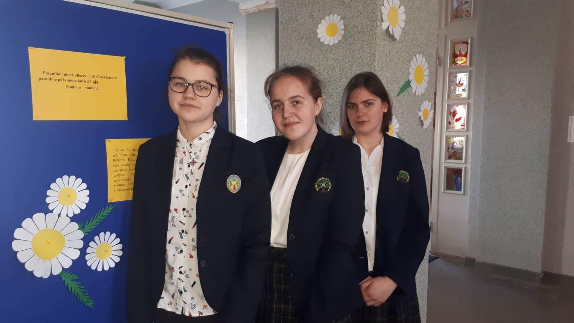 Kovo 22 d. gimnazijos samariečiai mokyklos fojė papuošė ramunėmis – tuberkuliozės simboliu. Mokiniai susipažino su ULAC direktoriaus prof. dr. Sauliaus Čaplinsko vaizdine priemone „ABC apie TB“ ir klausėsi ULAC Epidemiologinės priežiūros skyriaus visuomenės sveikatos specialistės Joanos Korabliovienės paskaitos „Tuberkuliozės istorija“.