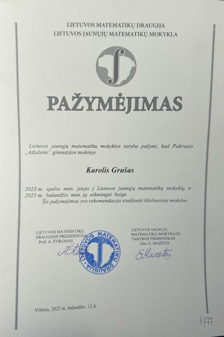 Šių metų baigiamajame konkurse dalyviams buvo pateiktos keturios užduotys, kiekviena jų vertinta vienu tašku. Uždaviniams išspręsti skirta viena valanda. Karolis Grušas pademonstravo puikų pasiruošimą ir surinko visus 4 taškus iš 4 galimų, o Greta Gudaitė – 3,5 taško. Džiaugiamės savo pasiekimais, galimybe dalyvauti šiame renginyje, gauti baigimo pažymėjimus bei susipažinti su bendraminčiais iš visos Lietuvos. Veiklos LJMM padeda mokiniams įgyti tvirtus matematikos pagrindus, reikalingus tolimesnėms studijoms aukštosiose mokyklose bei supažindina su įdomesniais ir netradiciniais matematikos taikymais.