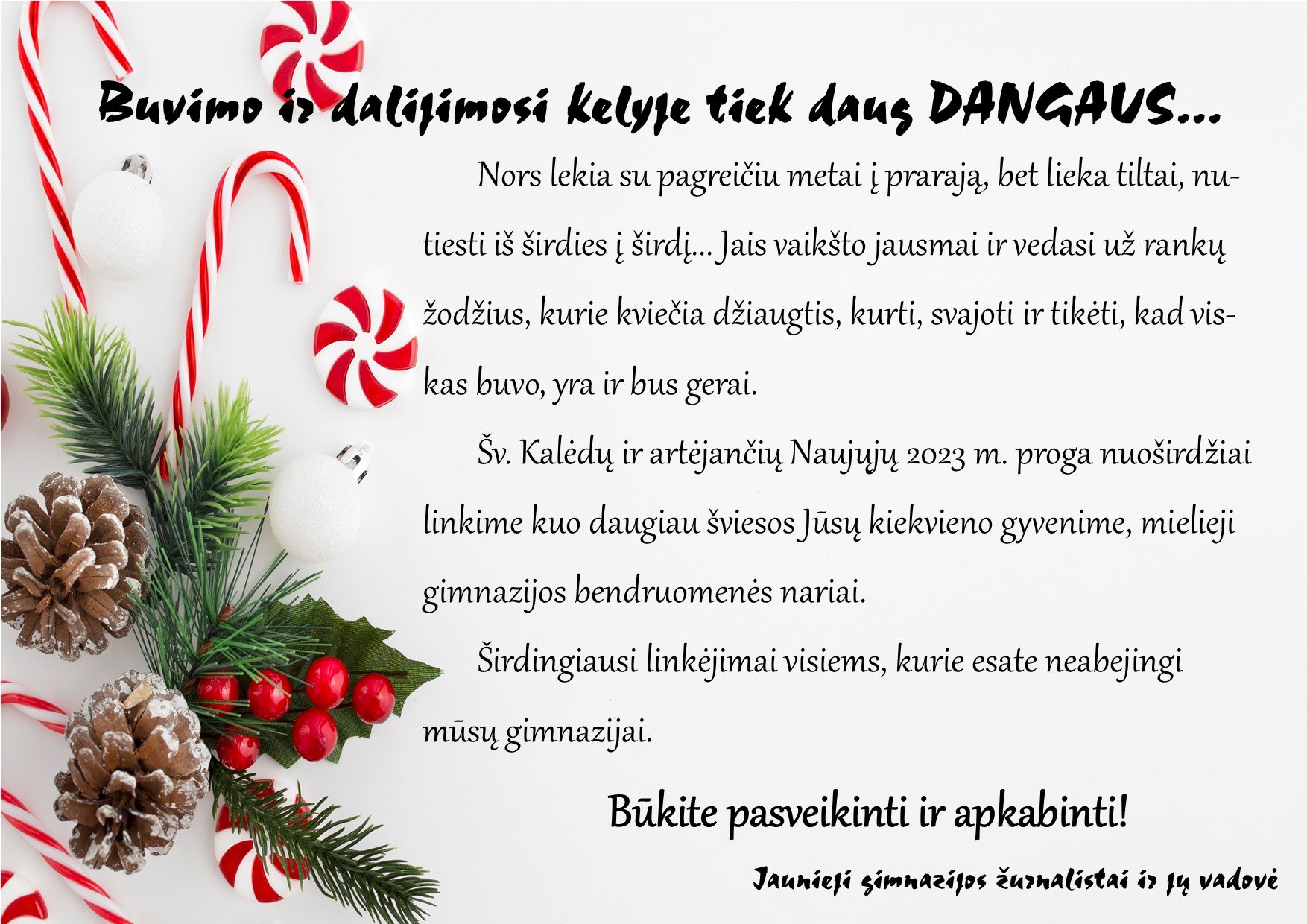 Kol tyliai vieni į kitų širdis tiesiame kelius ir linkime ramaus advento, iš tiesų gera prisiminti įvairius renginius, sutiktus žmones, išmoktas pamokas. Atsigręžę atgal suprantame, kad gimnazijoje ne tik mokomės, bet ir galime susipažinti su įdomiomis asmenybėmis, mąstyti apie savo būsimą gyvenimo kelią. Kaip smagu, kad į gimnaziją po daugelio metų sugrįžta buvę mokiniai, be to, sulaukiame ir svečių, kurie noriai pasidalija savo patirtimi.
