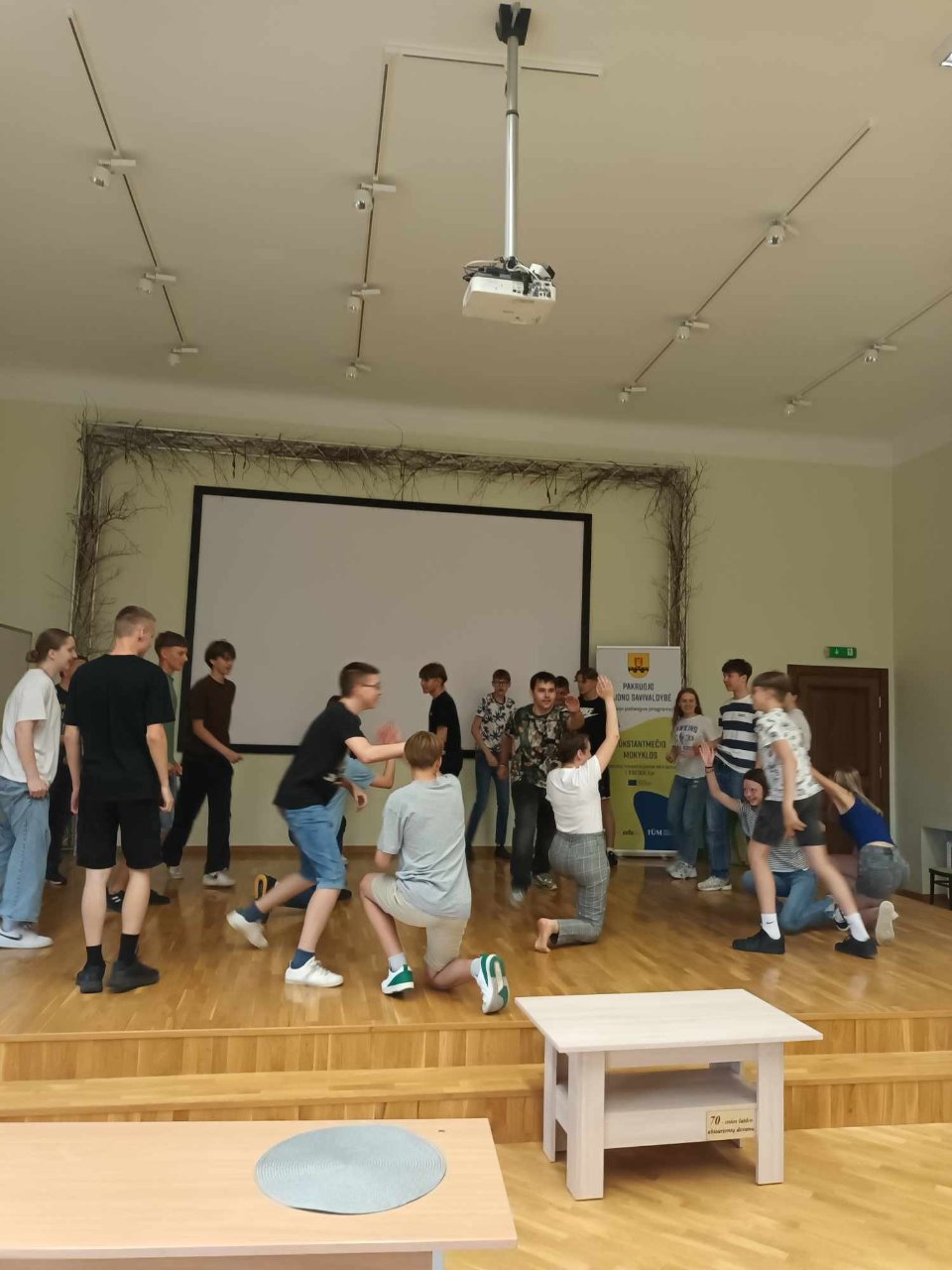 Trečiokės Greta Gudaitė, Oresta Bitaitytė, Greta Balčiūnaitė ir Gabija Šapokaitė įgyvendino darnios gyvenamosios aplinkos projektą. Gimnazistės sukūrė dviračių transporto priemonių stoginės ir automobilių stovėjimo aikštelės maketus bei atliko automobilių aikštelės testavimą. Išanalizavus rezultatus ir gimnazijos bendruomenės poreikį, bus atliktas automobilių stovėjimo aikštelės žymėjimas, o dviračių transporto priemonių stoginė jau įrengta gimnazijos kiemelyje.