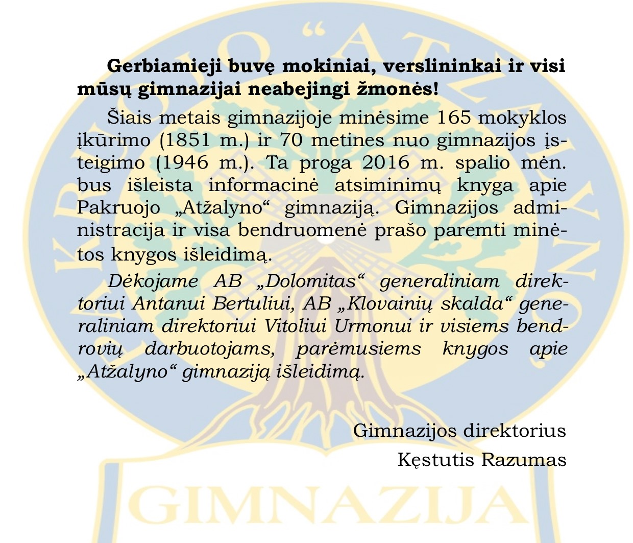 Paskutiniai mokslo metai čia, Pakruojo „Atžalyno“ gimnazijoje. Kaip niekad ši džiaugsmo ir nekantrumo diena prasidėjo džiugiai, nes nuotaiką kėlė kaskart pasirodantys ir šildantys saulės spinduliai. Rugsėjo 1 – osios šventę pradėjome tradiciškai – Pakruojo šv. Jono Krikštytojo bažnyčioje šv. Mišiomis. Šį kartą Dekano Kun. R. Čekavičiaus žodžiai skambėjo kitaip: prasmingiau, įdomiau, svarbiau. Klausiausi širdimi, stengiausi įsigilinti ir suprasti akcentuotas frazes apie mokslą, išmintį, dvasinį tobulėjimą ir jų svarbą. Bažnyčią palikome ramesne dvasia ir nuskubėjome į gimnaziją. Ten mus pasitiko trečiokai ir šventė tęsėsi sporto salėje. Naujųjų mokslo metų proga mus pasveikinti atvyko garbių svečių, kurie išsakė nuoširdžių ir šiltų palinkėjimų, verčiančių susimąstyti. Gimnazijos direktorius K. Razumas taip pat sveikino abiturientus, gimnazistus ir mokytojus naujųjų mokslo metų pradžios proga. Vadovas dėkojo sportininkams, olimpiadų laimėtojams, aktyviems gimnazistams, garsinantiems gimnazijos vardą. Šiandien mes atvertėme naują, švarų, bet ir paskutinį šios gimnazijos knygos puslapį. Kaip ir buvo linkėta, stengsimės, kad šis puslapis būtų įdomus ir reikšmingas. Būtinai sieksime savų tikslų, tobulėsime, įgyvendinsime tai, ko trokštame. Baigėsi Rugsėjo 1 – osios šventė, kuri atvėrė naujų žinių, pasiekimų, kūrybos bei svarbių pokyčių duris... Visiems sėkmingos pradžios.