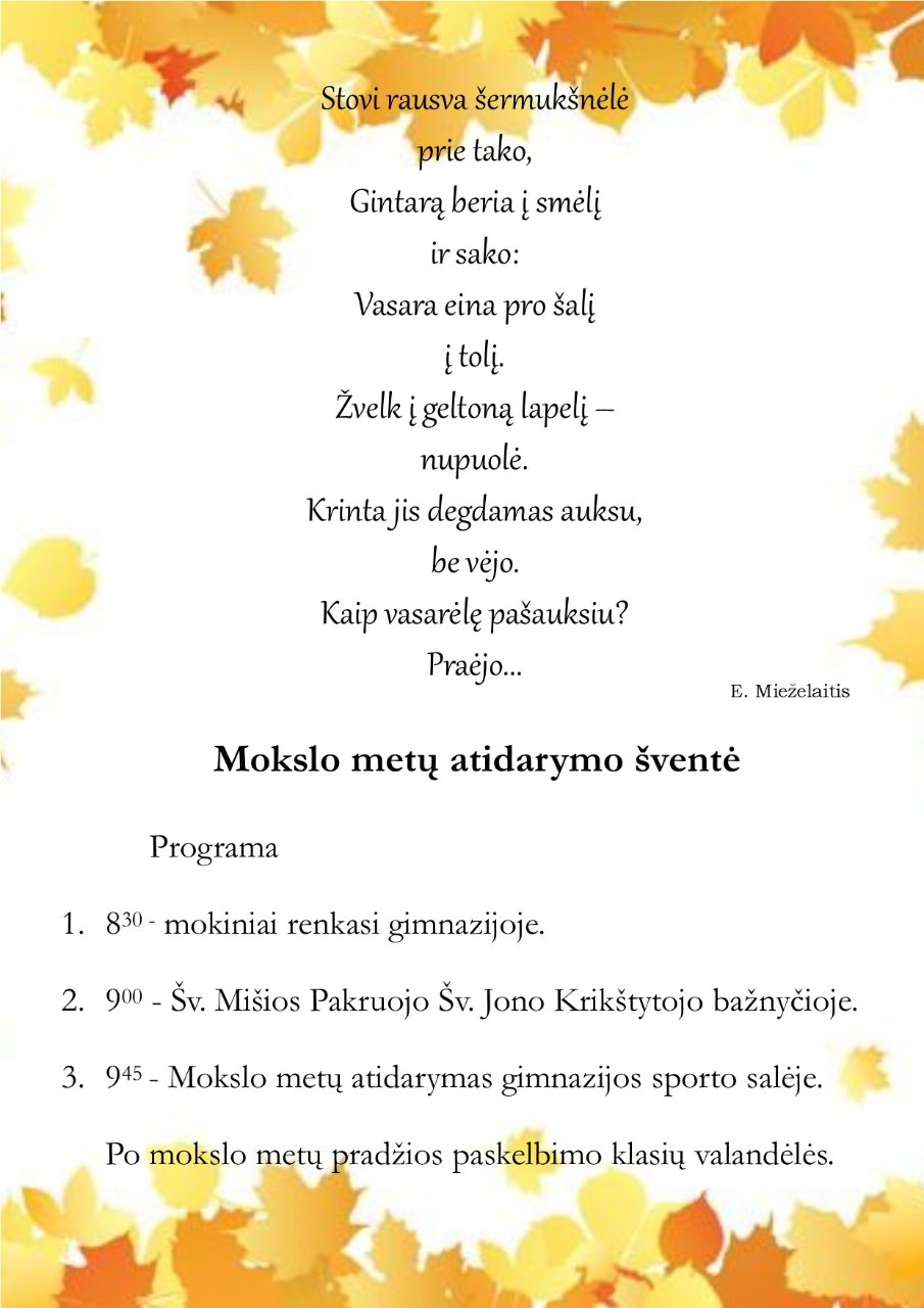Nuostabus oras kvietė visus pasidžiaugti Rugsėjo 1-osios švente: keliauti į šv. Mišias, stebėti besidraikantį voratinklio lengvumą, skrendantį pūką, mokykloje klausytis palinkėjimų ir suvokti, kad ruduo – tai branda ir pilnatvė. Mokytojai tikisi dosniai dalytis džiaugsmu ir meile, jie vėl pasiruošę ugdyti, brandinti, auginti. Gimnazijos vadovai pasiryžę bendrauti ir bendradarbiauti, kad visi kartu sukurtume tobulą gimnazijos būtį. Auklėtojos su jauduliu laukė susitikimo su auklėtiniais.