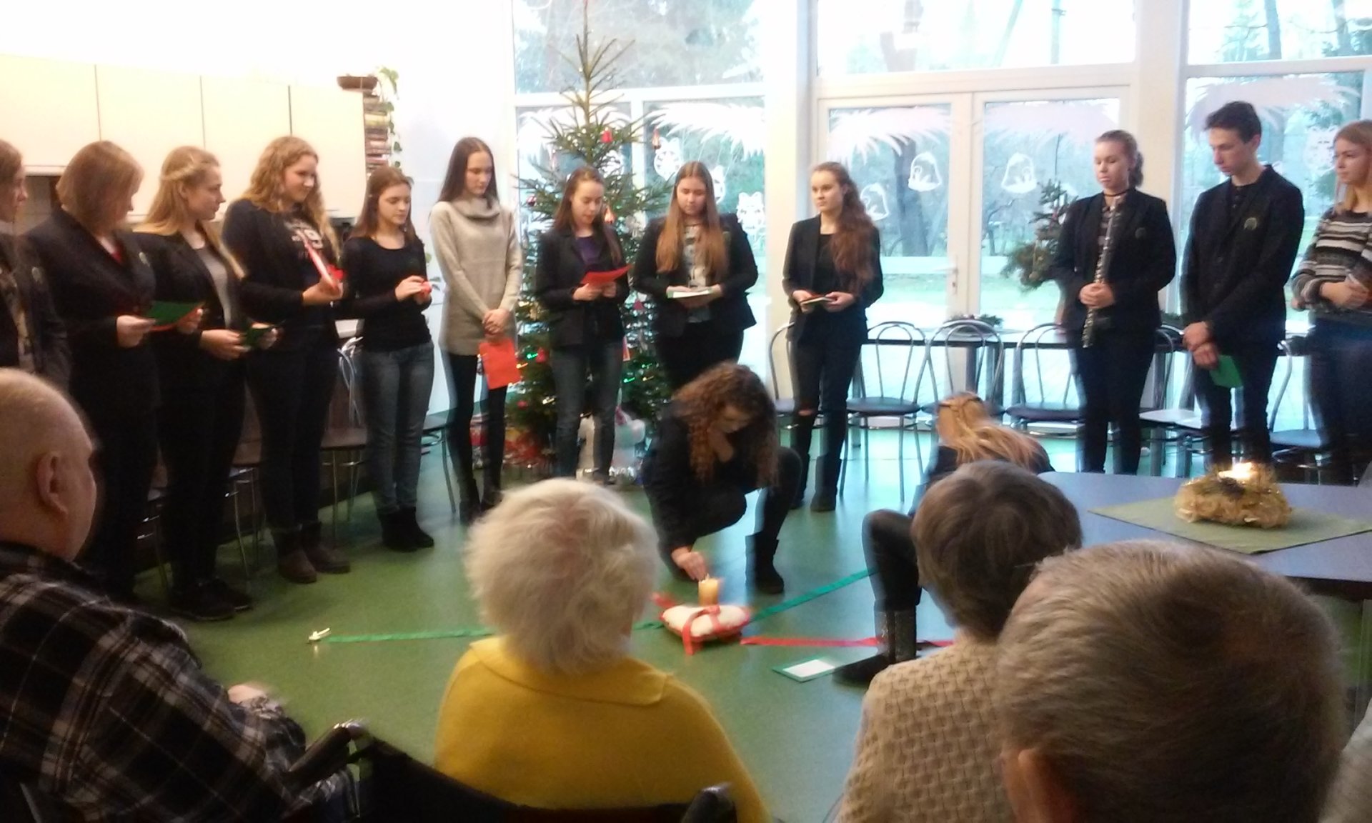 Gruodžio pabaigoje prikūrę įvairių kalėdinių atvirukų, paruošę kompoziciją „Esame palaiminti...“, iškepę keksiukų bei imbierinių sausainių nuvykome į Rozalimo Švč. M. Marijos Vardo parapijos senjorų namus. Buvome be galo laimingi galėję bent šiek tiek pabūti su žmonėmis, kurių akys ilgisi bendrystės ir šilumos. Senoliai troško dainų, šokių ir atrodė, kad širdyse jie vis dar vaikai.