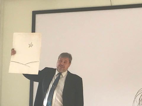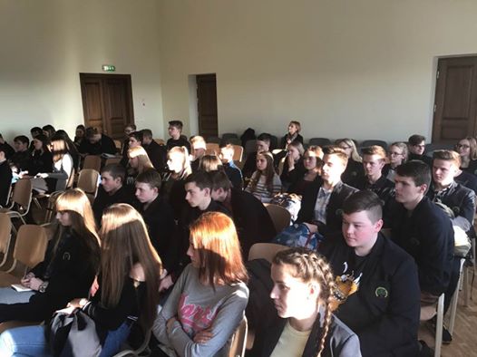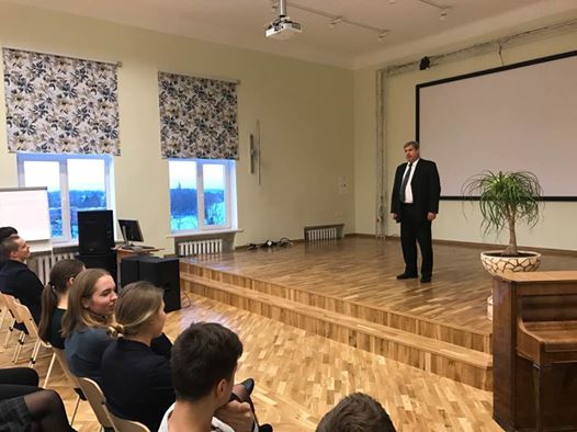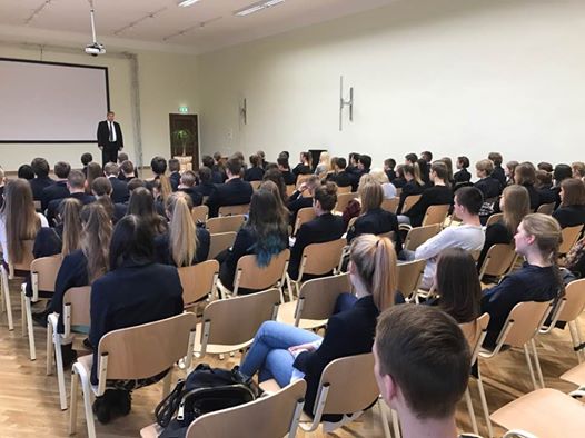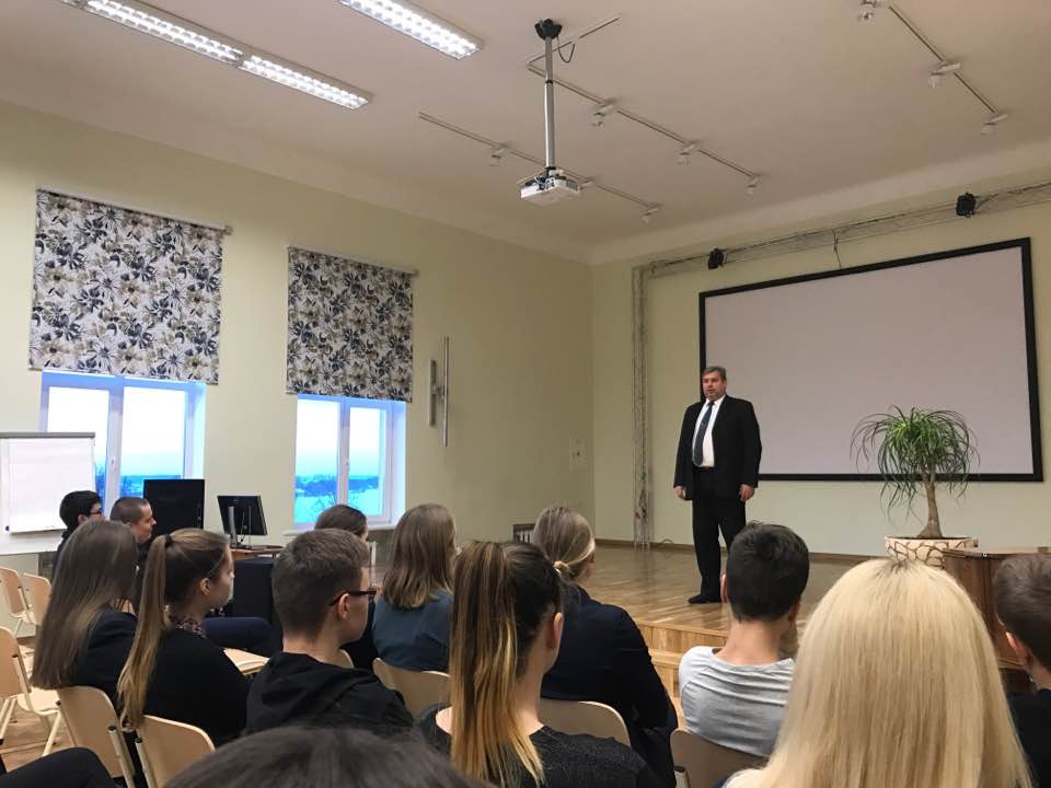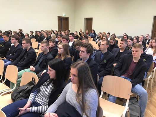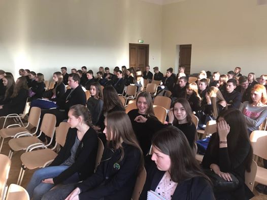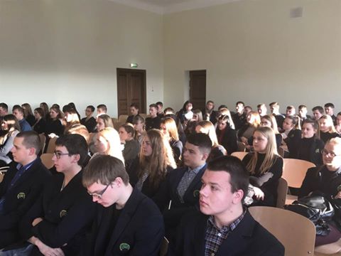 2017-01-10 gimnazistai su gimtosios kalbos ir literatūros mokytojomis rinkosi į konferencijų ir posėdžių salę, kur vyko susitikimas su skaitovu Raimundu Lukšu.