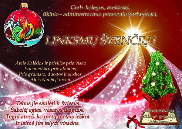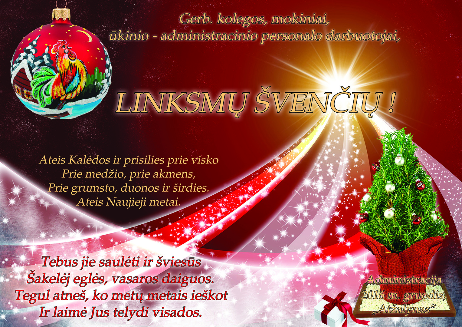 Kupini tyro vidinio džiaugsmo ieškokime susikalbėjimo žodžių ir jungiančios tylos. Kristaus gimimo šventės džiaugsmą kurkime iš meilės, žvilgsnių, žodžių, gerų ir nesumeluotų. Nuoširdžiai linkime dieviškos malonės, žmogiškos vilties, širdies šilumos, švelnumo ir į mus keliaujančios paslapties... Vidinės ramybės ir viltingo šv. Kalėdų ryto ir laimingų Naujųjų 2017 metų!