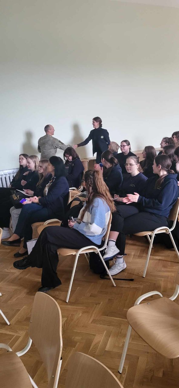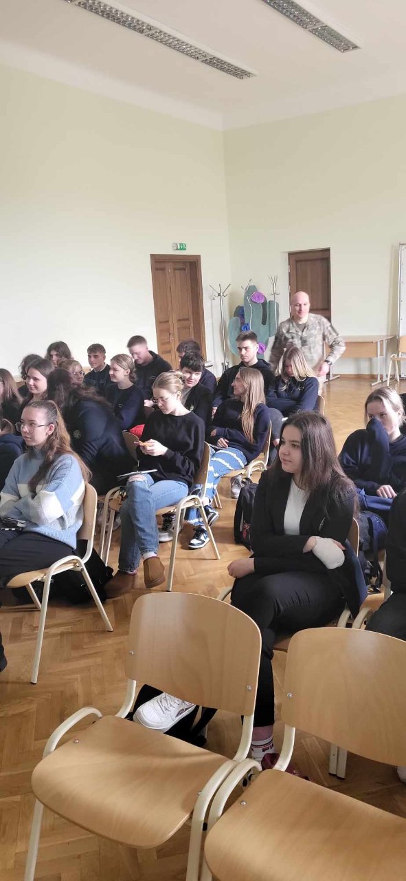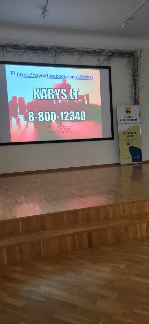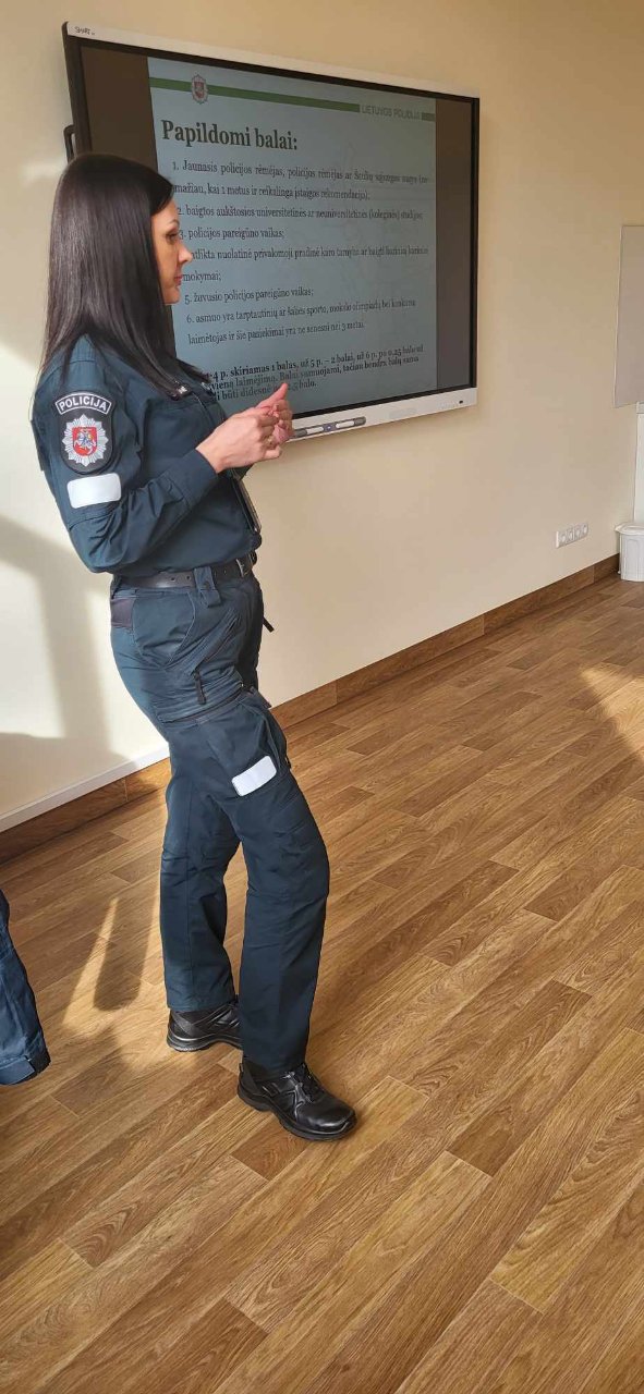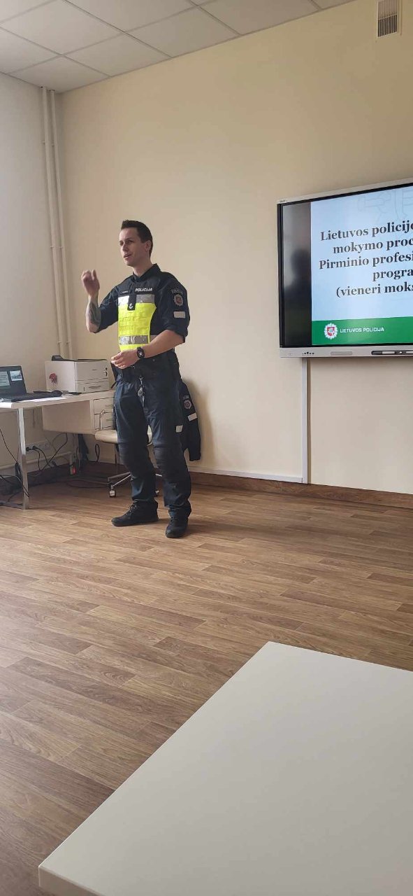 Kovo 12-14 dienomis su abiturientais susitiko Pakruojo rajono bendruomenės pareigūnai Nida Morkūnė ir Danielius Budrys. Svečiai supažindino ketvirtokus su policininko profesija, išvardijo būtinus mokomuosius dalykus, papasakojo apie stojimo galimybes. Beje, jie akcentavo nepriekaištingą reputaciją, kuri ypač svarbi ne tik tiems, kurie mąsto apie policininko kelią, bet ir valstybės tarnautojams ar privataus sektoriaus darbuotojams. Be to, pareigūnai priminė, kad dokumentus į Policijos mokyklą galima teikti nuo vasario 1 d. iki birželio 12 d.