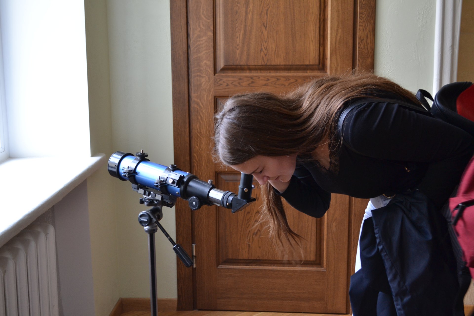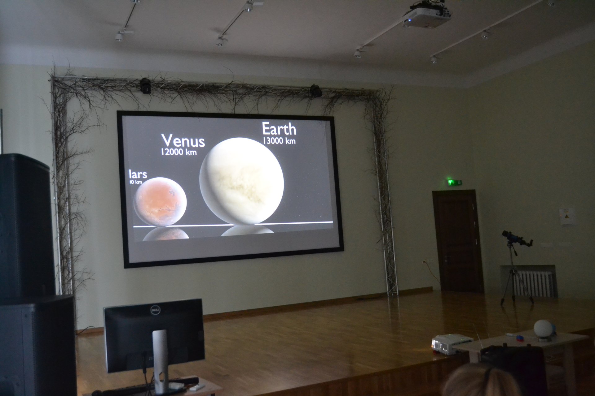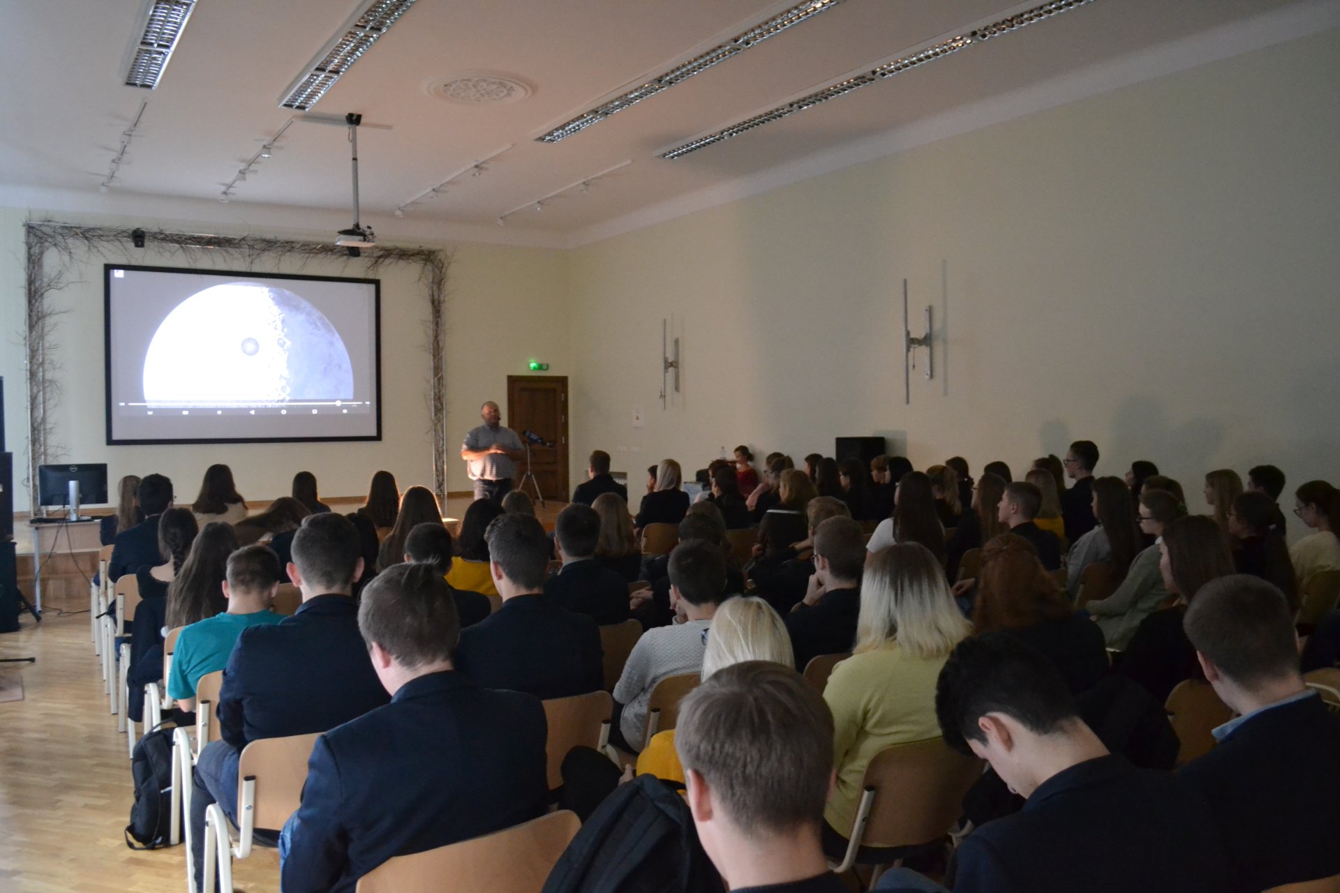 Pirmadienį posėdžių ir konferencijų salėje vyko susitikimas su Simu Šatkausku, ilgamečiu astronomijos entuziastu, praktiku, publikuojančiu astronominių stebėjimų rezultatus viešai pasiekiamose erdvėse. Mokiniai galėjo patyrinėti dangaus kūnus, palyginti jų dydžius. Jie sužinojo apie astronominius reiškinius, klausėsi visatos objektų skleidžiamų garsų. Taip pat buvo priminti šviesos greičio ir šviesmečio apibrėžimai. Baigiantis pamokai visi užsidėjo virtualiosios realybės akinius ir iš arti stebėjo planetas. Be to, gimnazistai smalsiai žiūrėjo pro teleskopą, suprato jo veikimo principą, sužinojo atstumą nuo žemės iki kosmoso. Svečias papasakojo įdomių faktų apie šventes, jų kilmę iš kosmoso. Tai buvo puiki patirtis, nes mokiniai, kupini įspūdžių, išėjo iš salės.