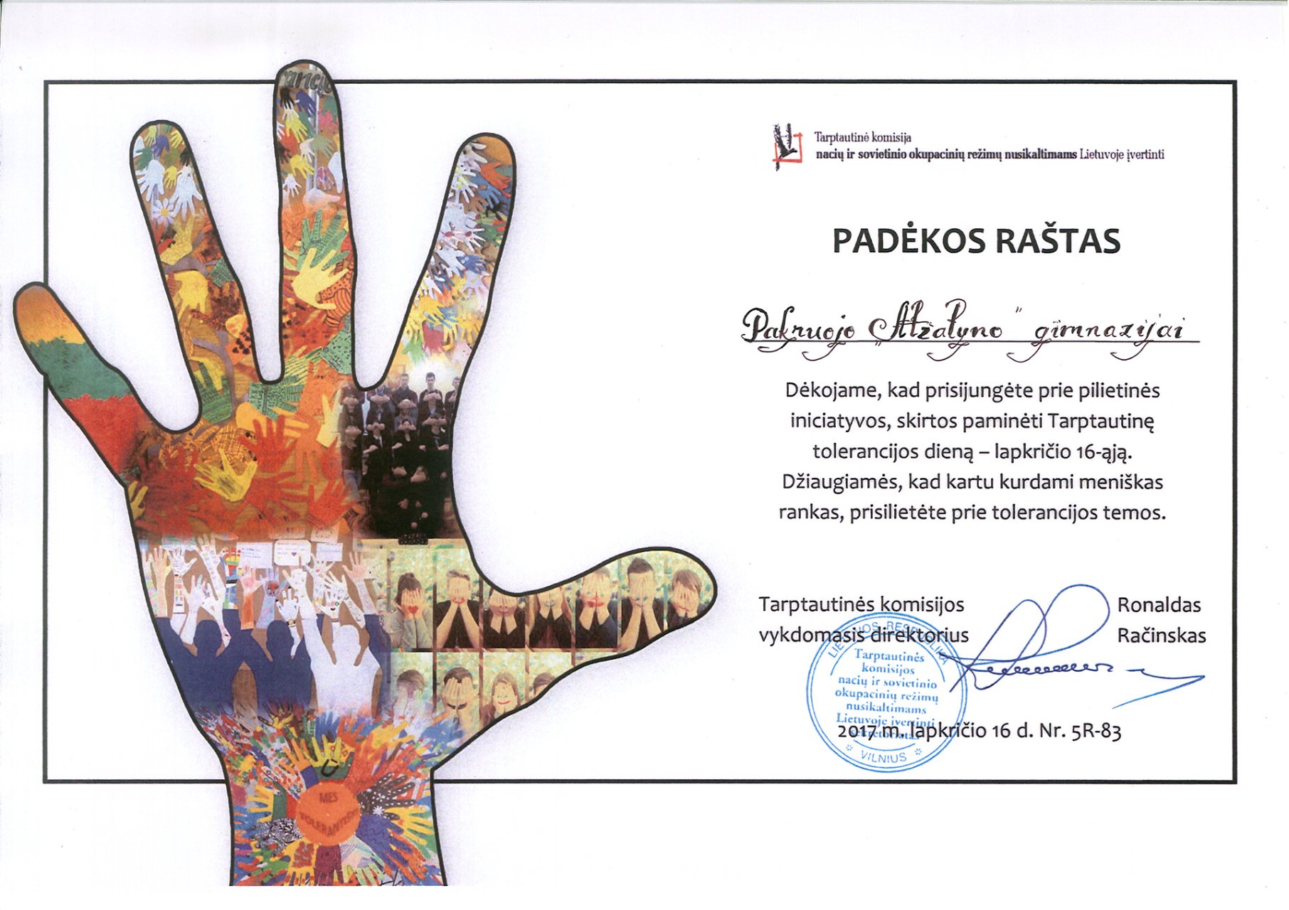Už dalyvavimą pilietinėje iniciatyvoje, skirtoje lapkričio 16-ąją paminėti Tarptautinę tolerancijos dieną, gimnazija apdovanota padėkos raštu, kurį atsiuntė Tarptautinė istorinio teisingumo komisija.