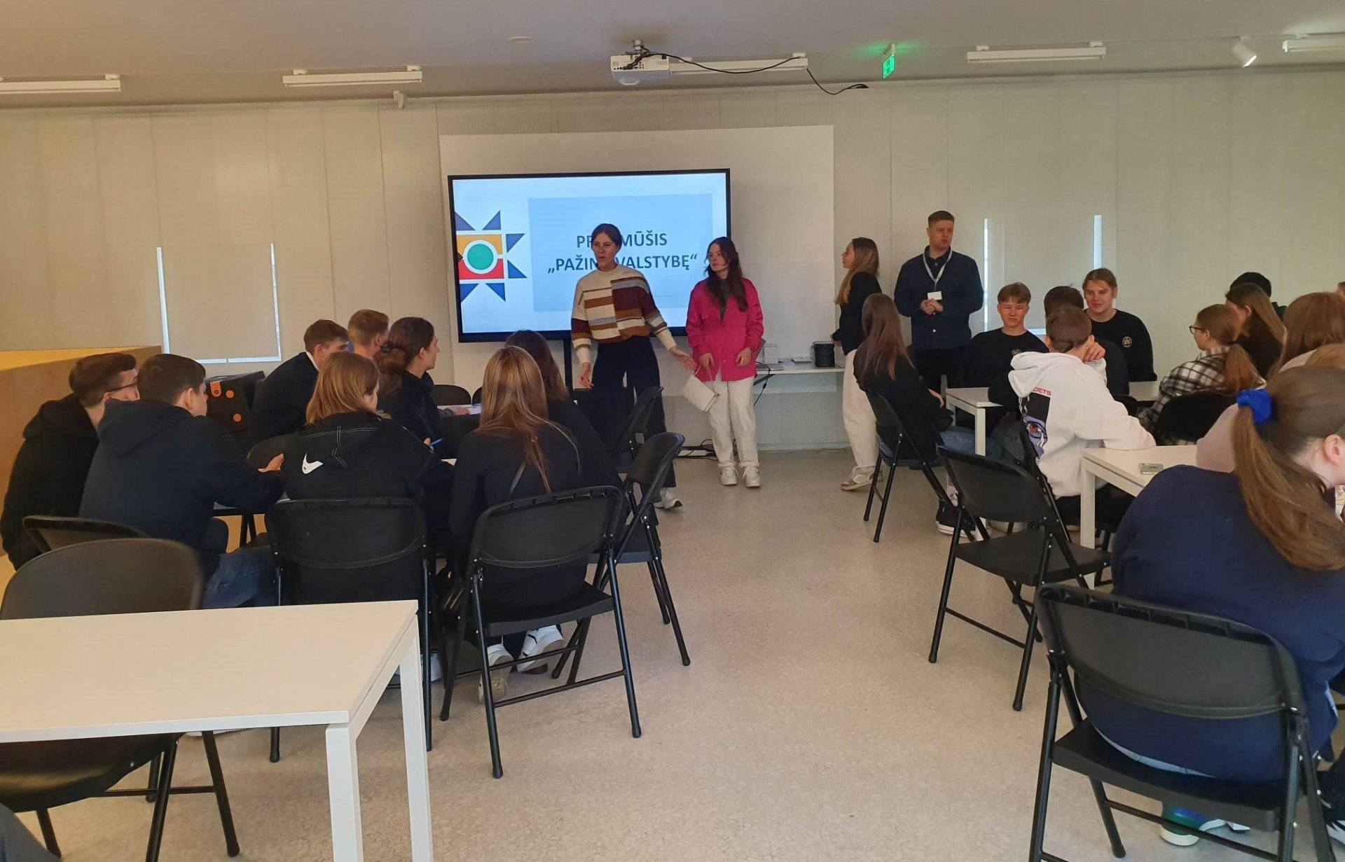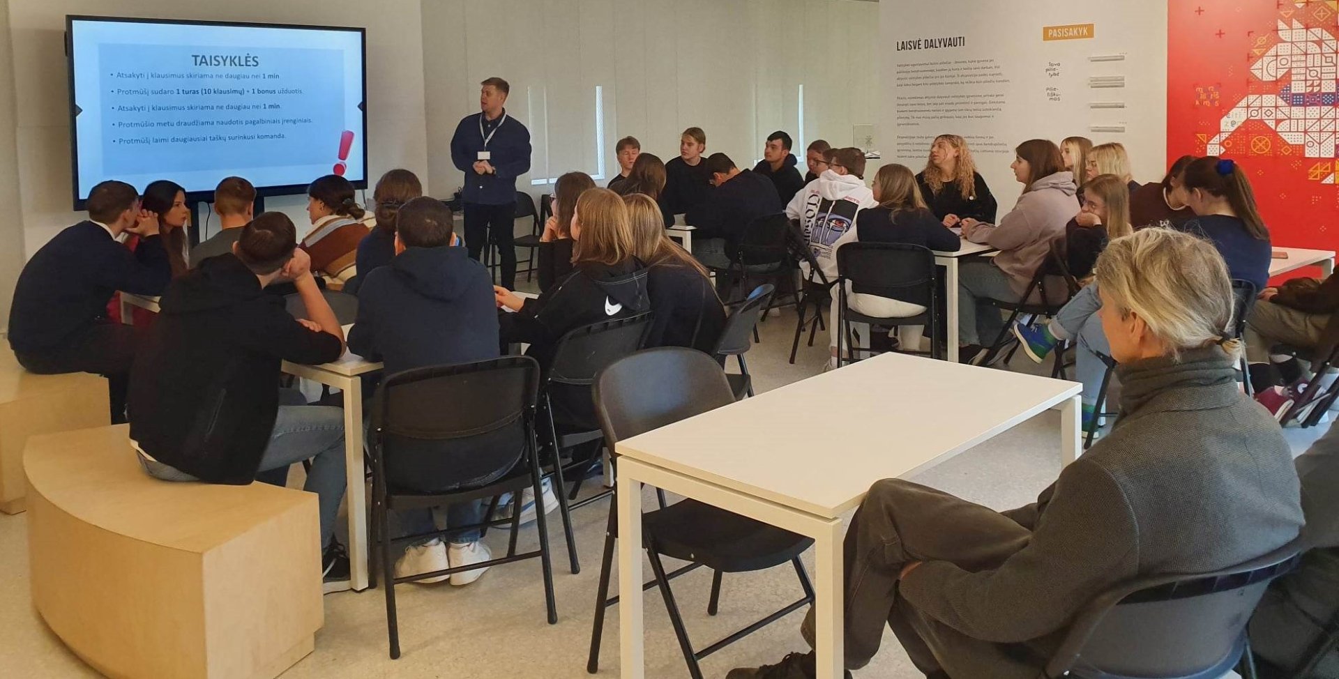 Po mugės mokiniai grįžo į Kultūros centrą ir klausėsi paskaitos: „Startuolio kūrimas ir valdymas“, kurią skaitė Saulėtekio slėnio mokslo ir technologijų parko lektorius Laurynas Braškus.