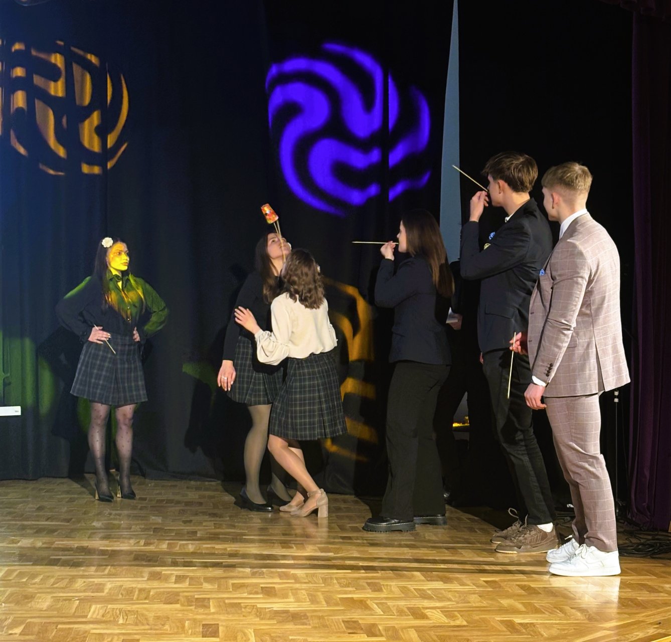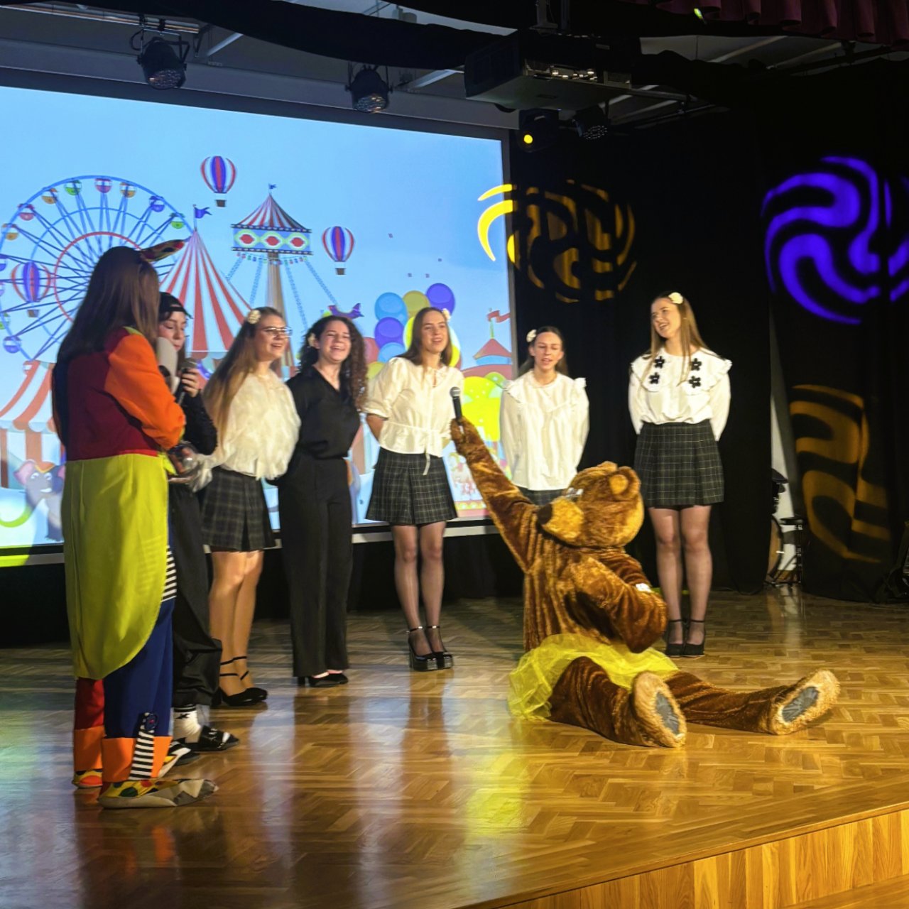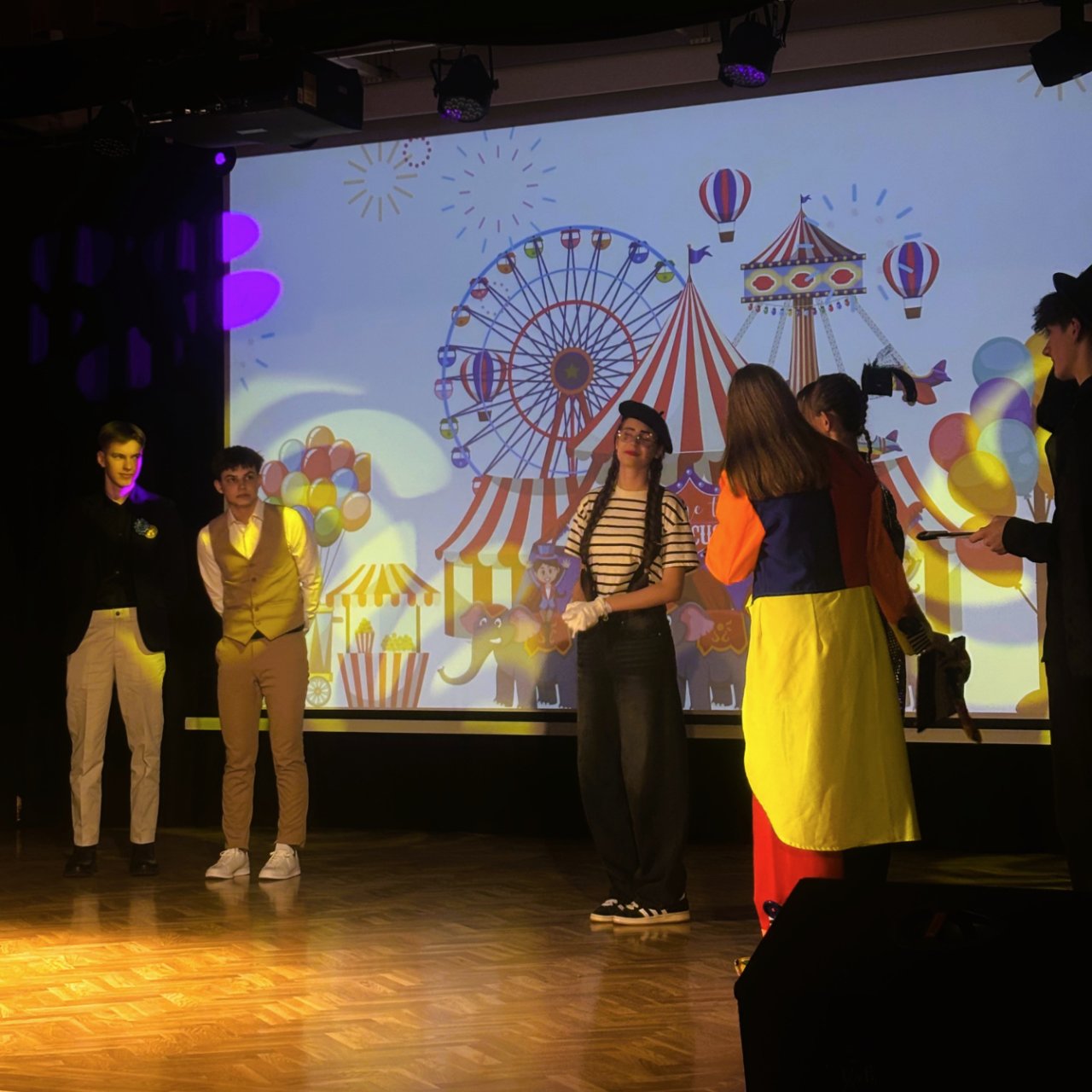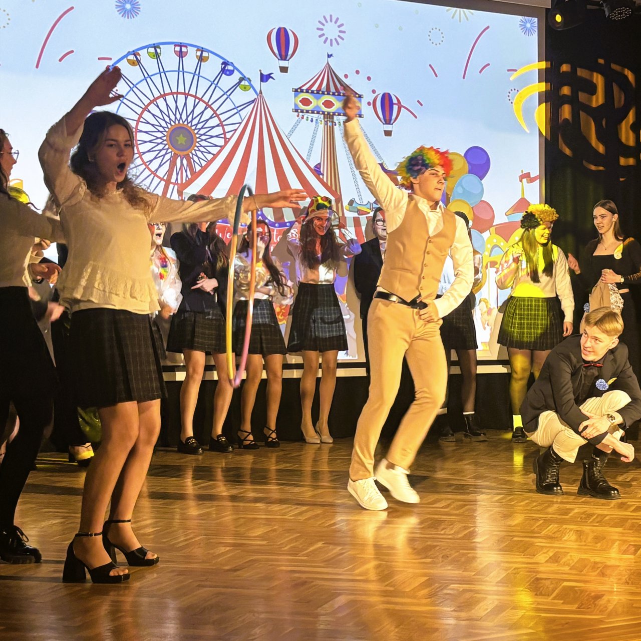 Šventės vedėjai – klounas, akrobatė ir magas – pradėjo renginį nuotaikingais pasirodymais. Klounas pasveikino visus susirinkusius, o magas priminė, kad iki mokyklos baigimo liko tik 100 dienų, per kurias dar galima juoktis, kurti prisiminimus ir mėgautis paskutinėmis mokslo metų akimirkomis.