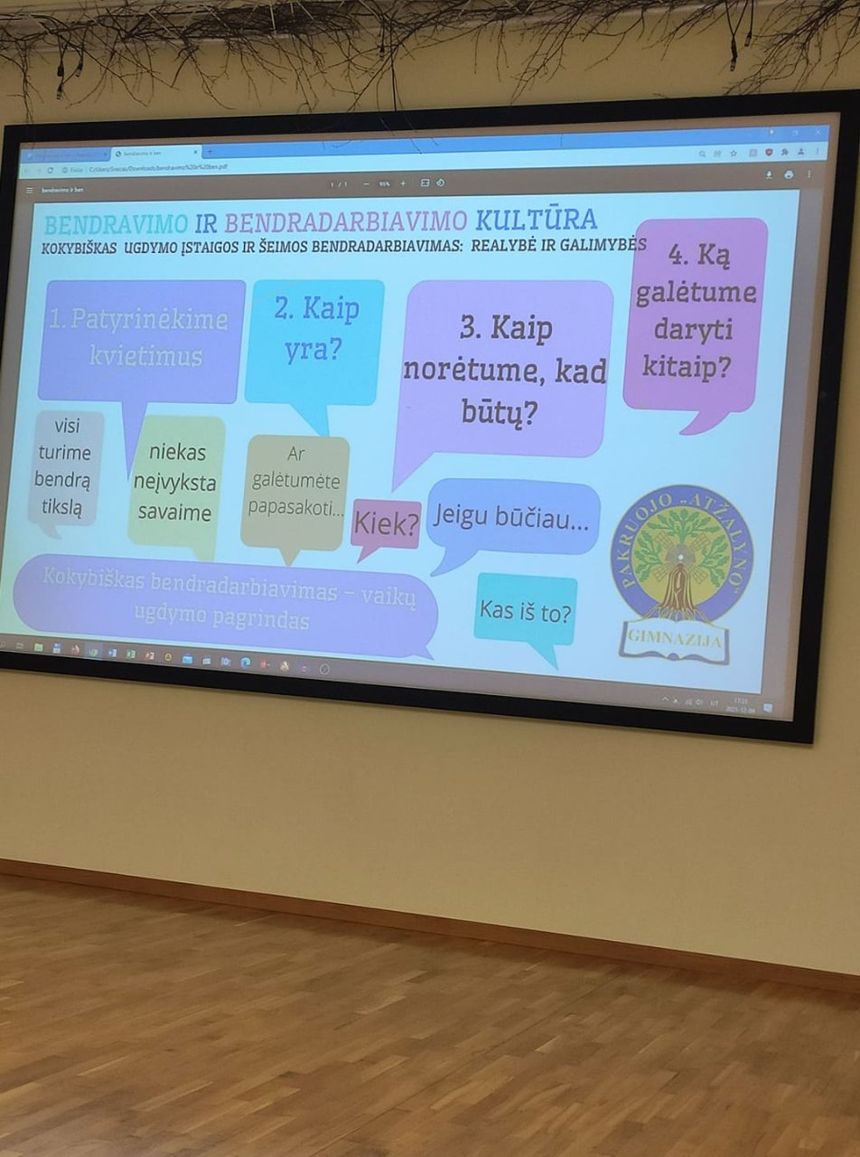 Gruodžio pabaigoje gimnazijoje įvyko apskritojo stalo diskusija „Bendravimo ir bendradarbiavimo kultūra“. Į susitikimą buvo pakviesti gimnazistai, mokinių tėvai ir globėjai, pedagogai, gimnazijos administracija. Nors buvo vėlyvas metas, susirinkusieji turėjo daug ką aptarti. Gyvas pokalbis džiugino nuomonių ir idėjų gausa.